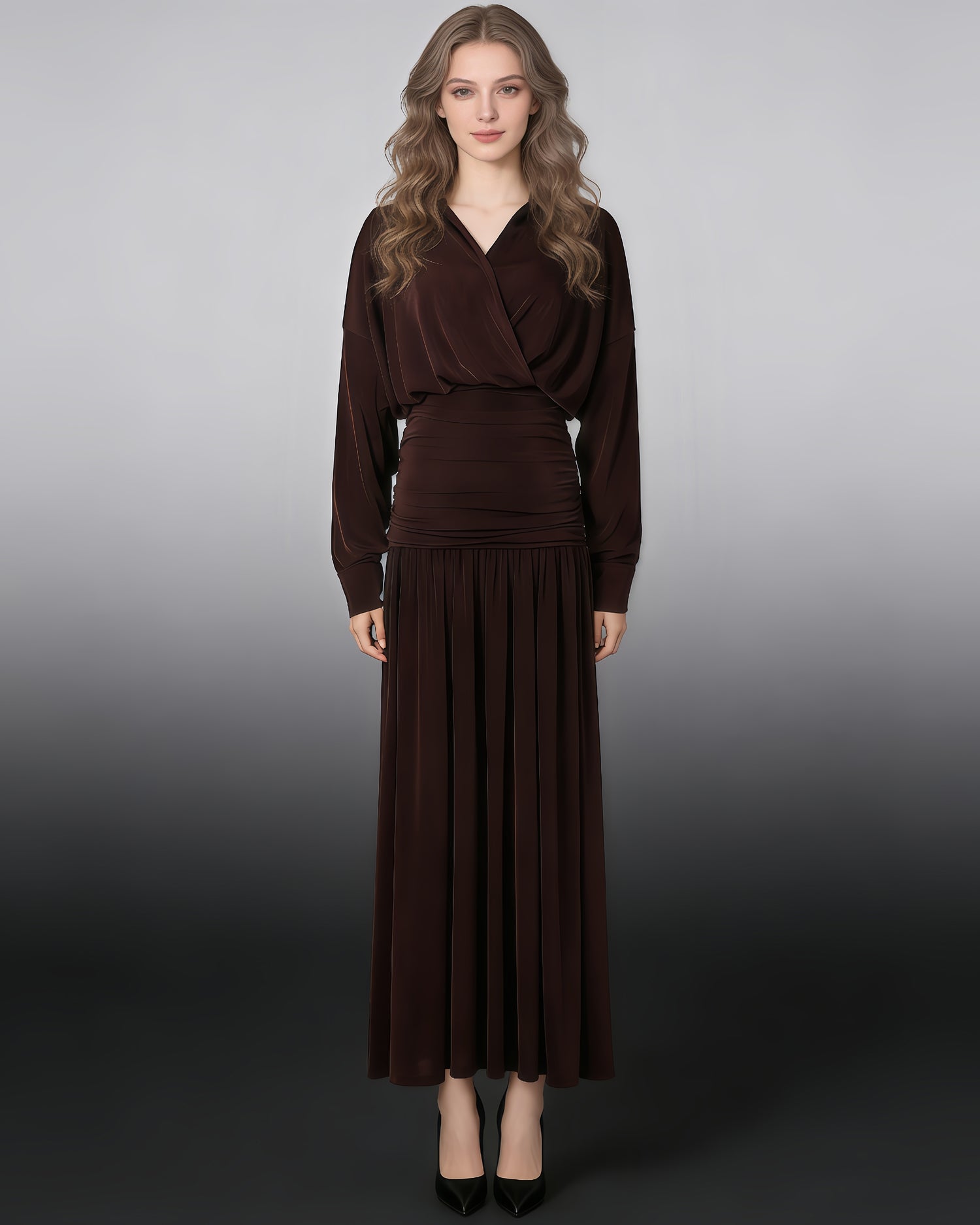 The sleek, floor-grazing cut + structured cape overlay create a bold, modern silhouette—equal parts dramatic and refined, perfect for making a quiet-luxury statement at events or upscale outings.