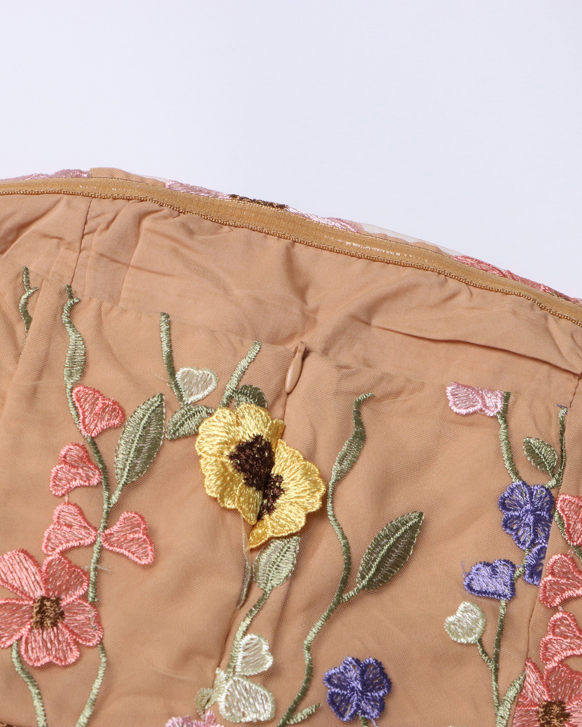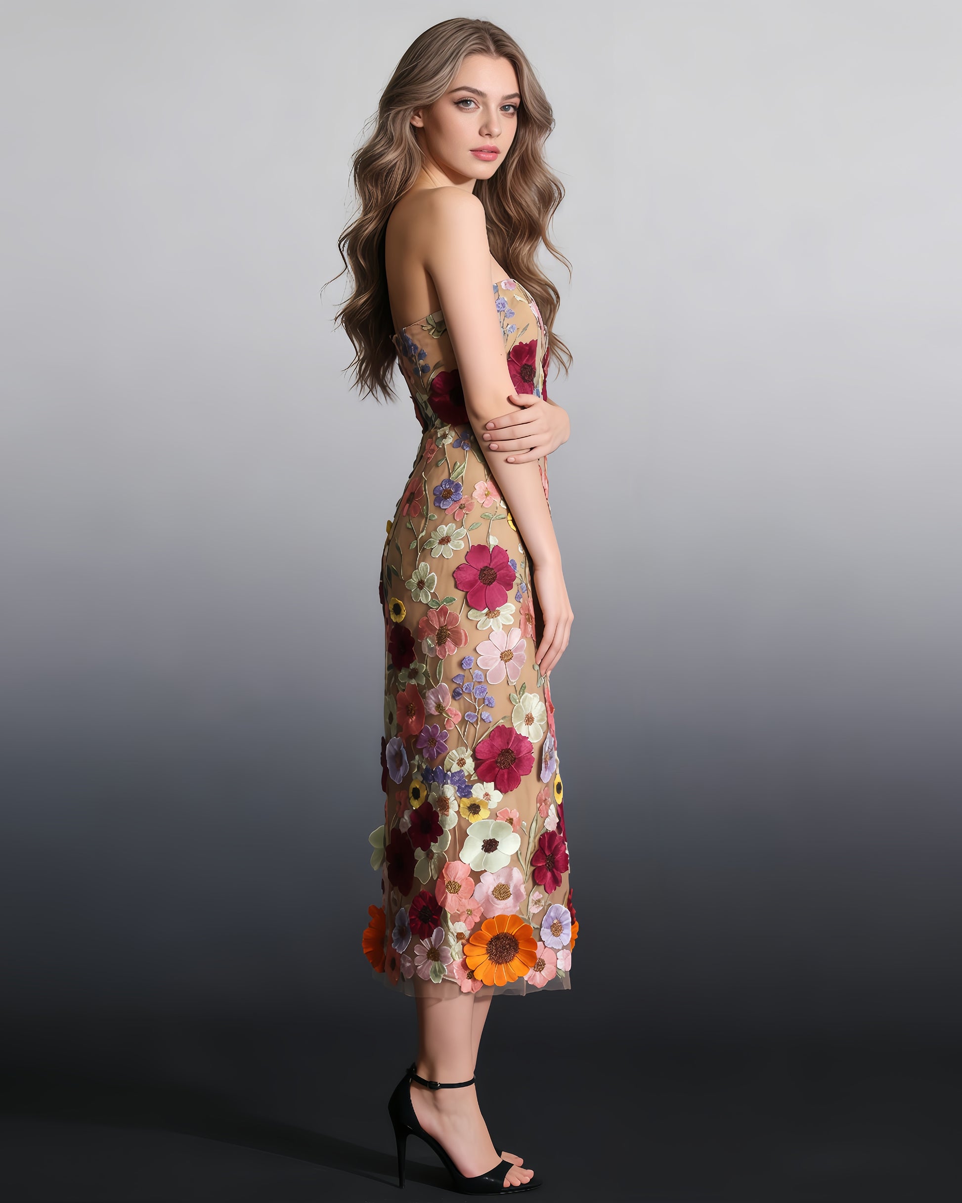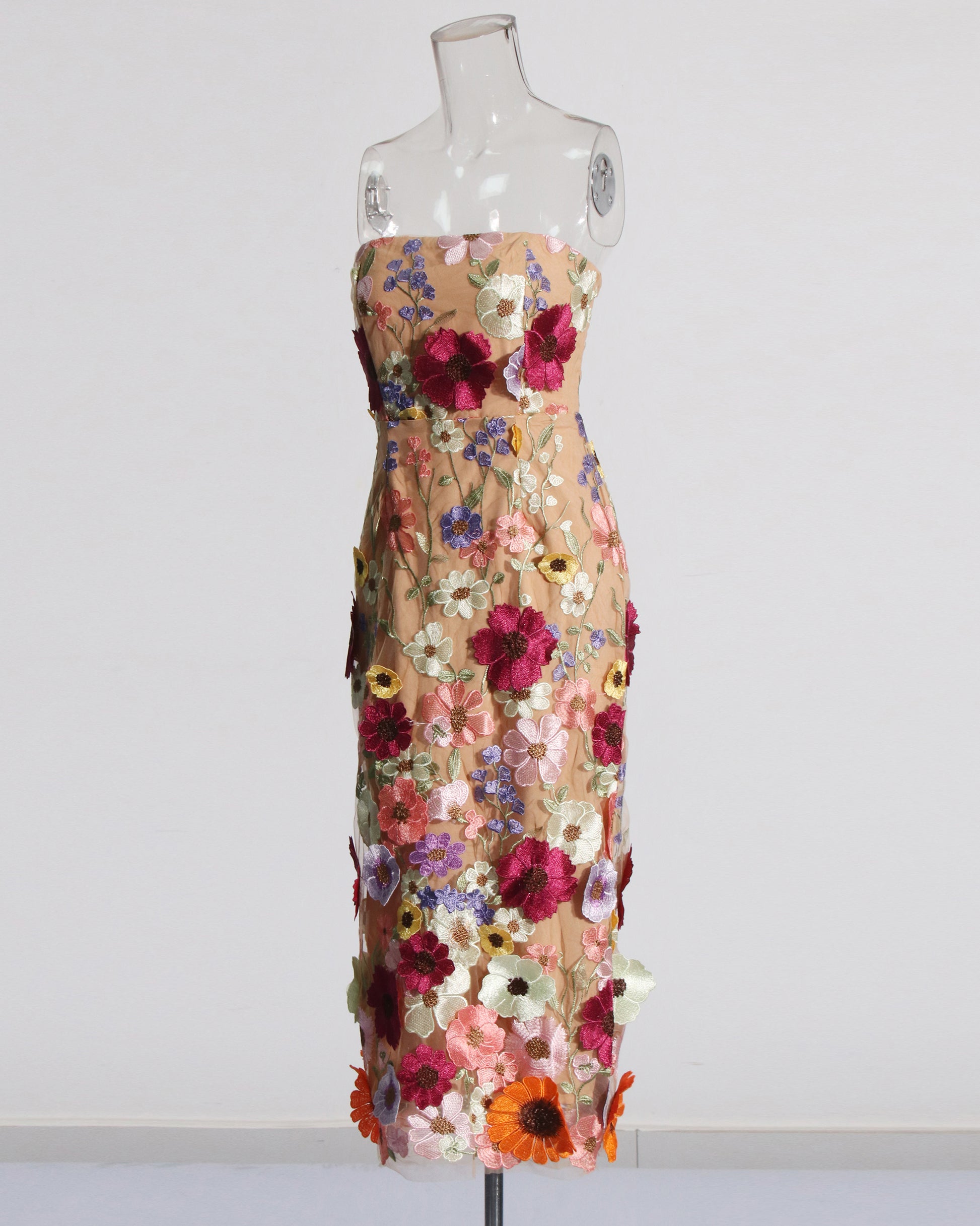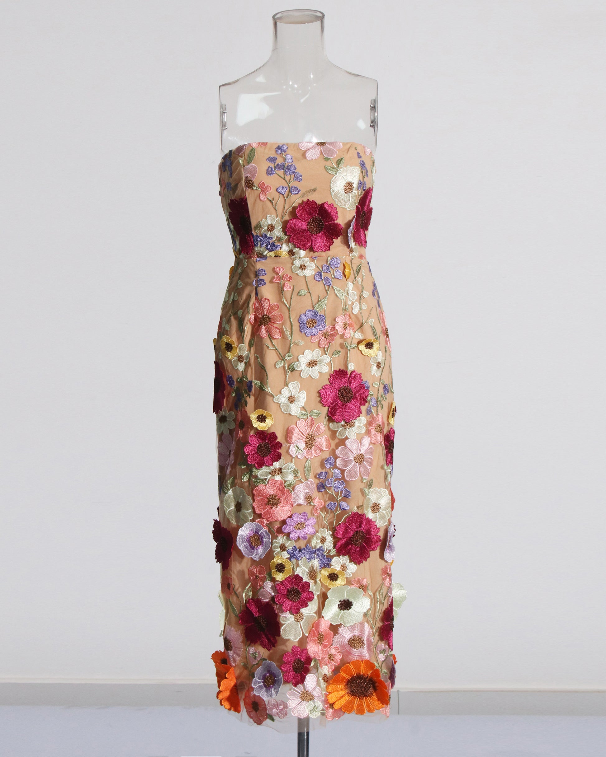 Apricot Strapless Floral Embroidered Midi Dress