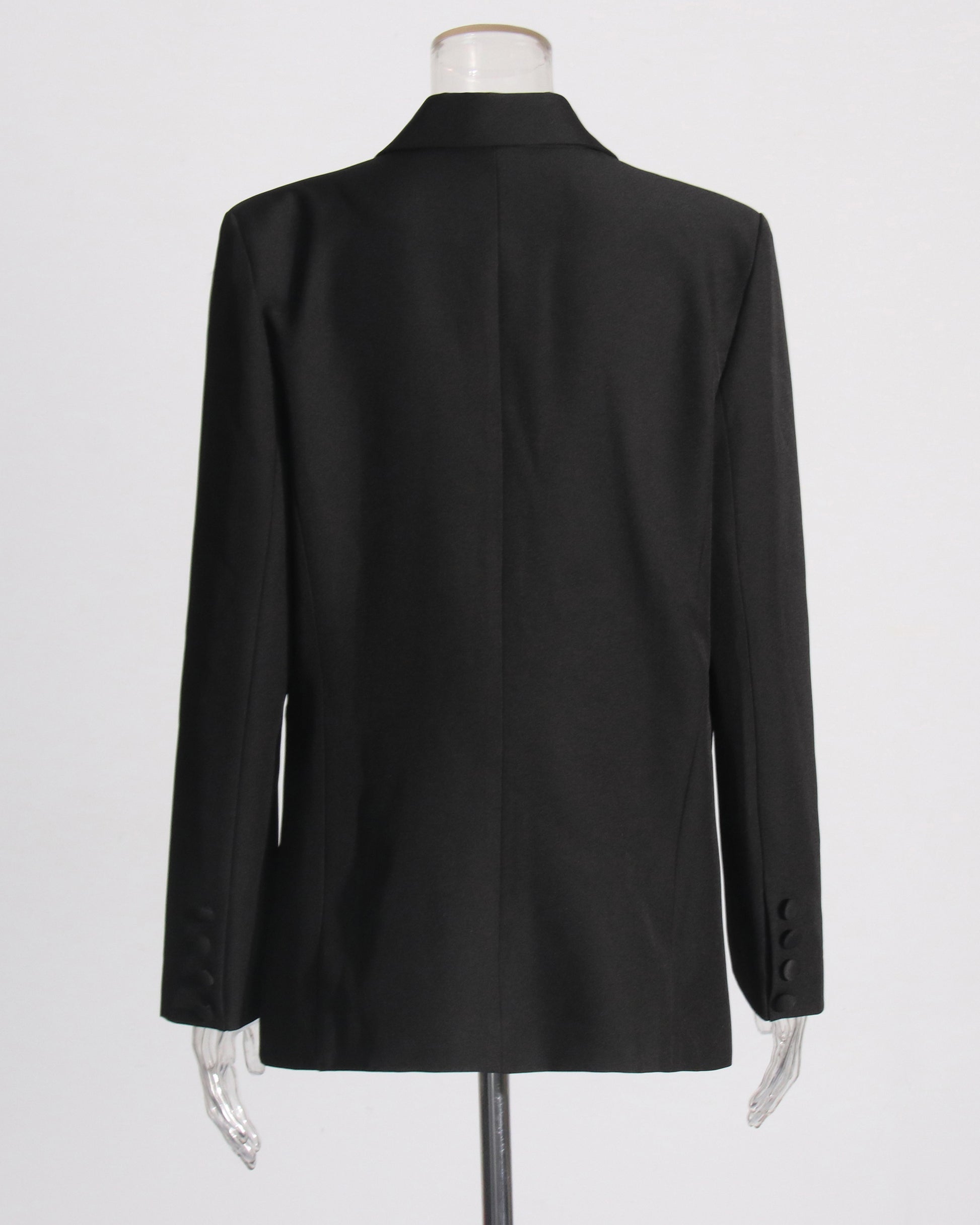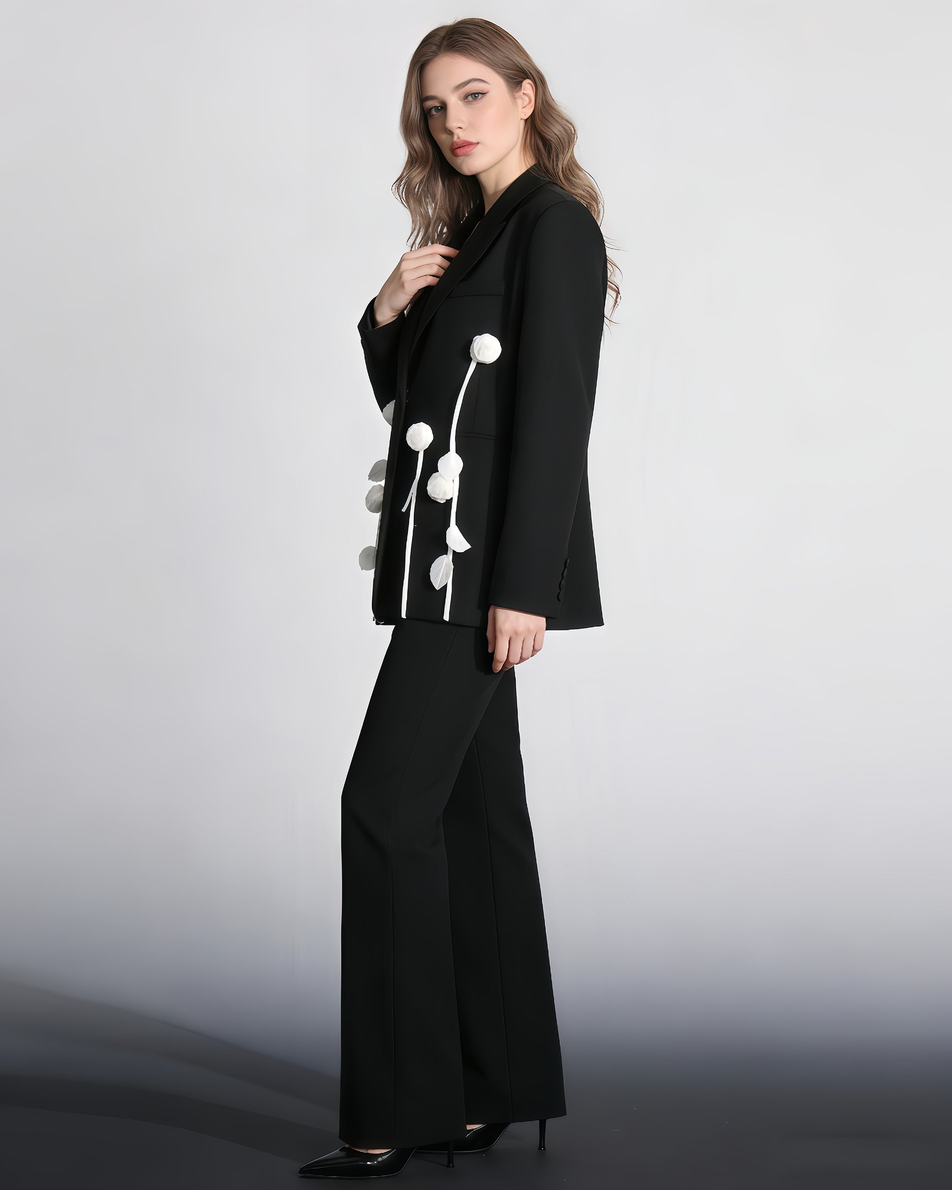 A bold black blazer: 3D white floral appliqués + relaxed fit + two-button closure.