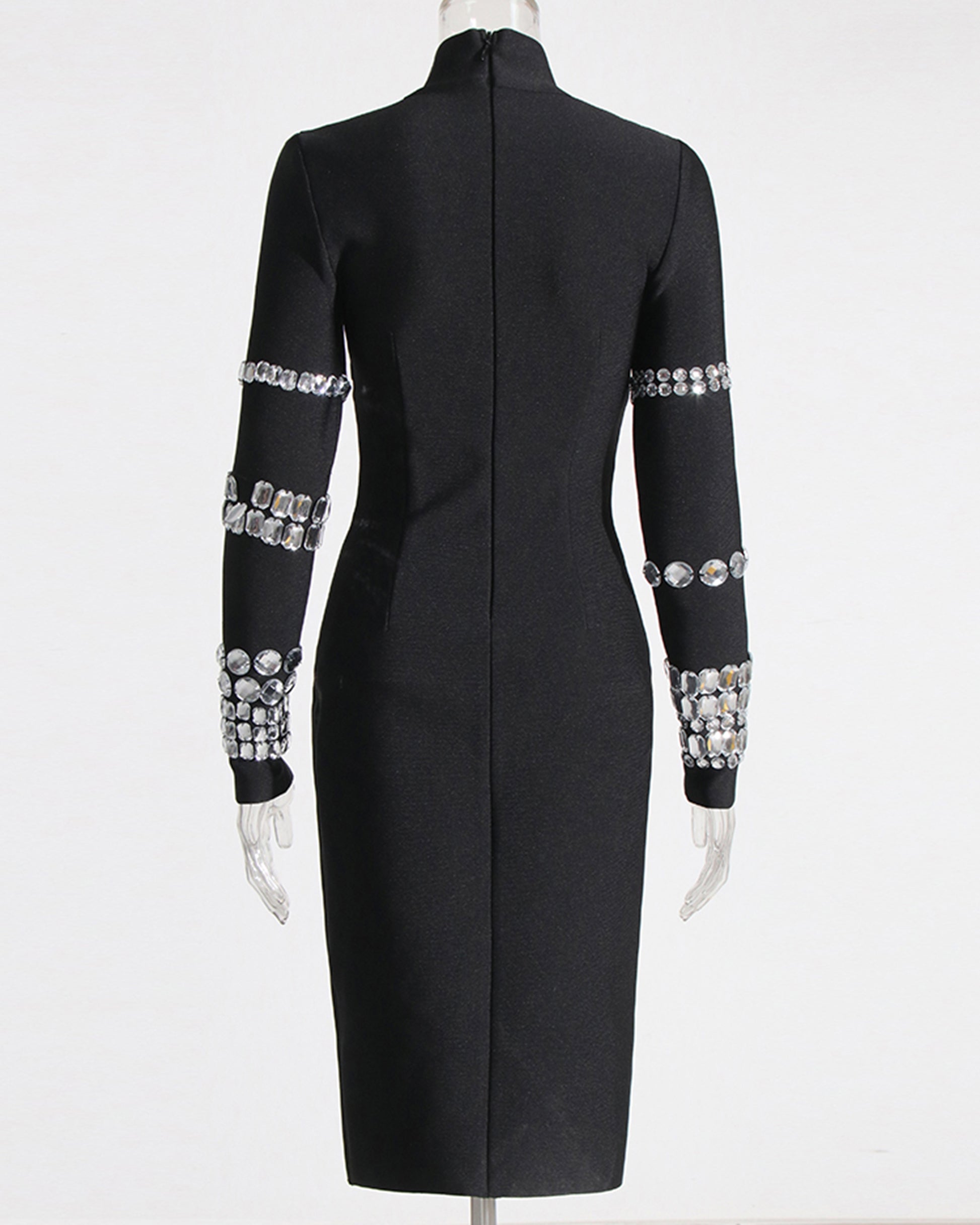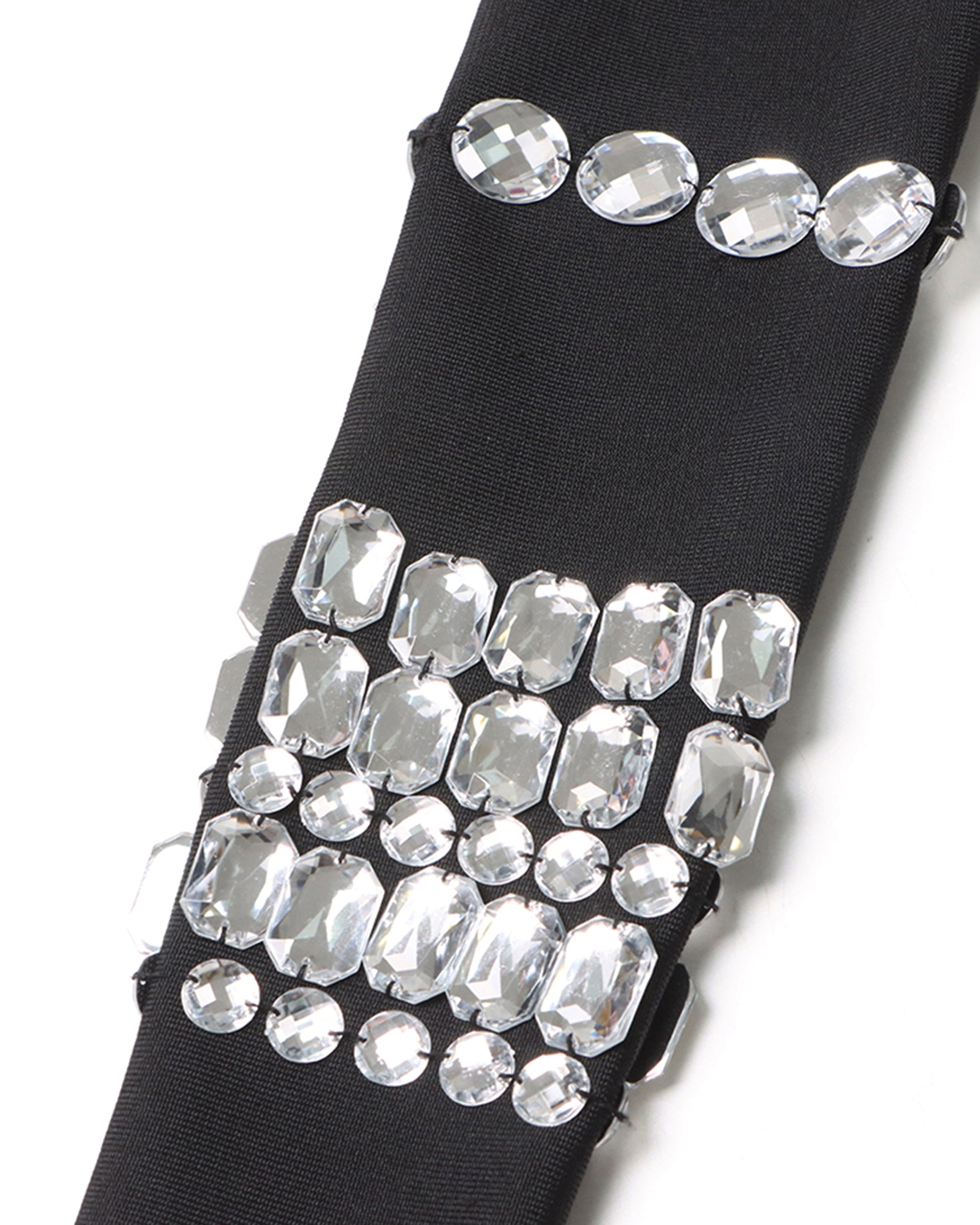 - Sophisticated, glamorous silhouette, blending structured fabric and sparkling details.