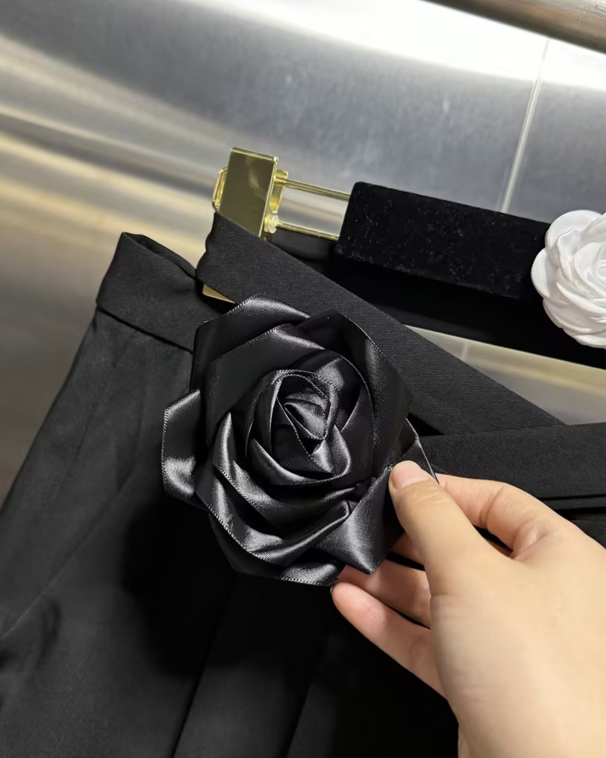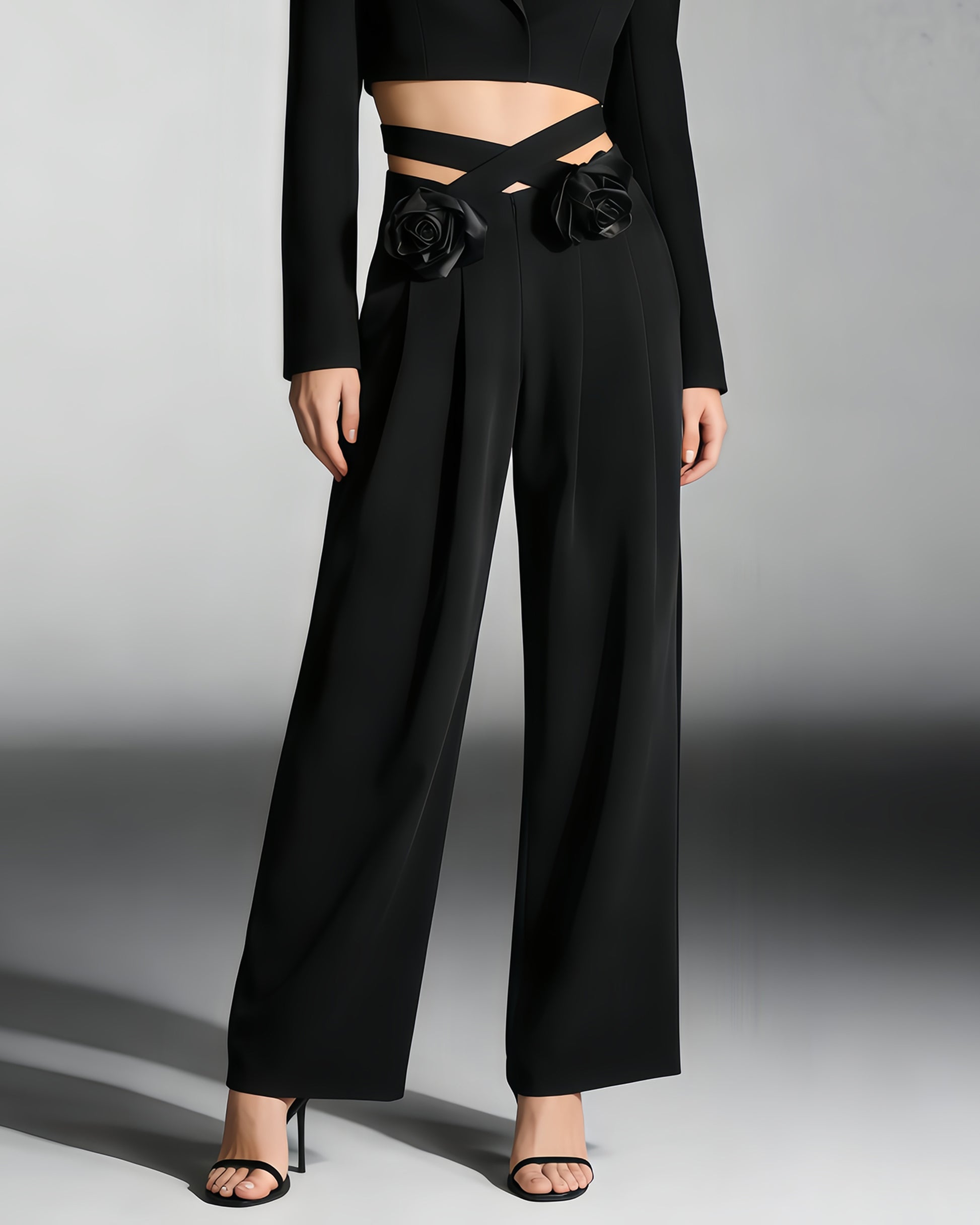 - Polished, feminine silhouette, blending smooth fabric and delicate floral accents.