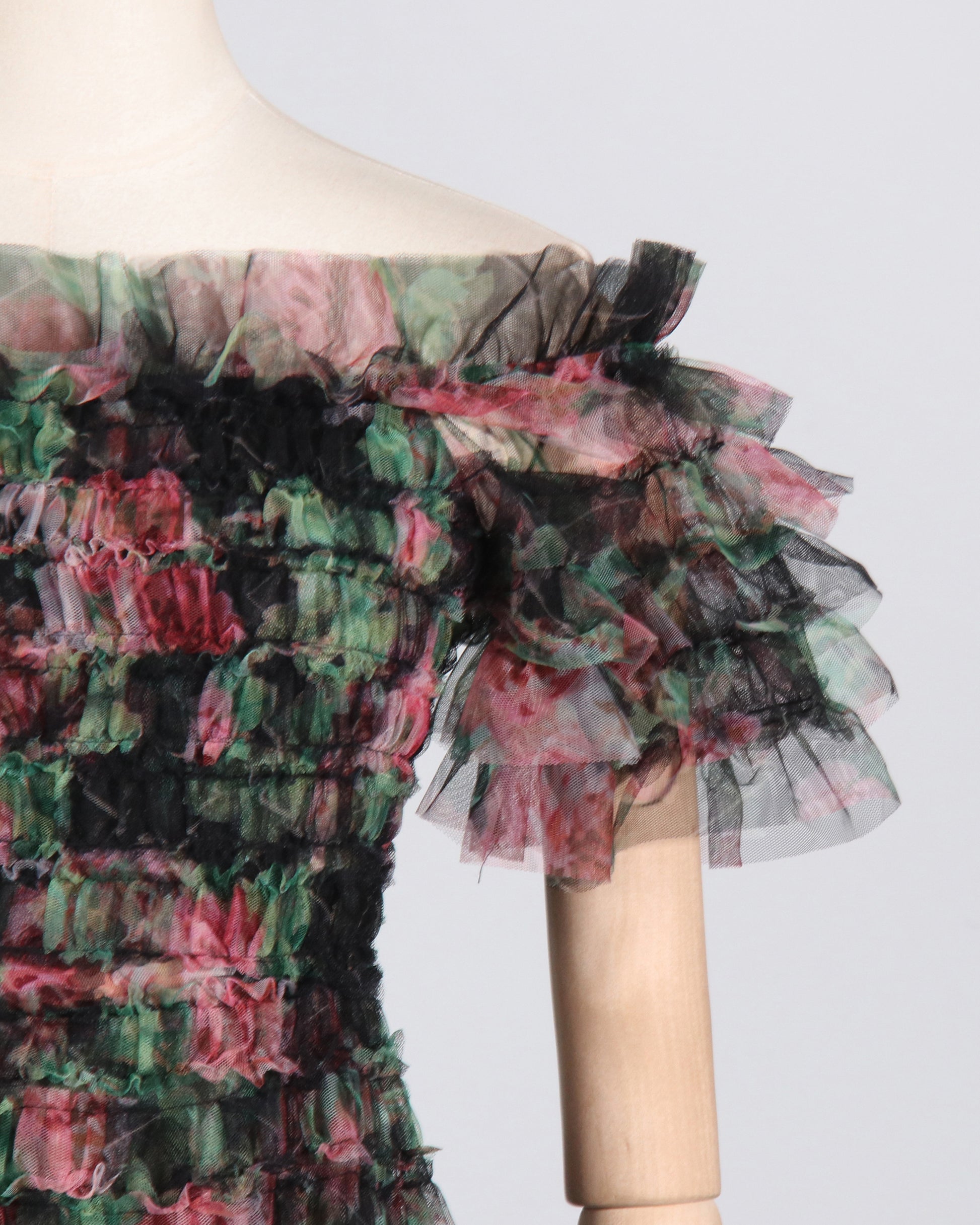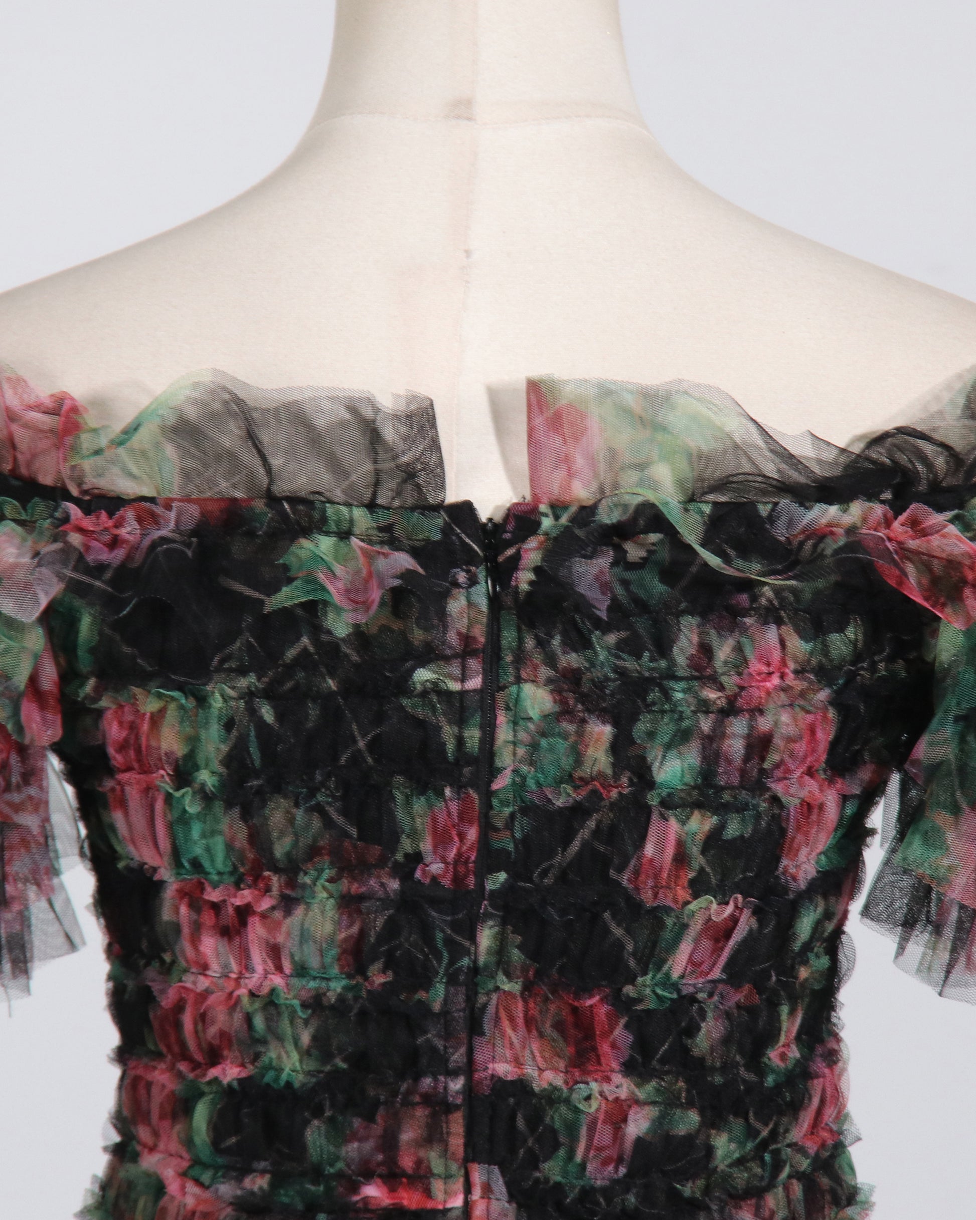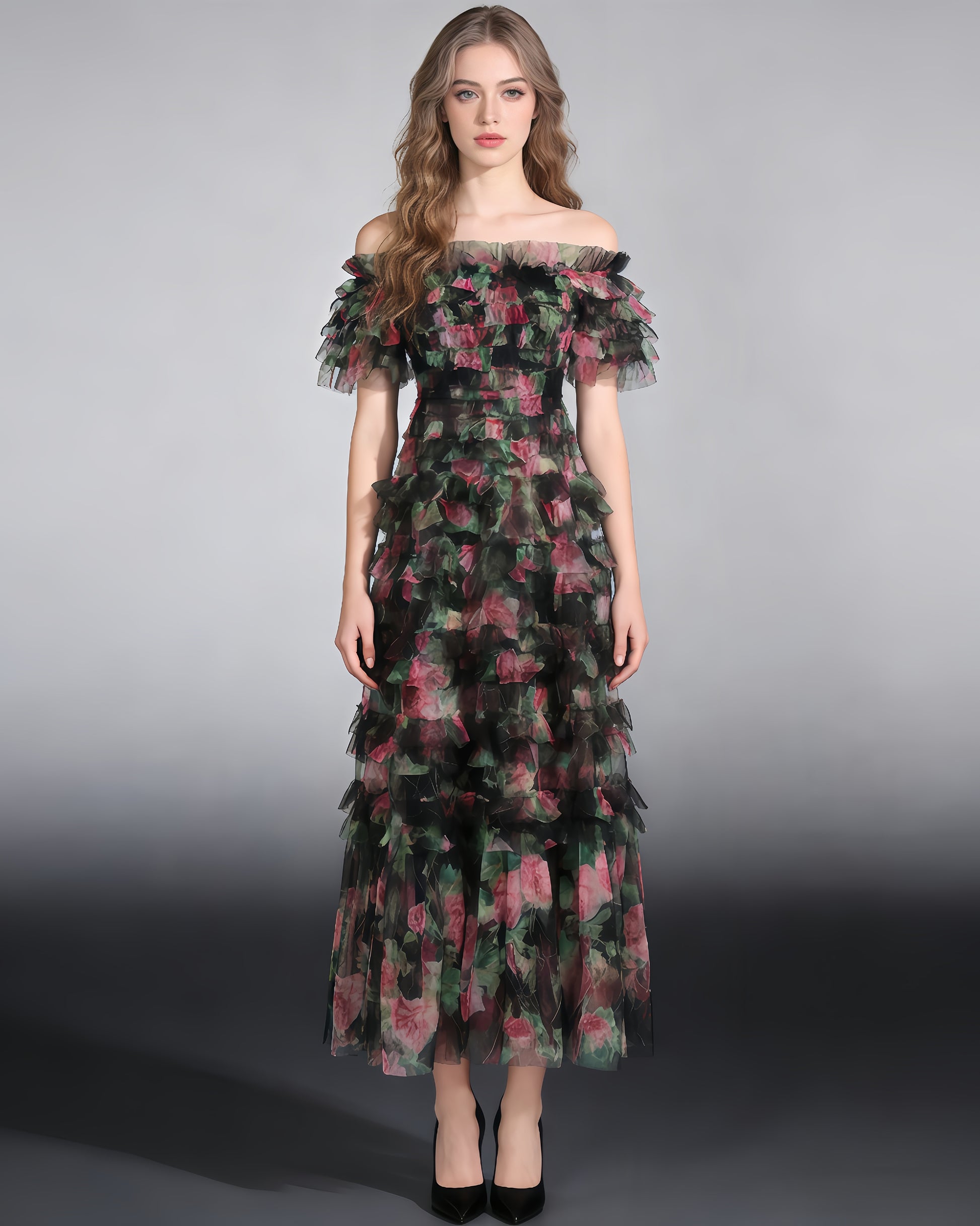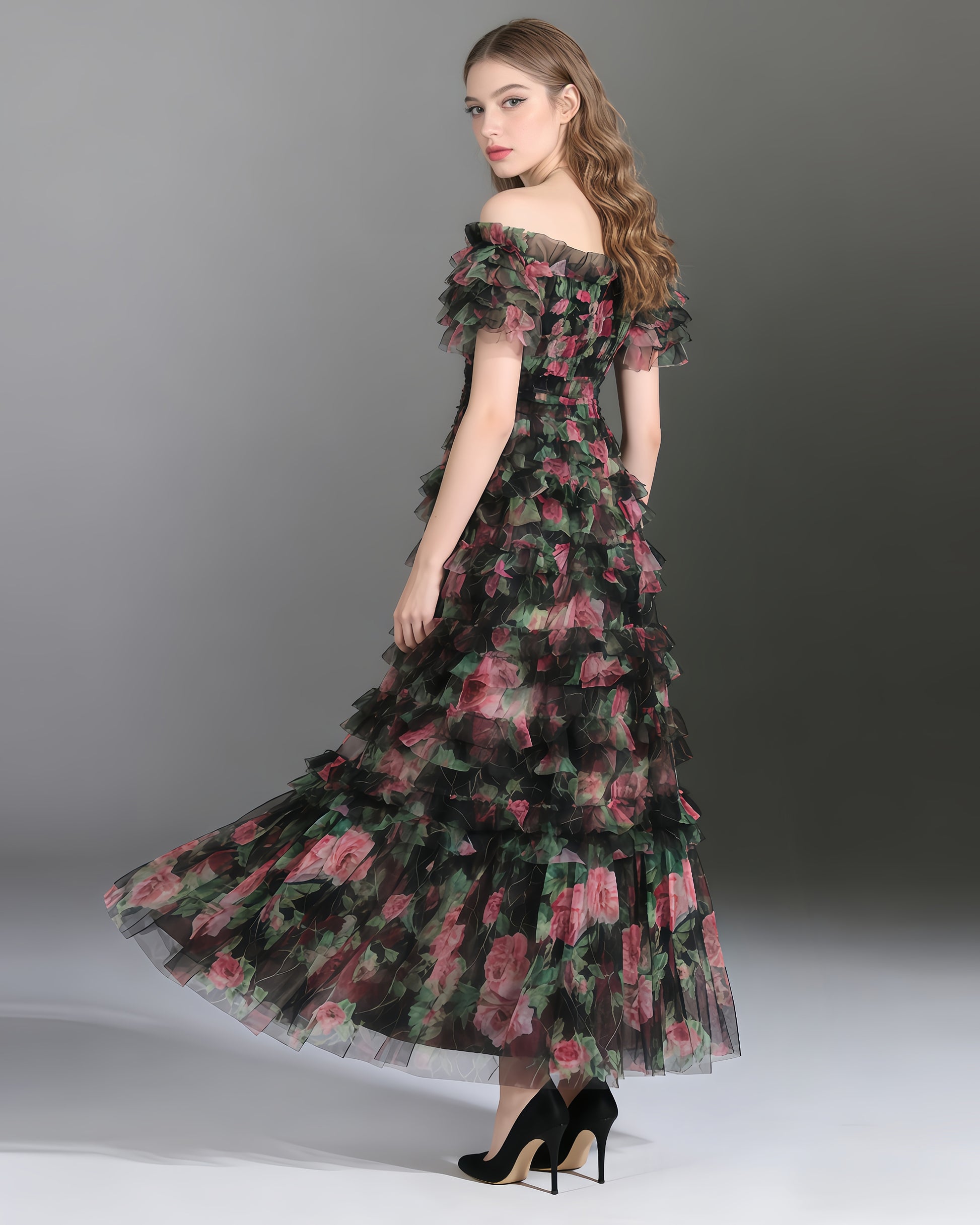 Black Floral Off-Shoulder Ruffled Tulle Maxi Dress