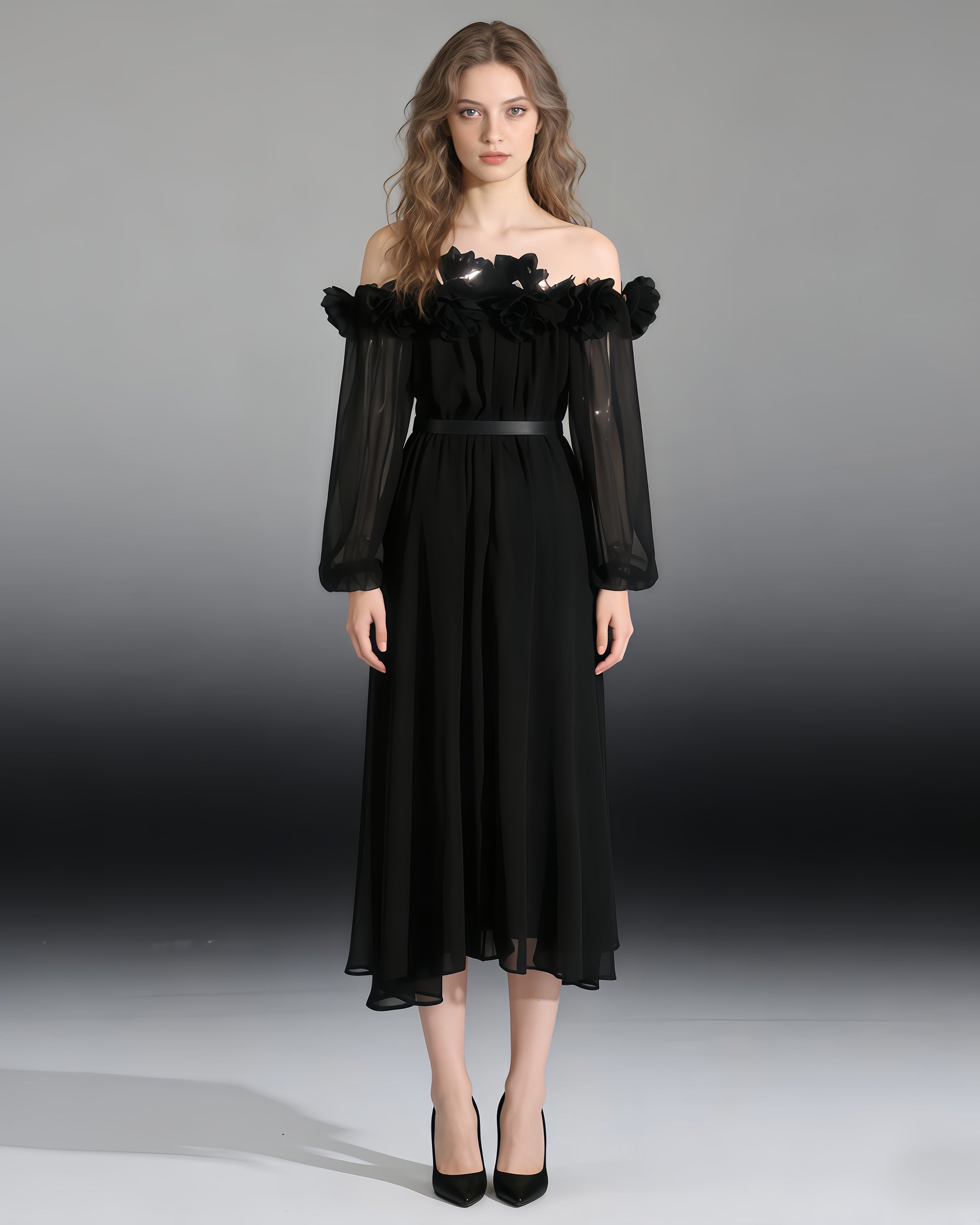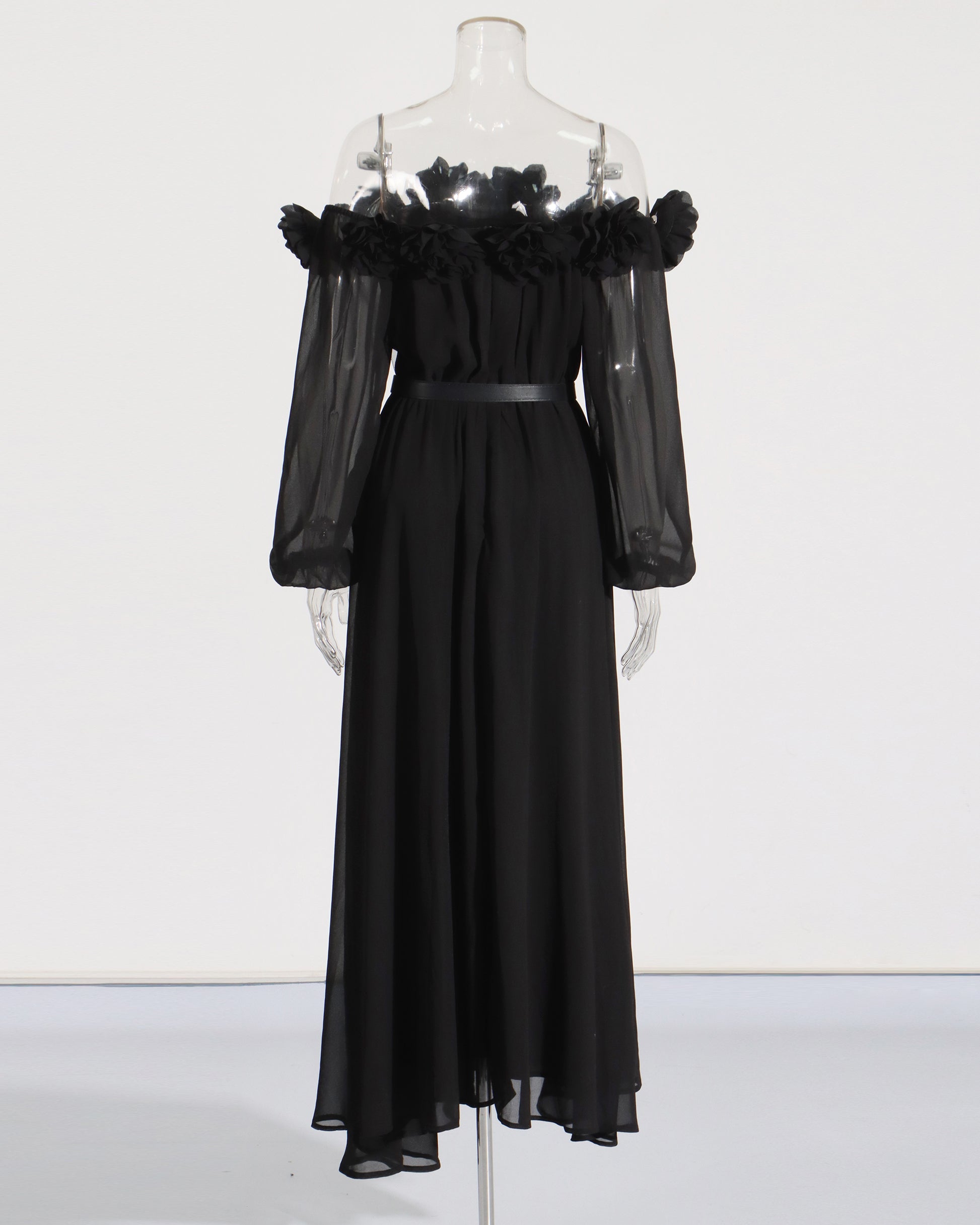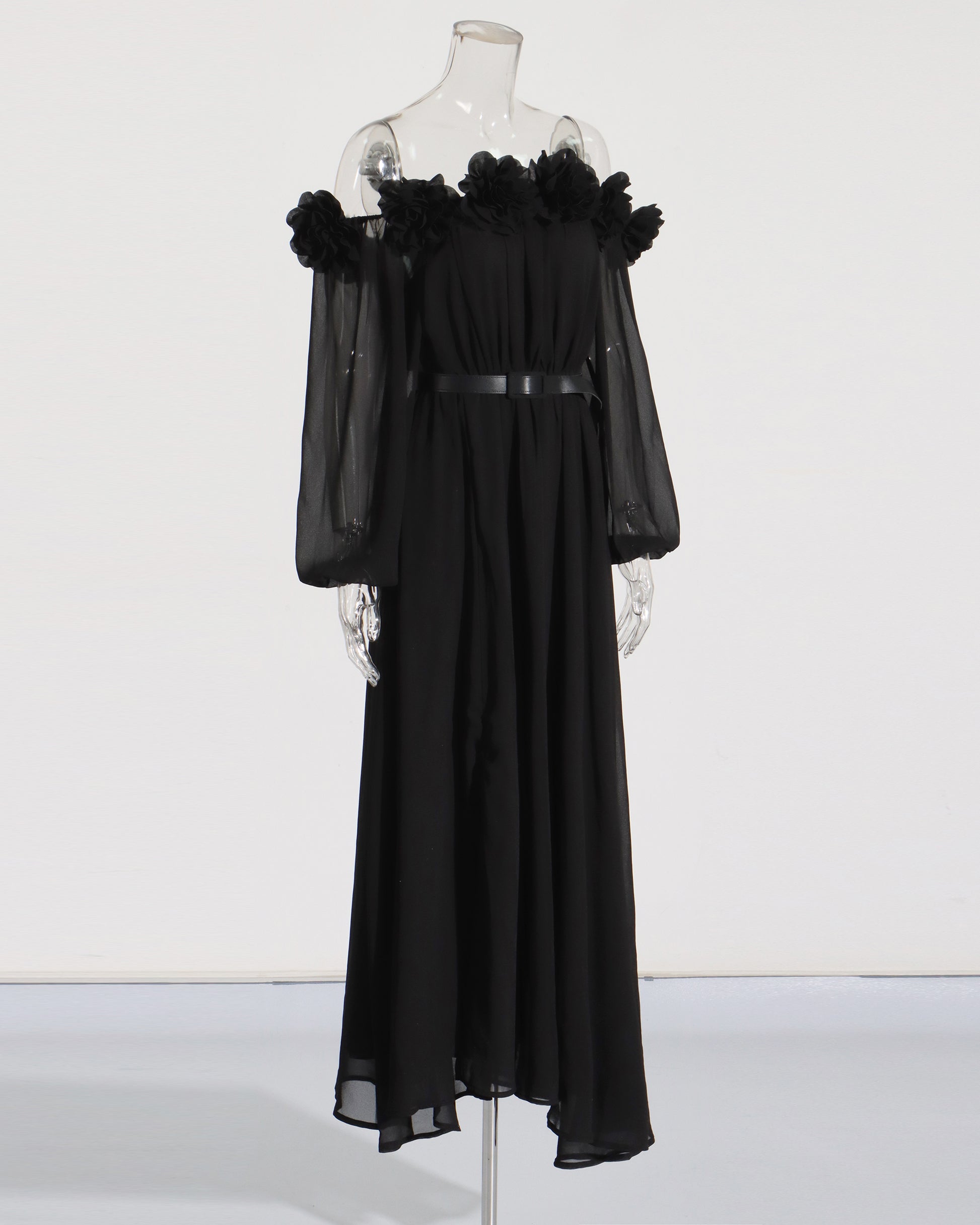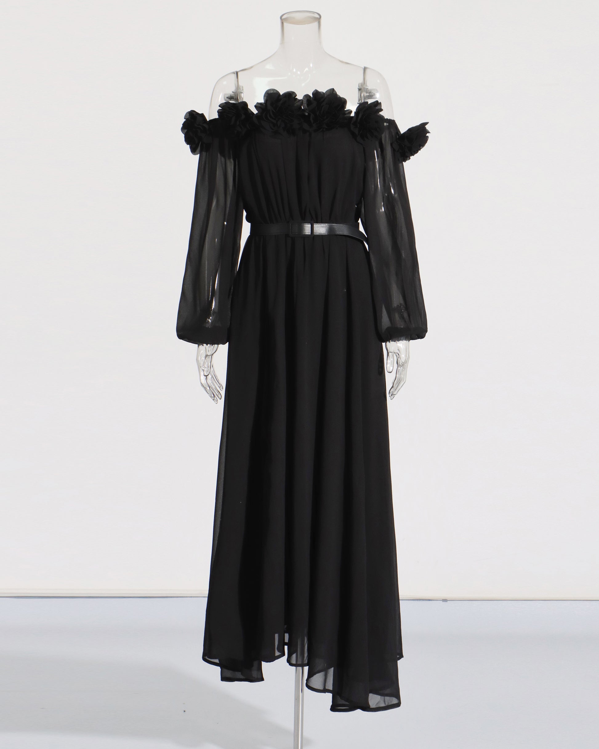 - Soft, dreamy silhouette, flowing chiffon fabric and a waist-defining belt.