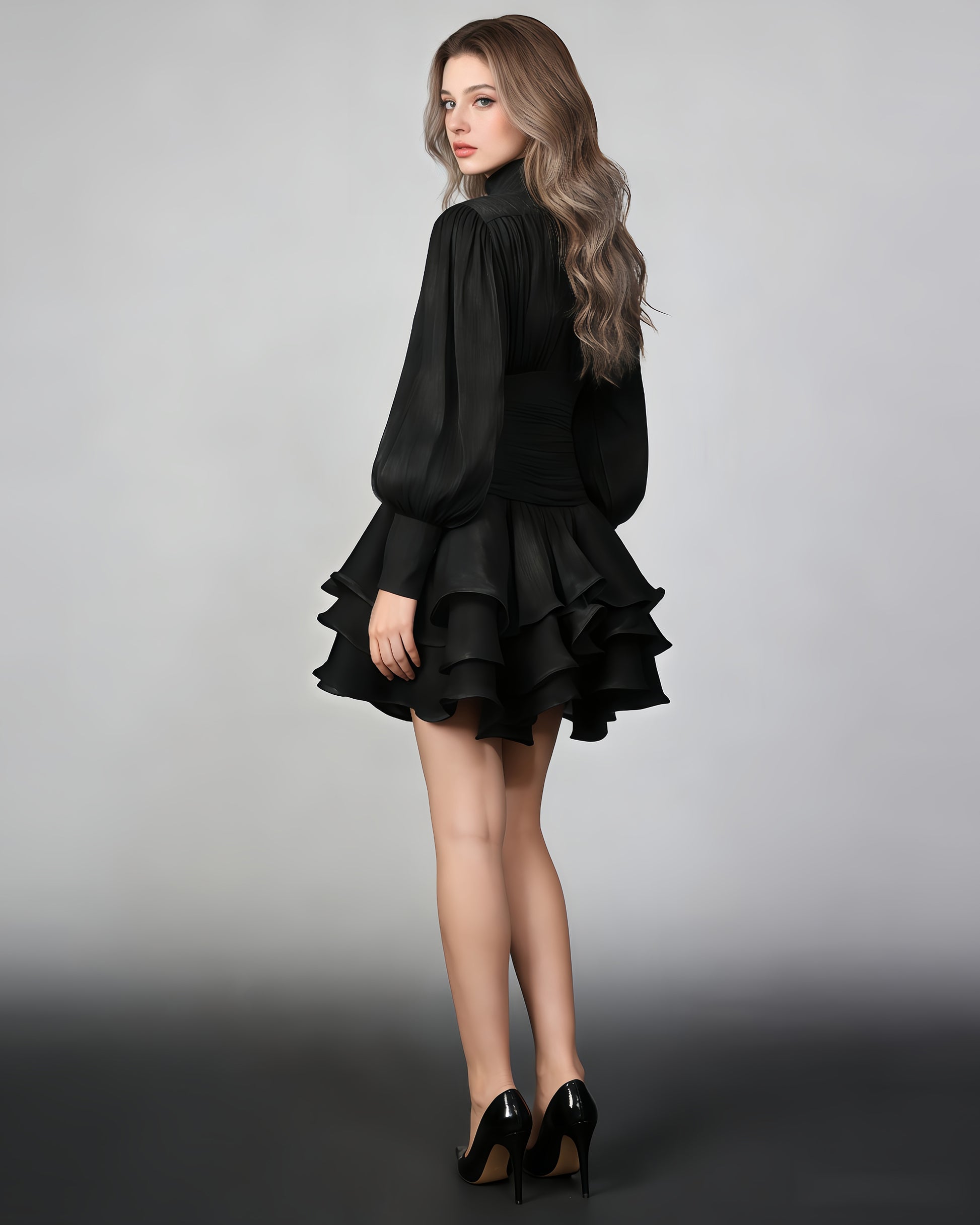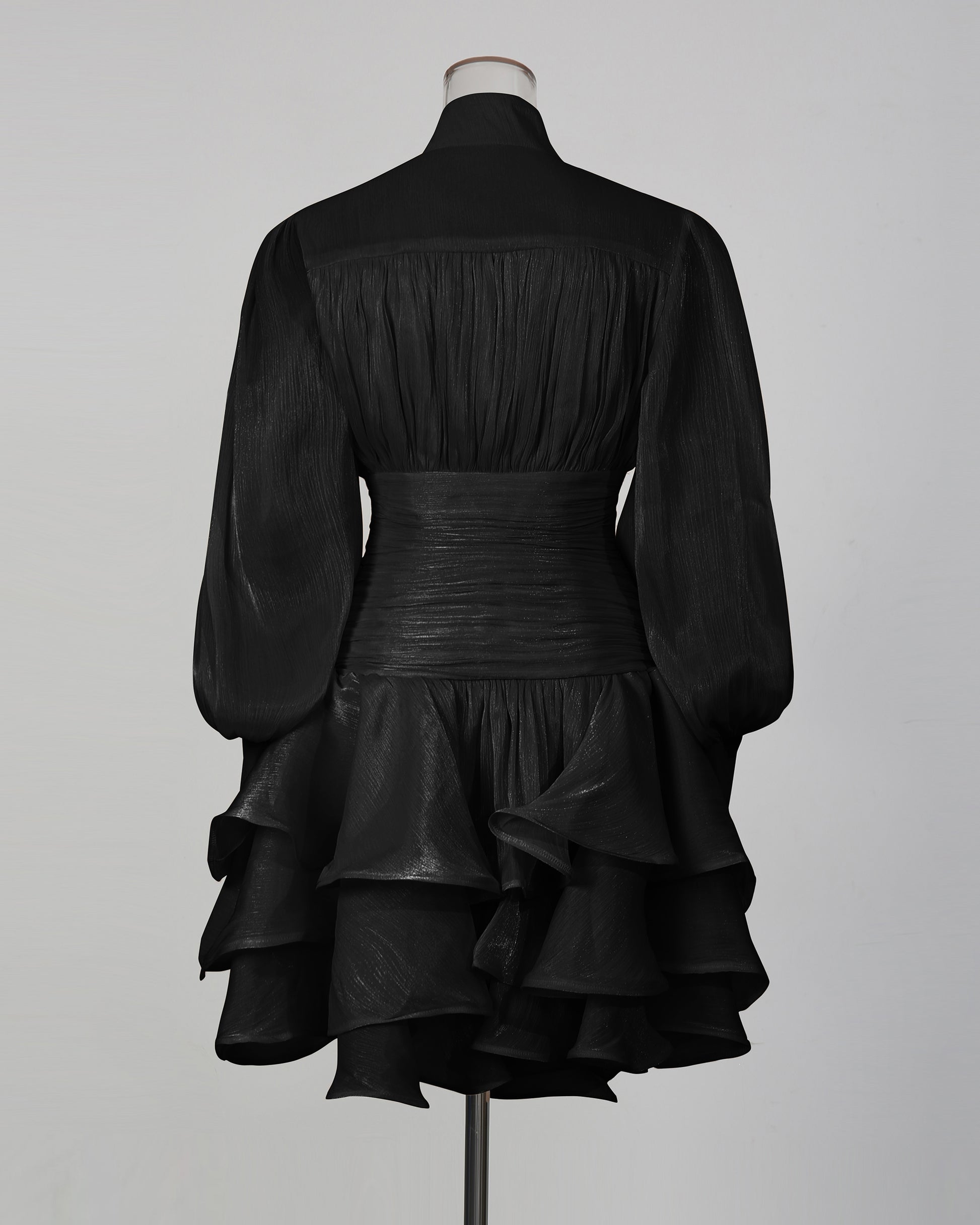 Black Shimmer Puff Sleeve Ruffled Mini Dress