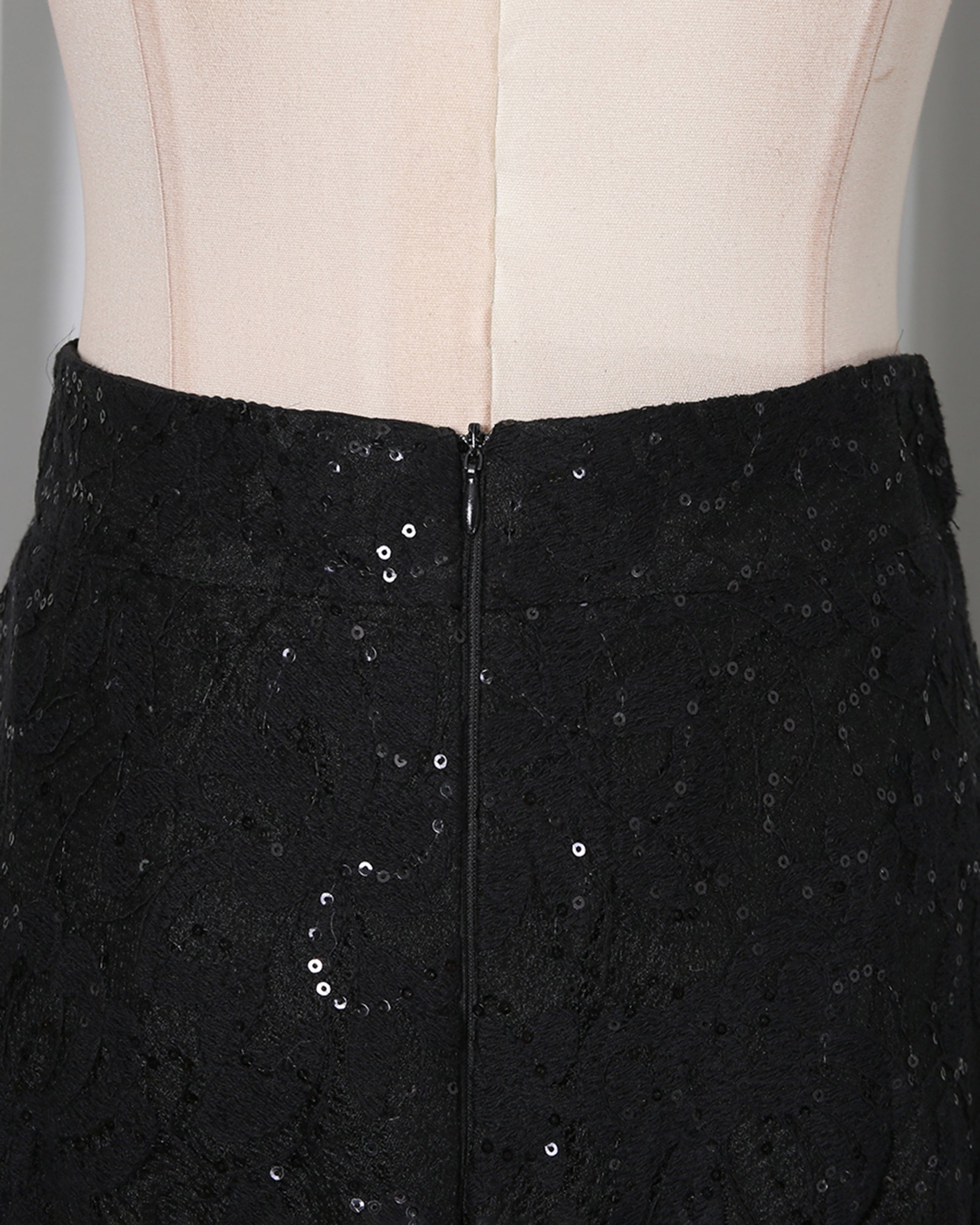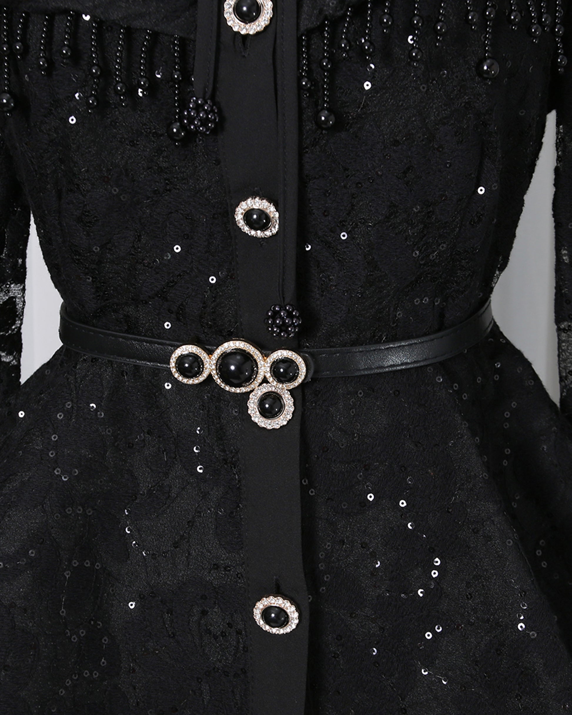 - Dramatic, feminine silhouette, blending delicate lace and eye-catching glitter details.