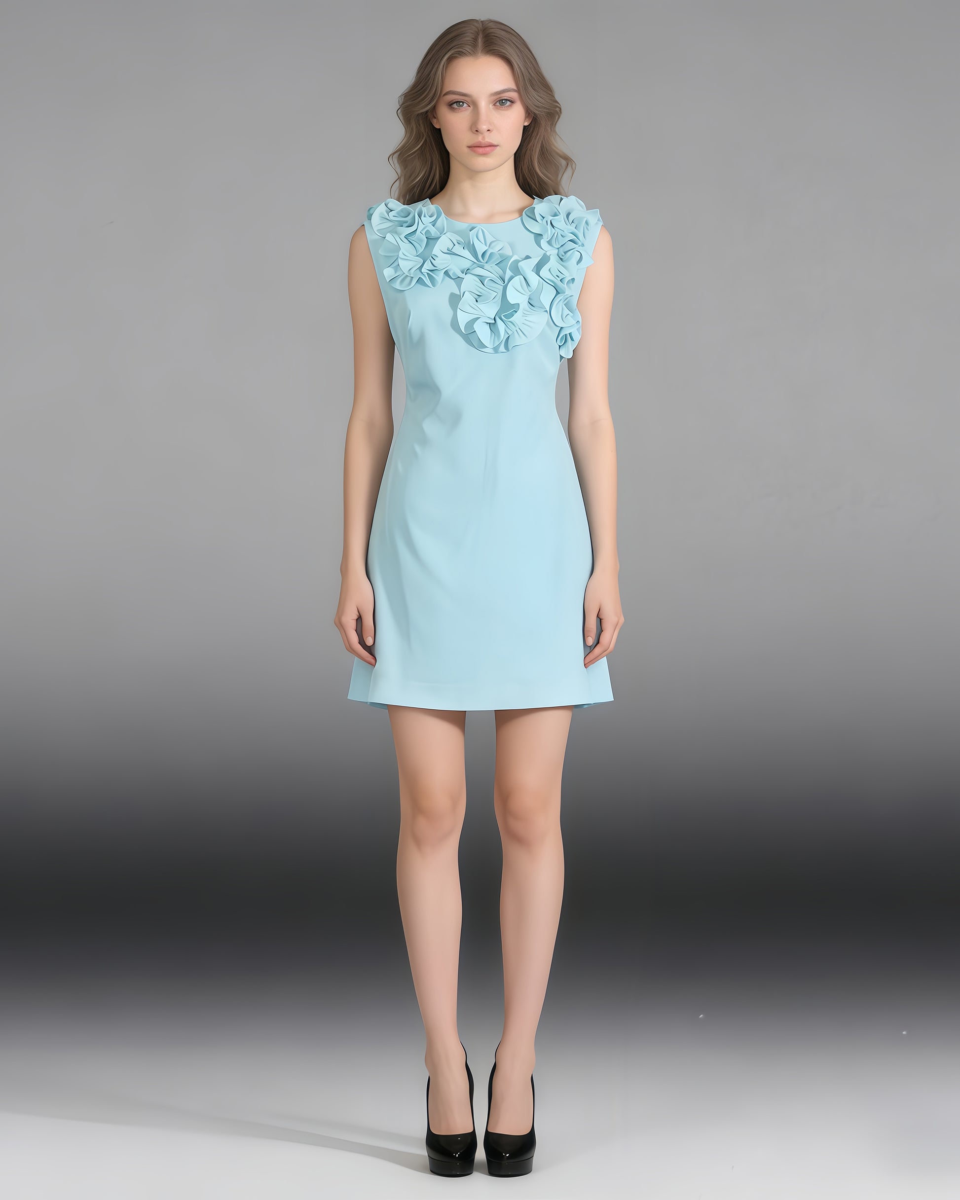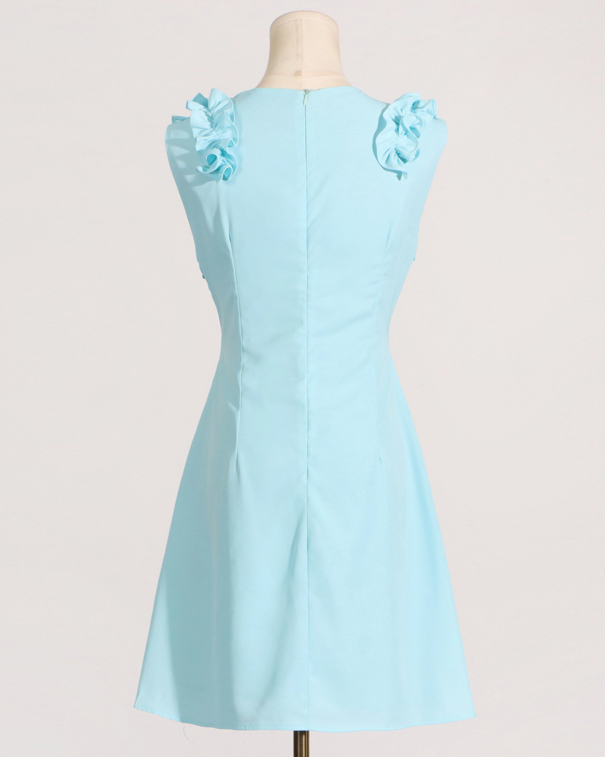 A sweet mini dress: 3D floral ruffle neckline + sleeveless design + A-line silhouette.