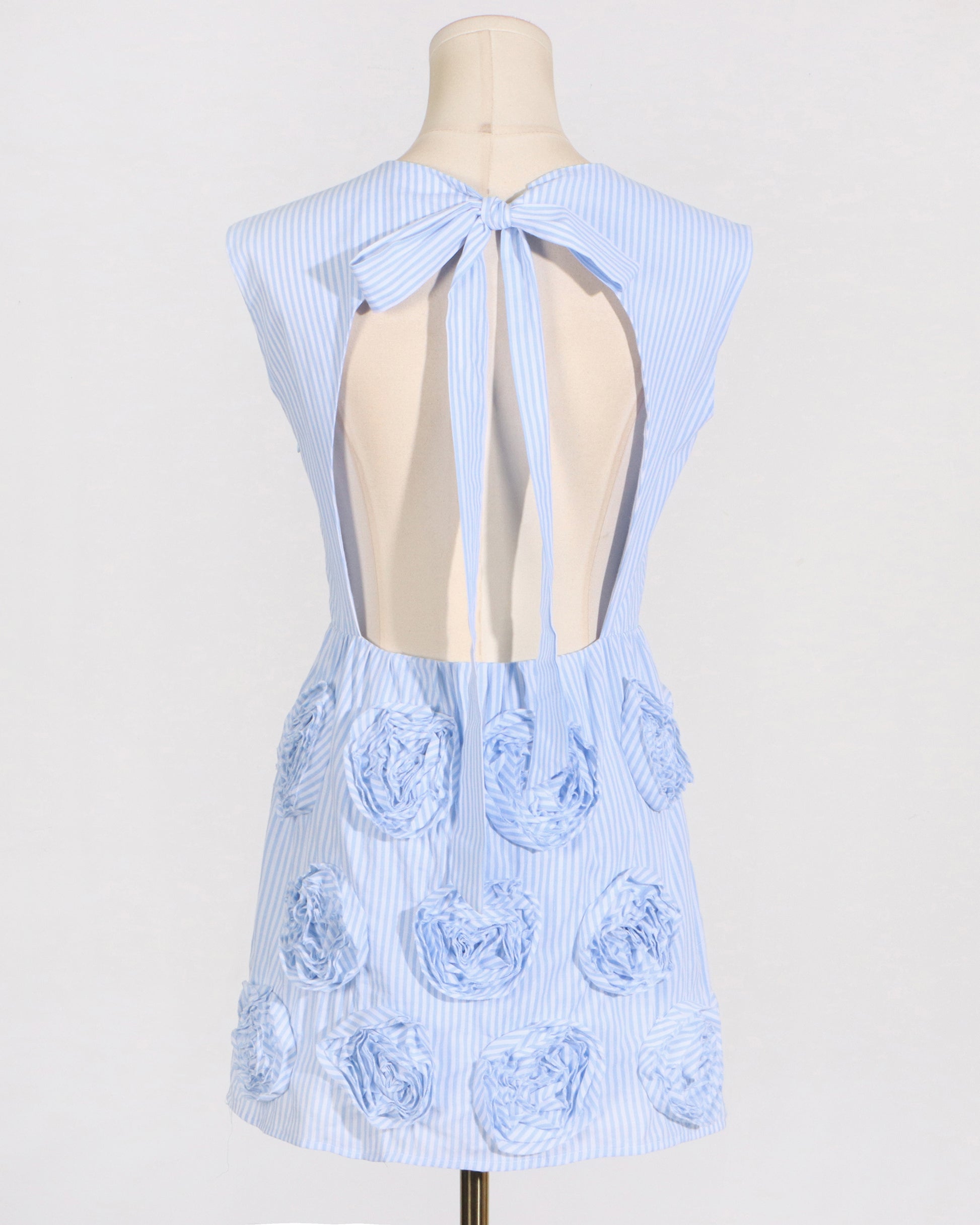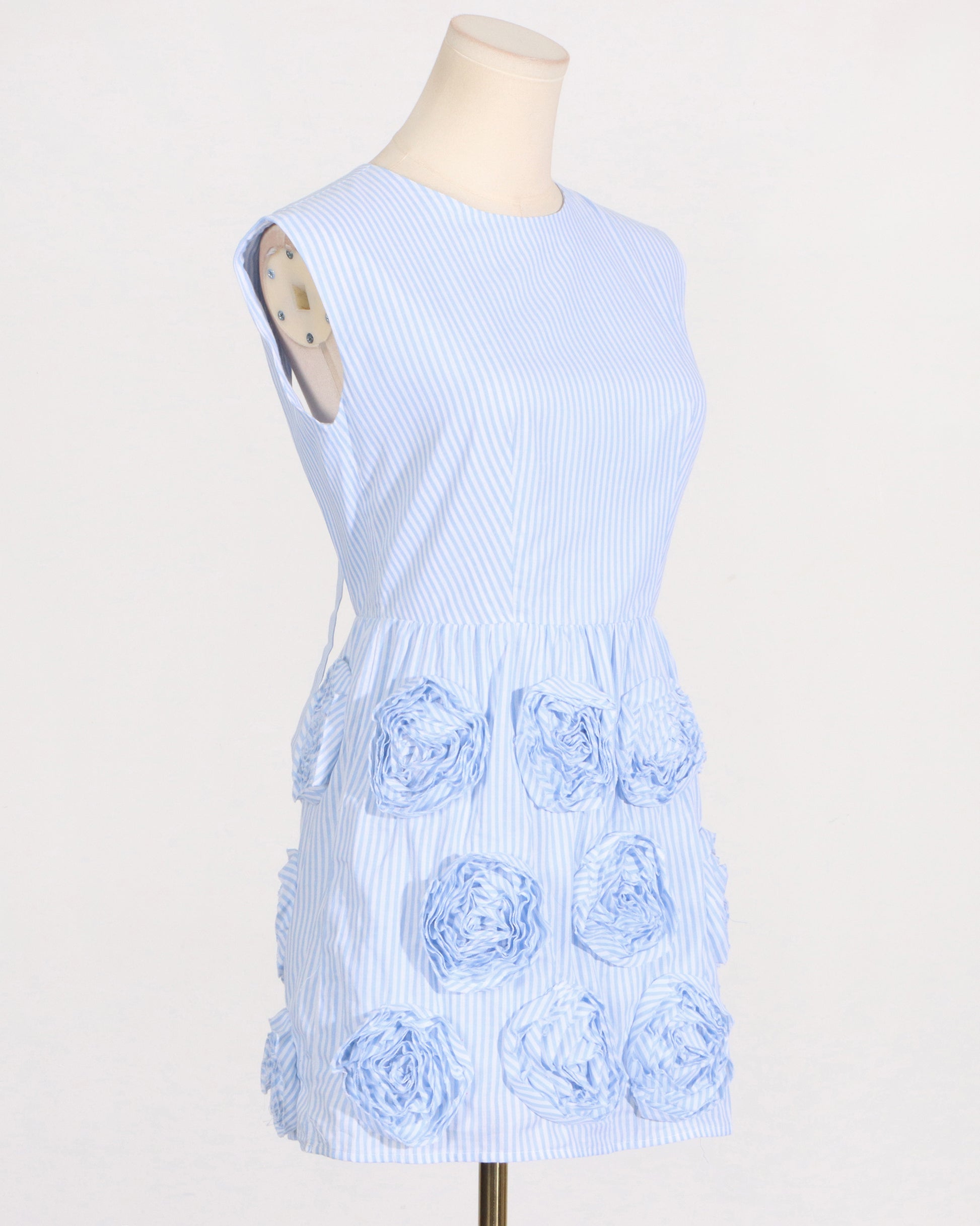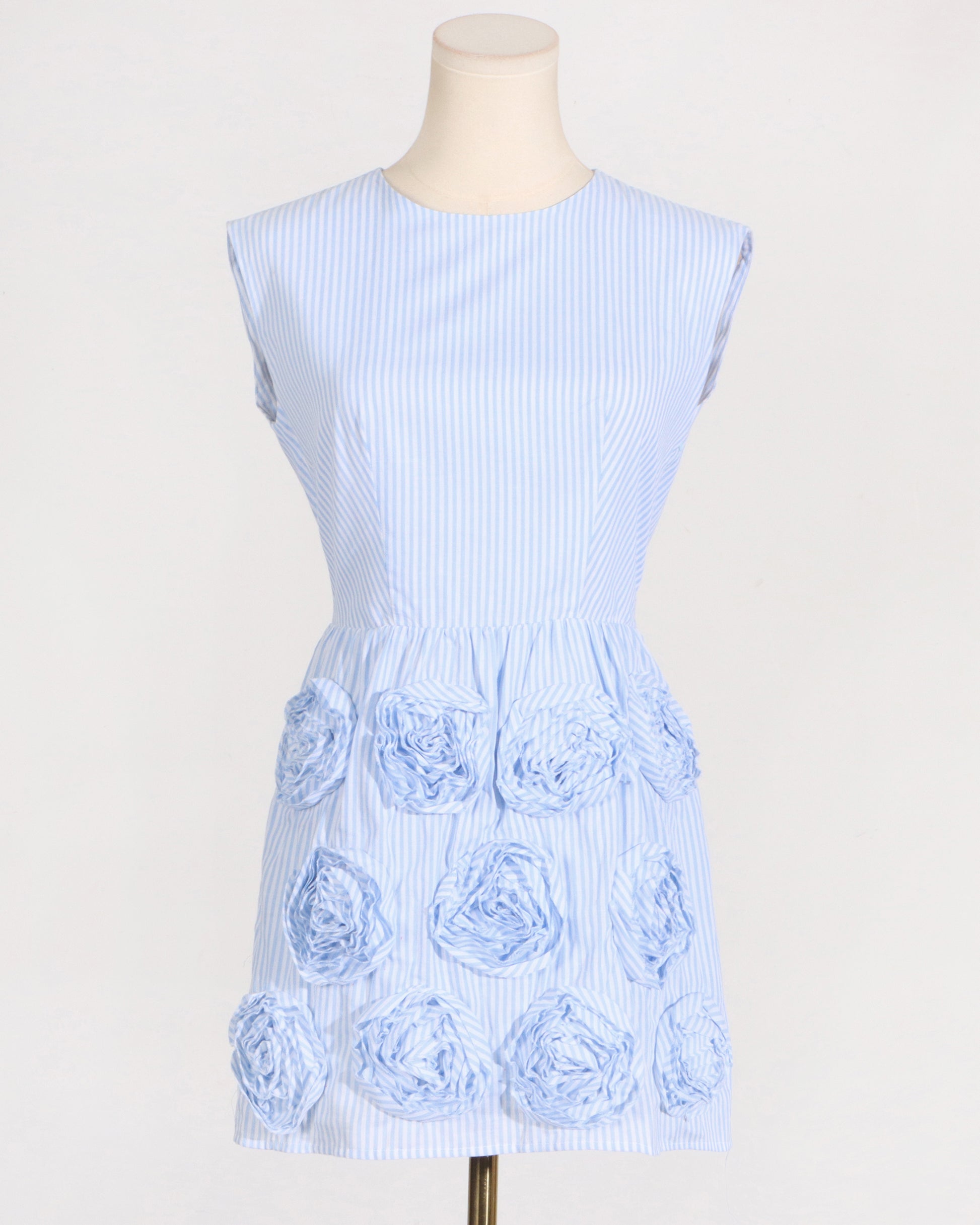 - Fresh, feminine silhouette, blending crisp cotton stripes and soft rosette details.