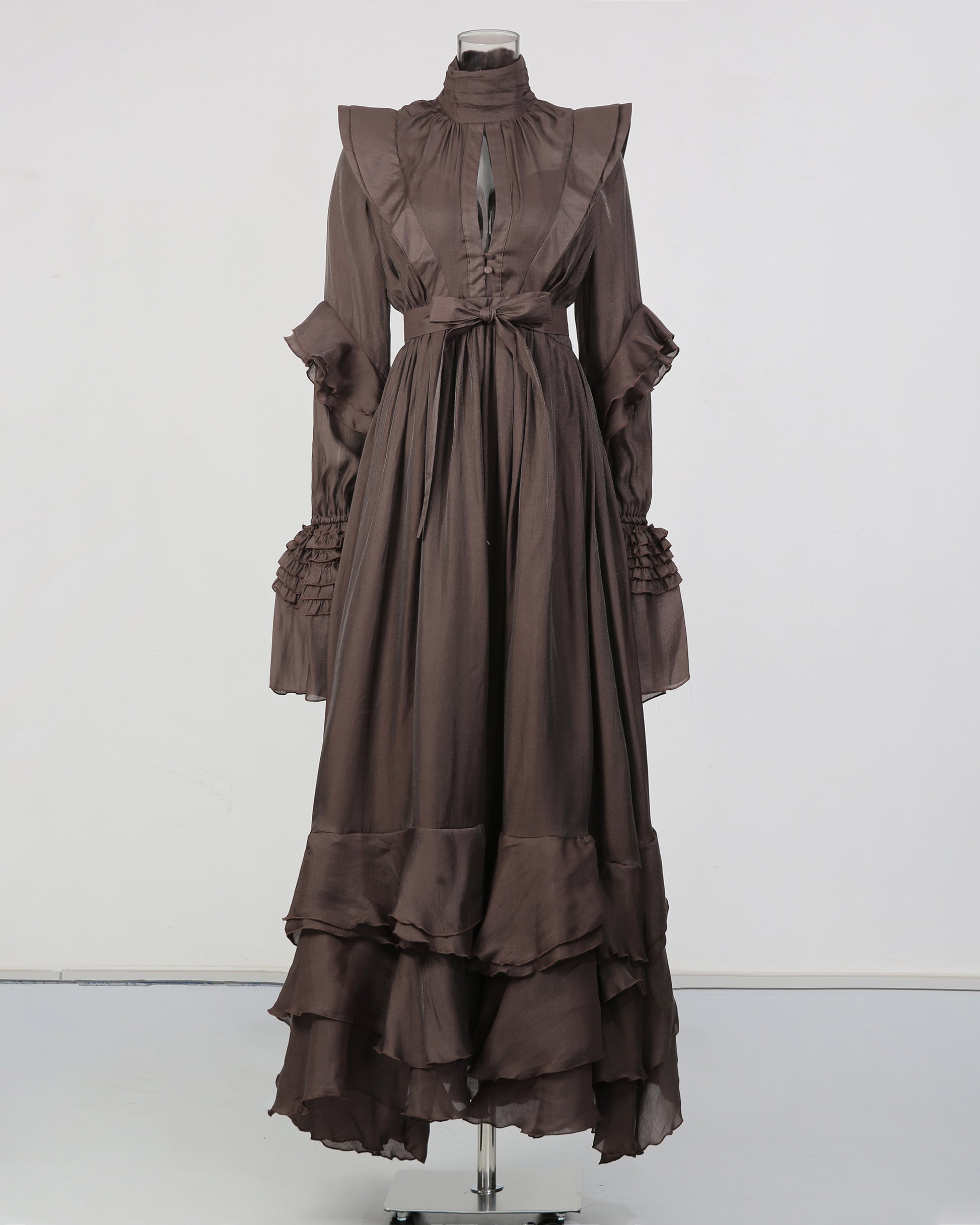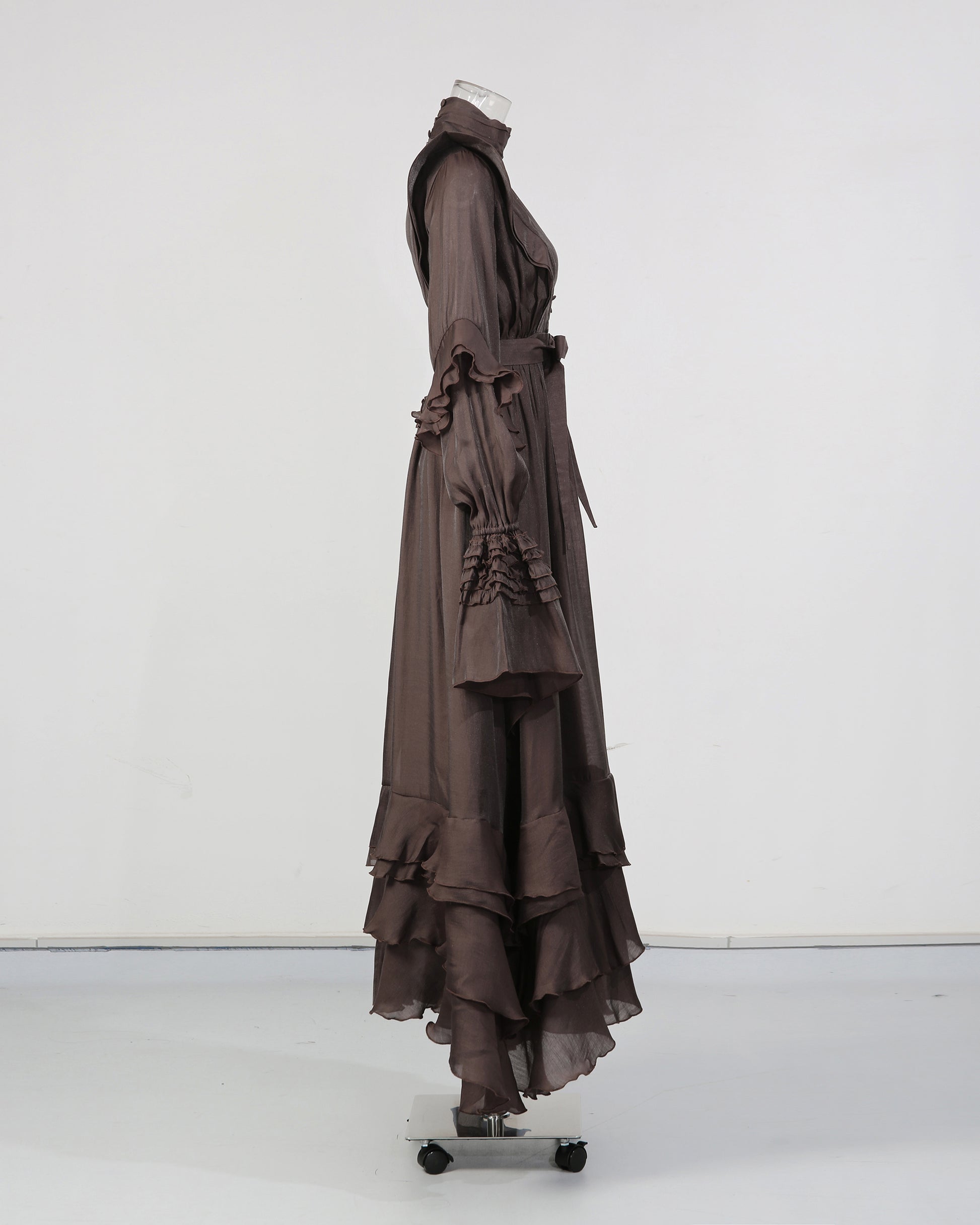 - Flowy, elegant silhouette, blending sheer fabric and feminine accents.