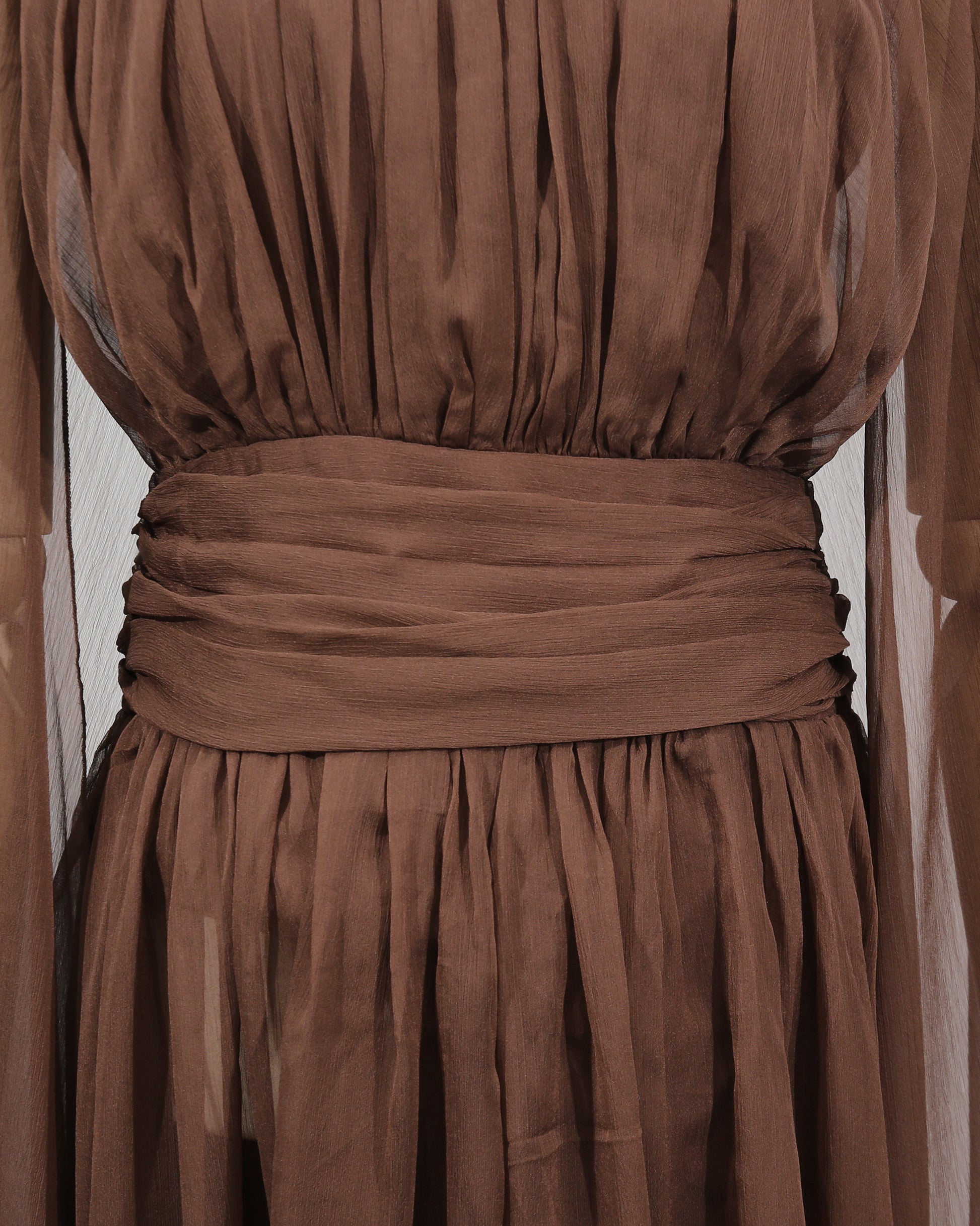 • Ethereal, flowing silhouette, blending lightweight chiffon and elegant draping.