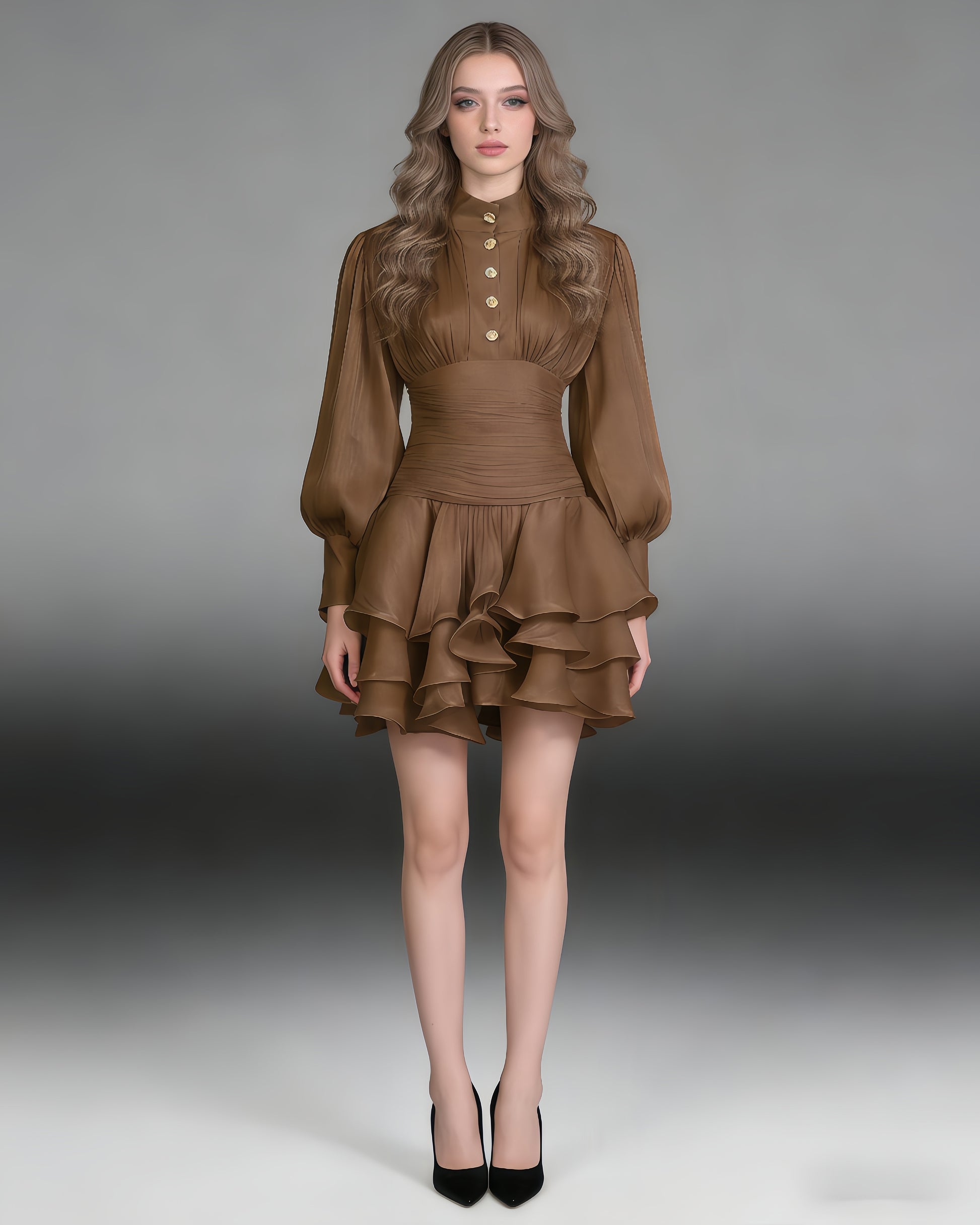 Coffee Shimmer Puff Sleeve Ruffled Mini Dress
