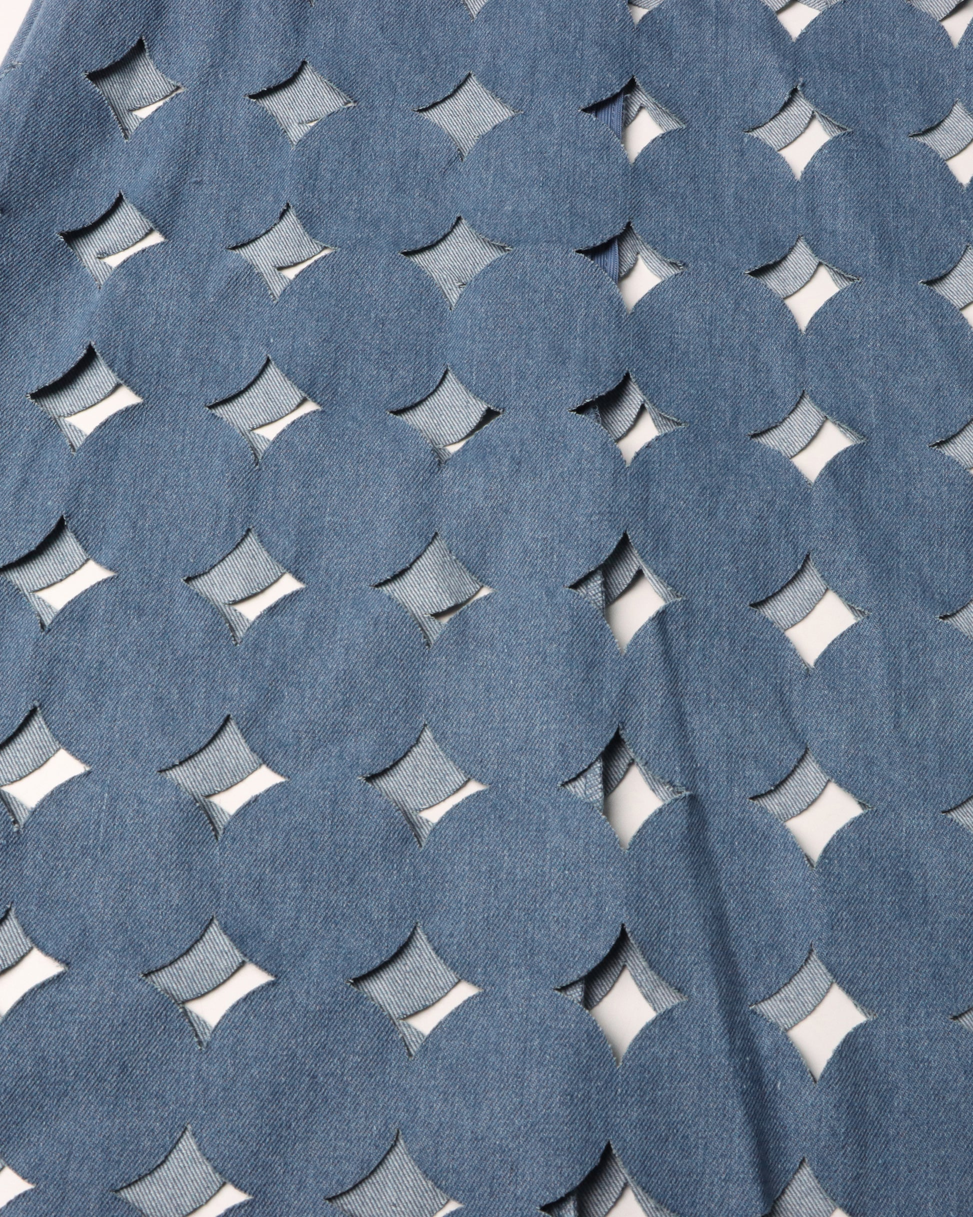 - Avant-garde, playful silhouette, blending structured denim and geometric detailing.