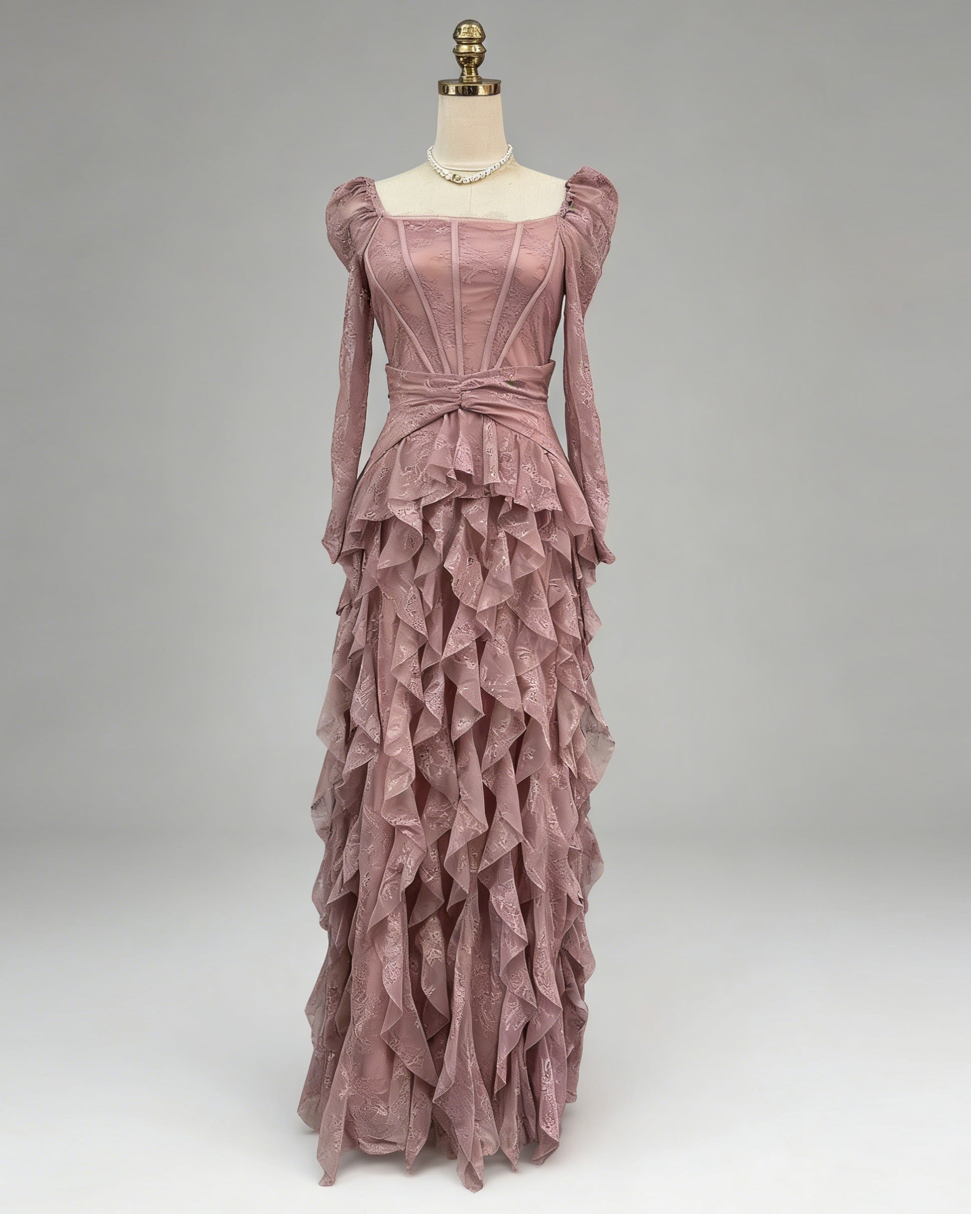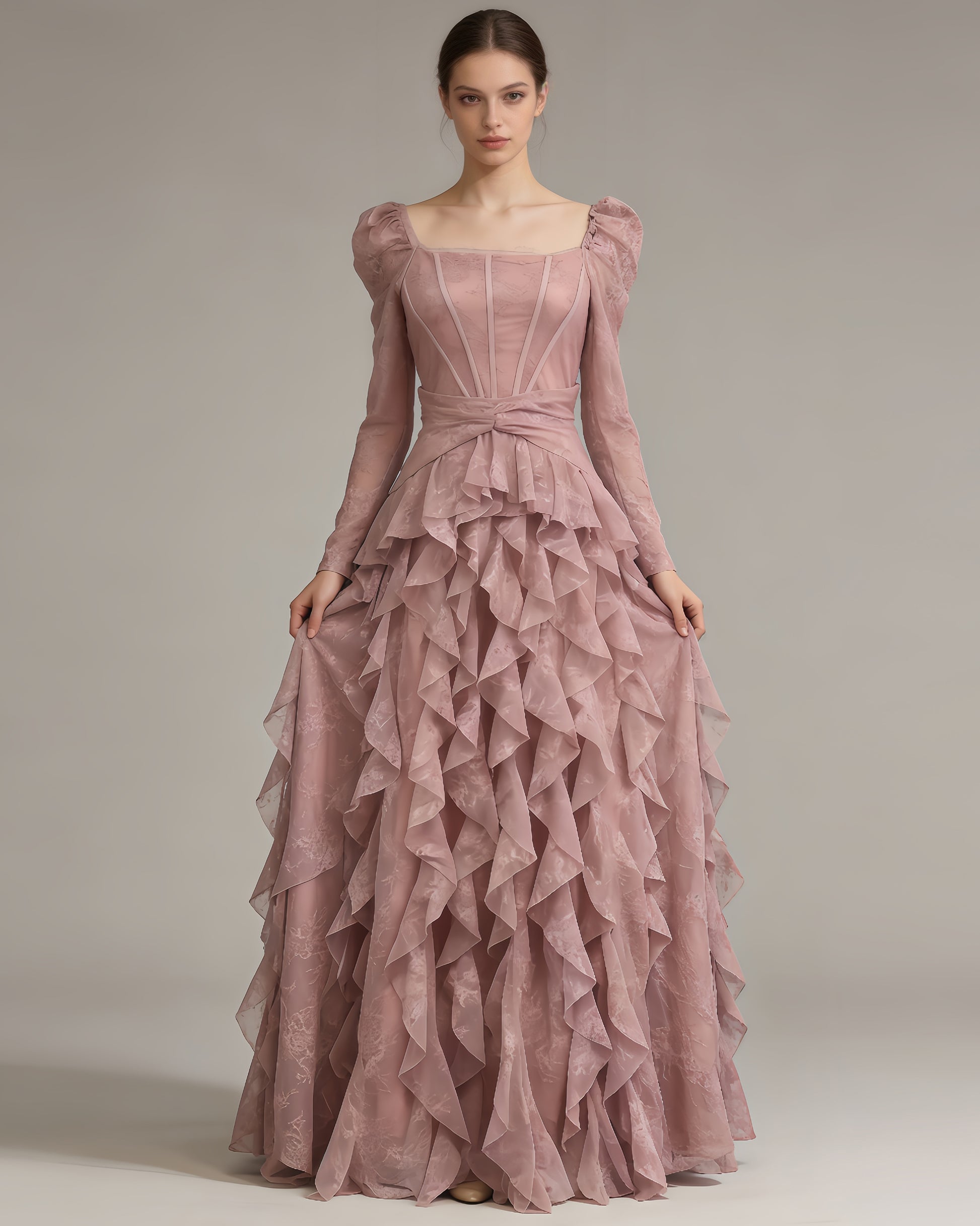 - Dramatic, ethereal silhouette, blending delicate lace and flowing ruffled layers.