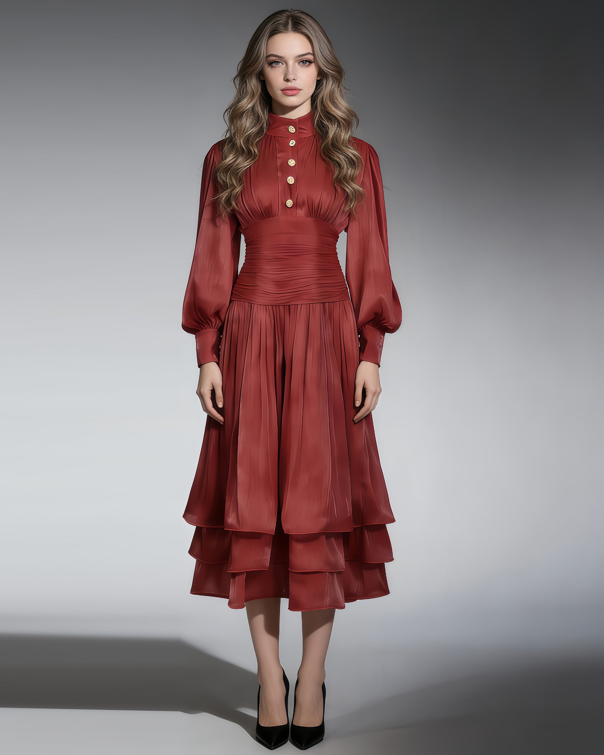 A romantic midi dress: high neckline + ruched waist + bishop sleeves + tiered hem.