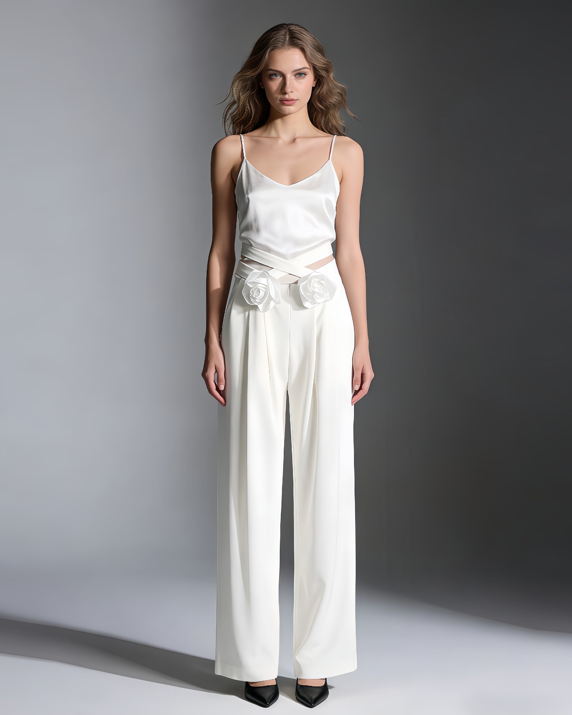 - Polished, feminine silhouette, blending smooth fabric and delicate floral accents.