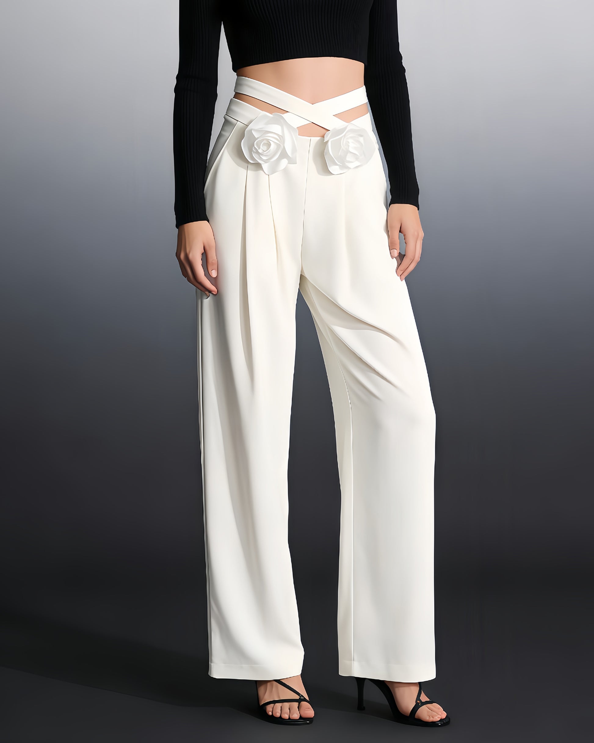White Floral Appliqué Wide-Leg Pants