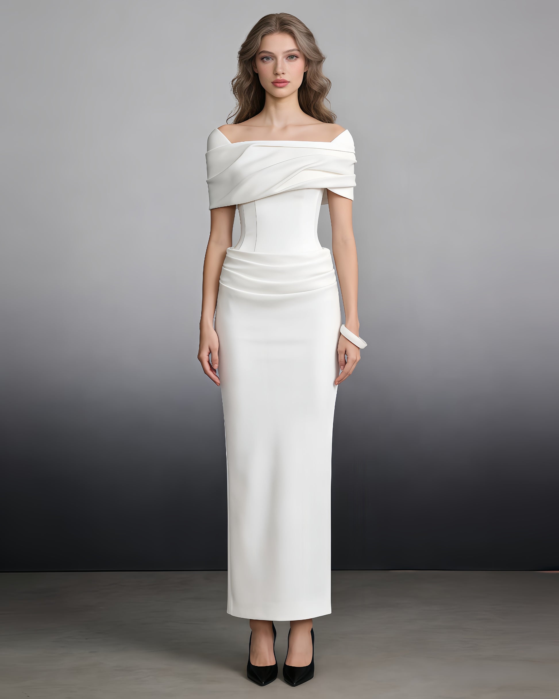 A timeless white gown: off-shoulder draped neckline + ruched waist + column silhouette.