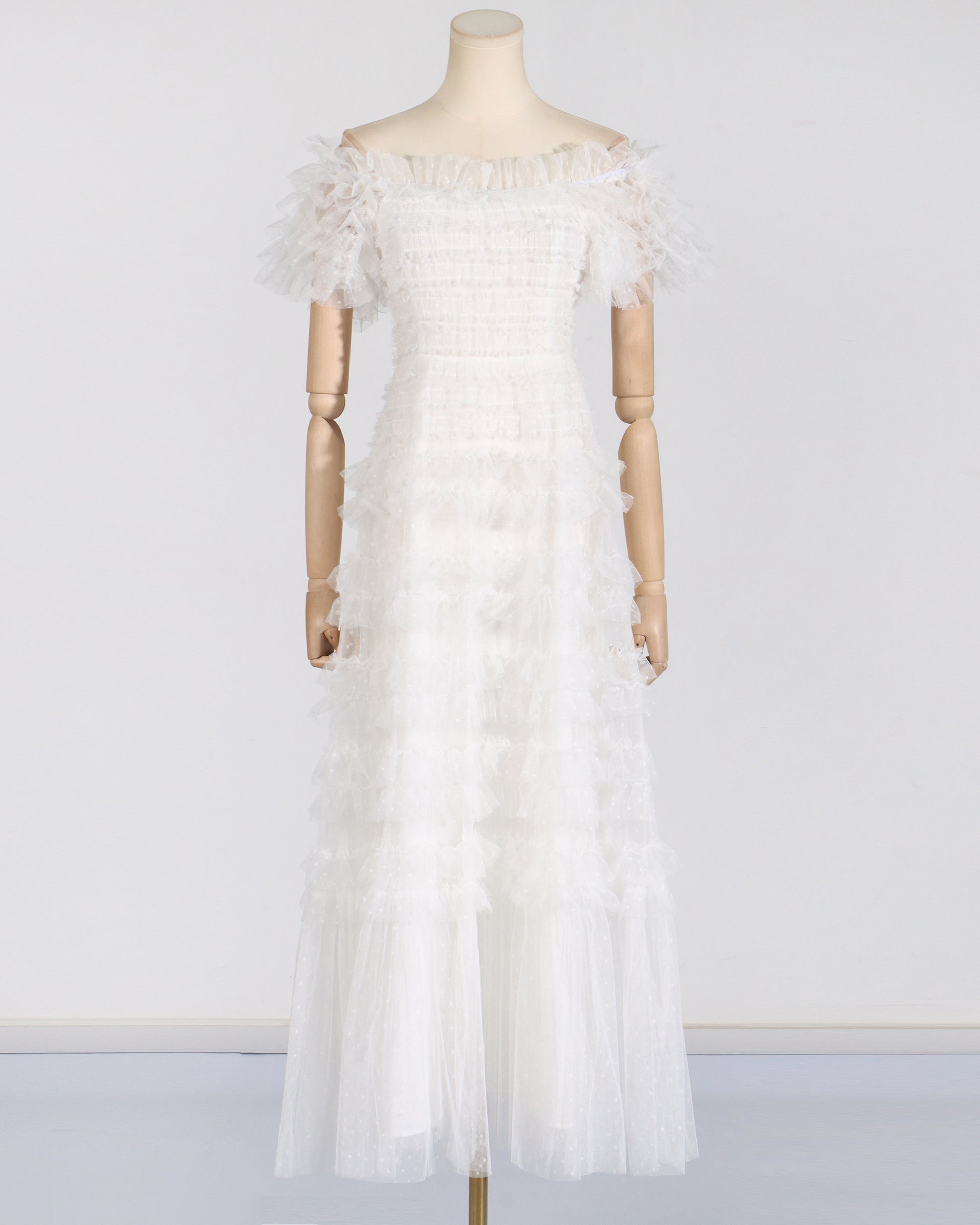 - Ethereal, dreamy silhouette, blending lightweight tulle and soft draping.