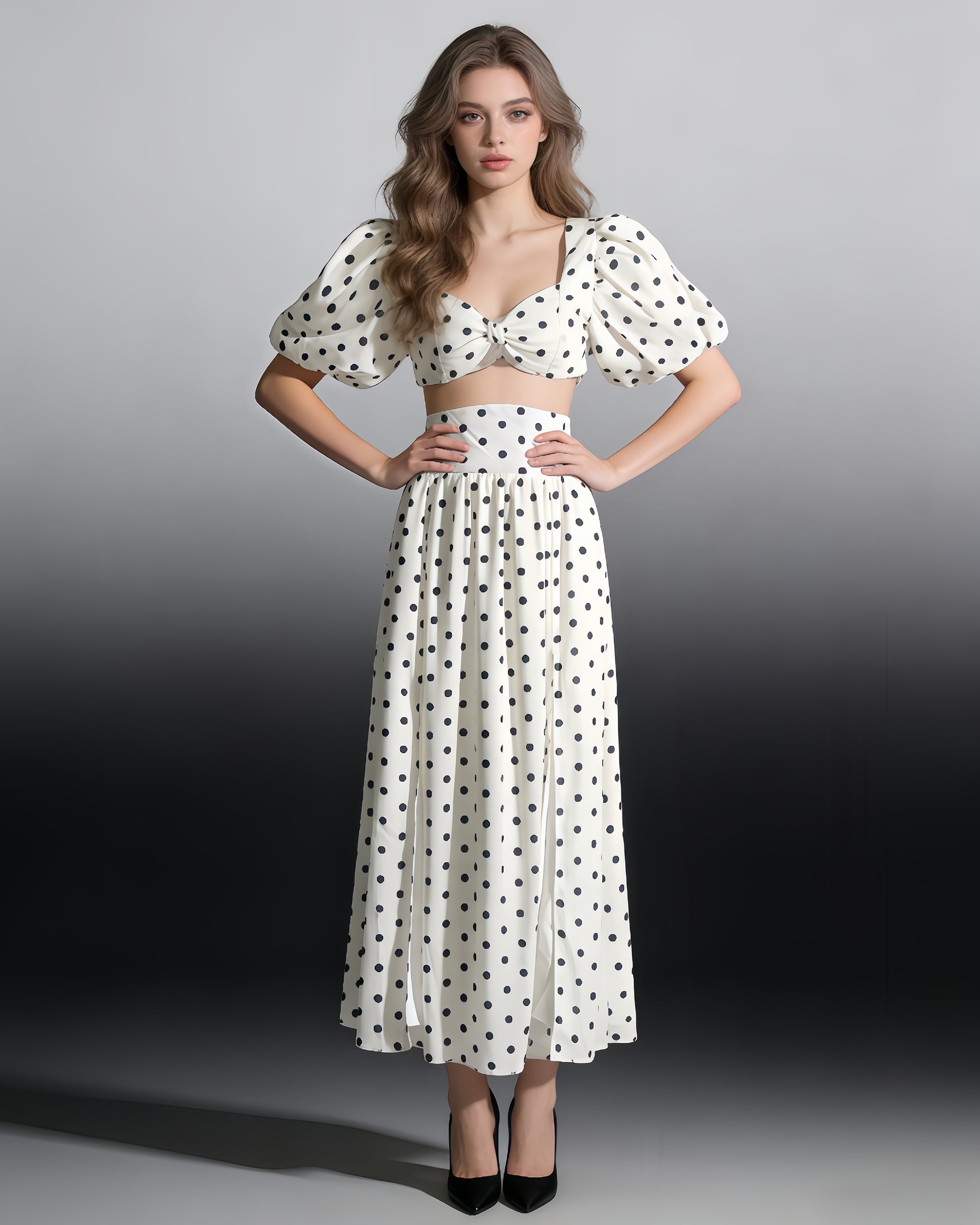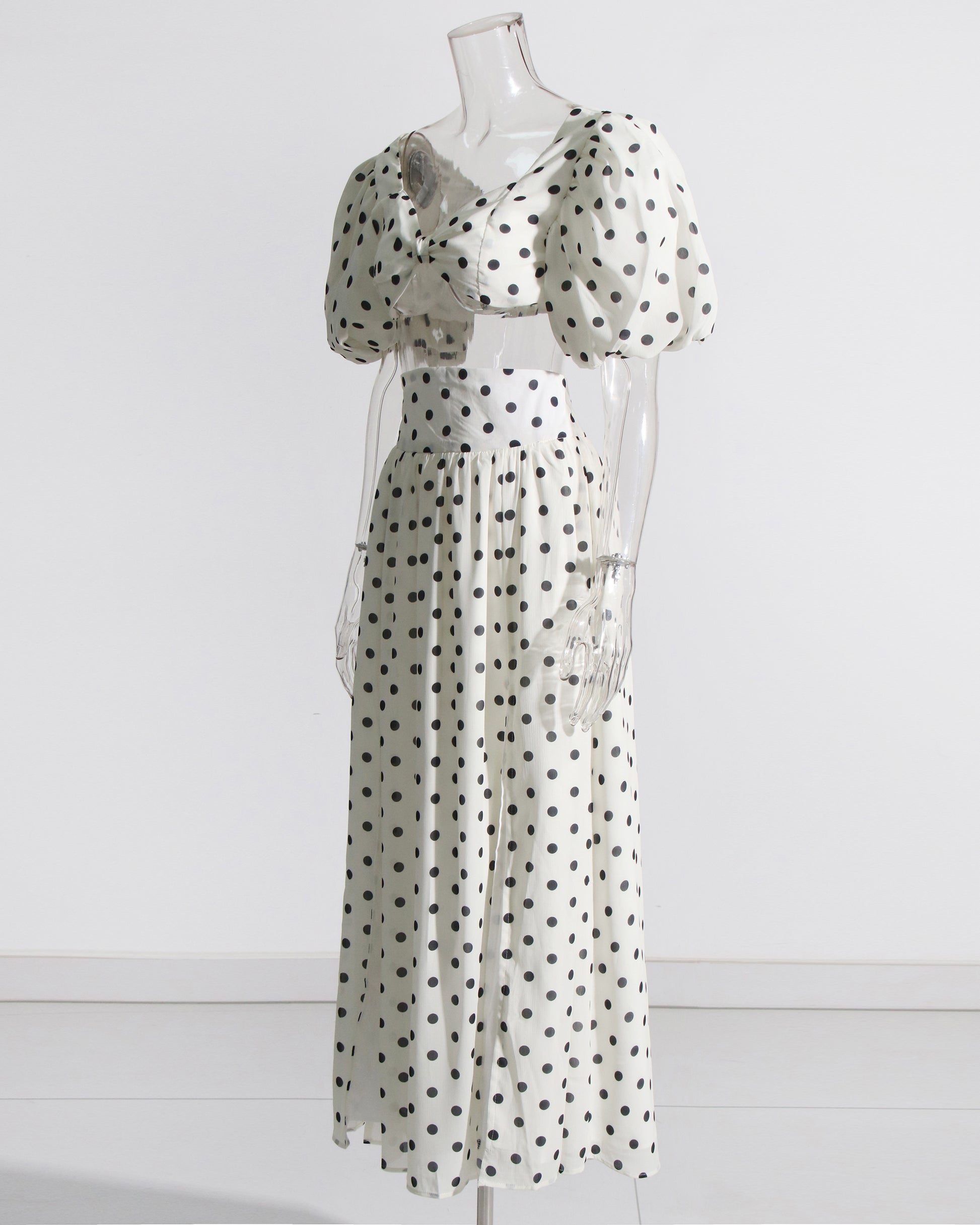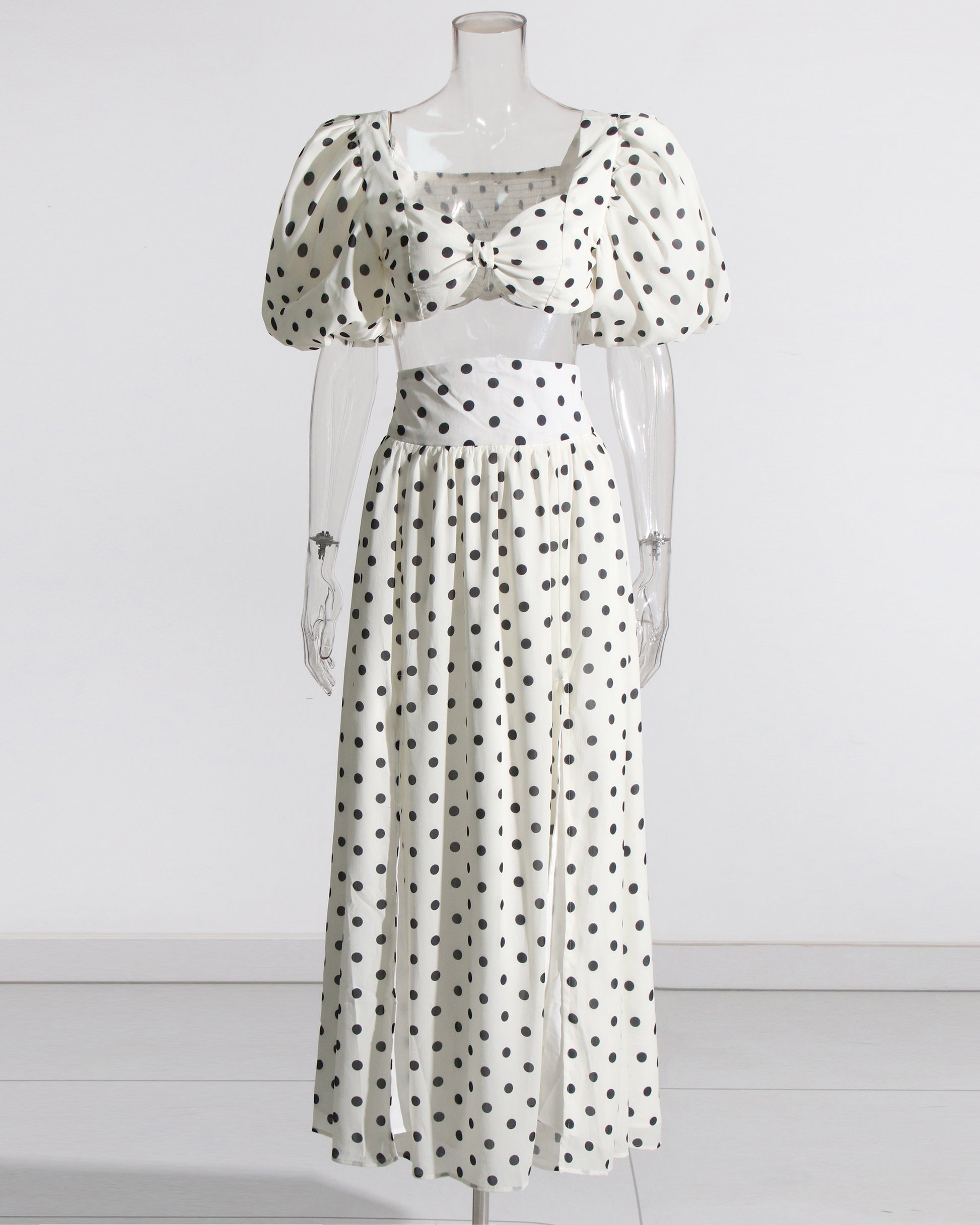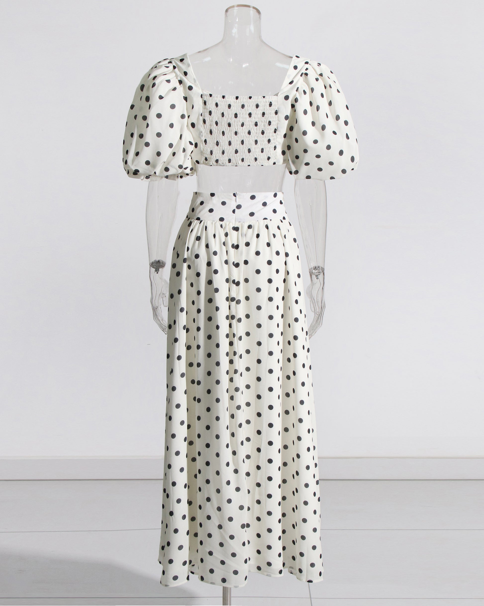 White Polka Dot Puff Sleeve Top & Skirt Set