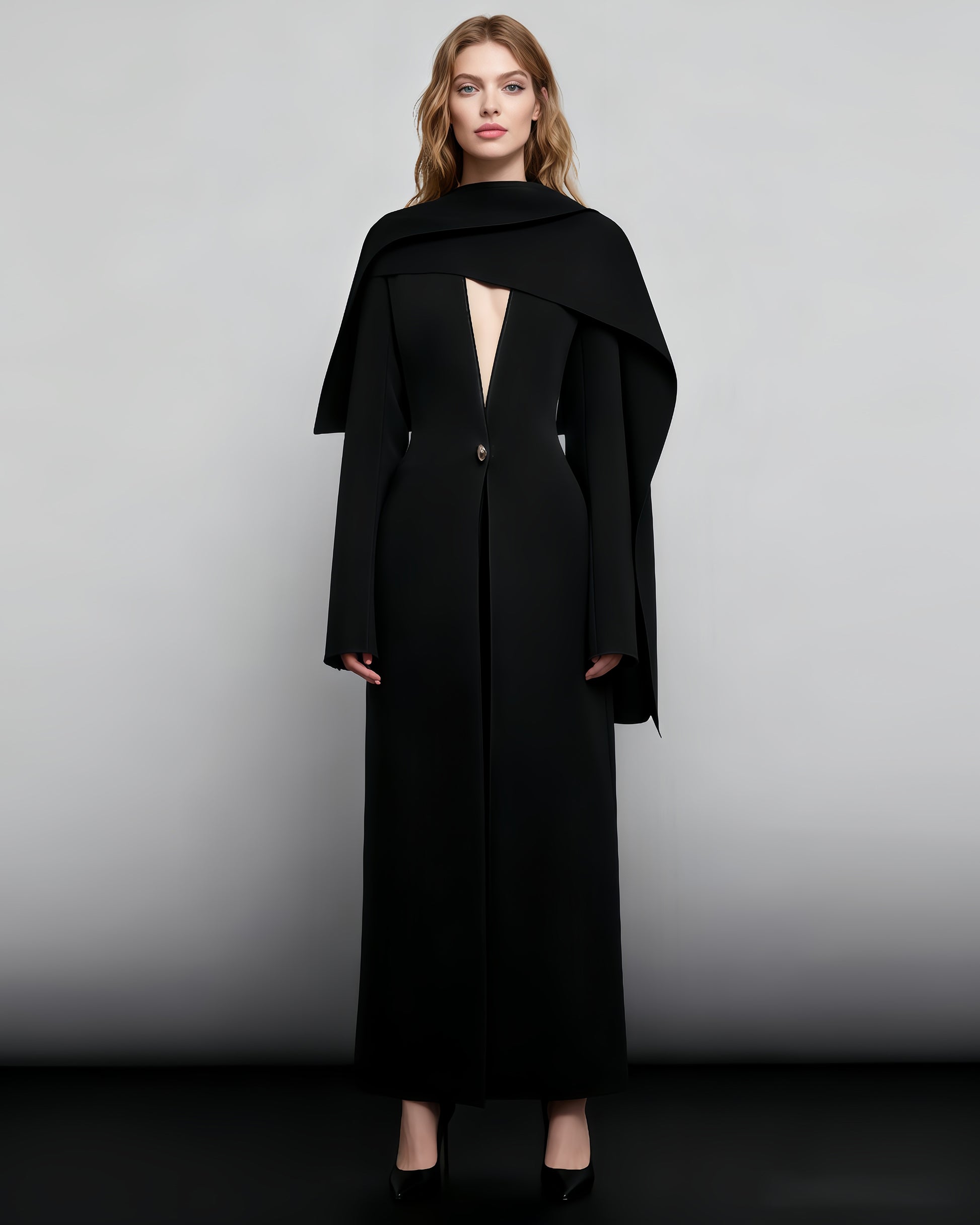 - Cape - style overlay and striking cutouts, creating a sculptural silhouette.