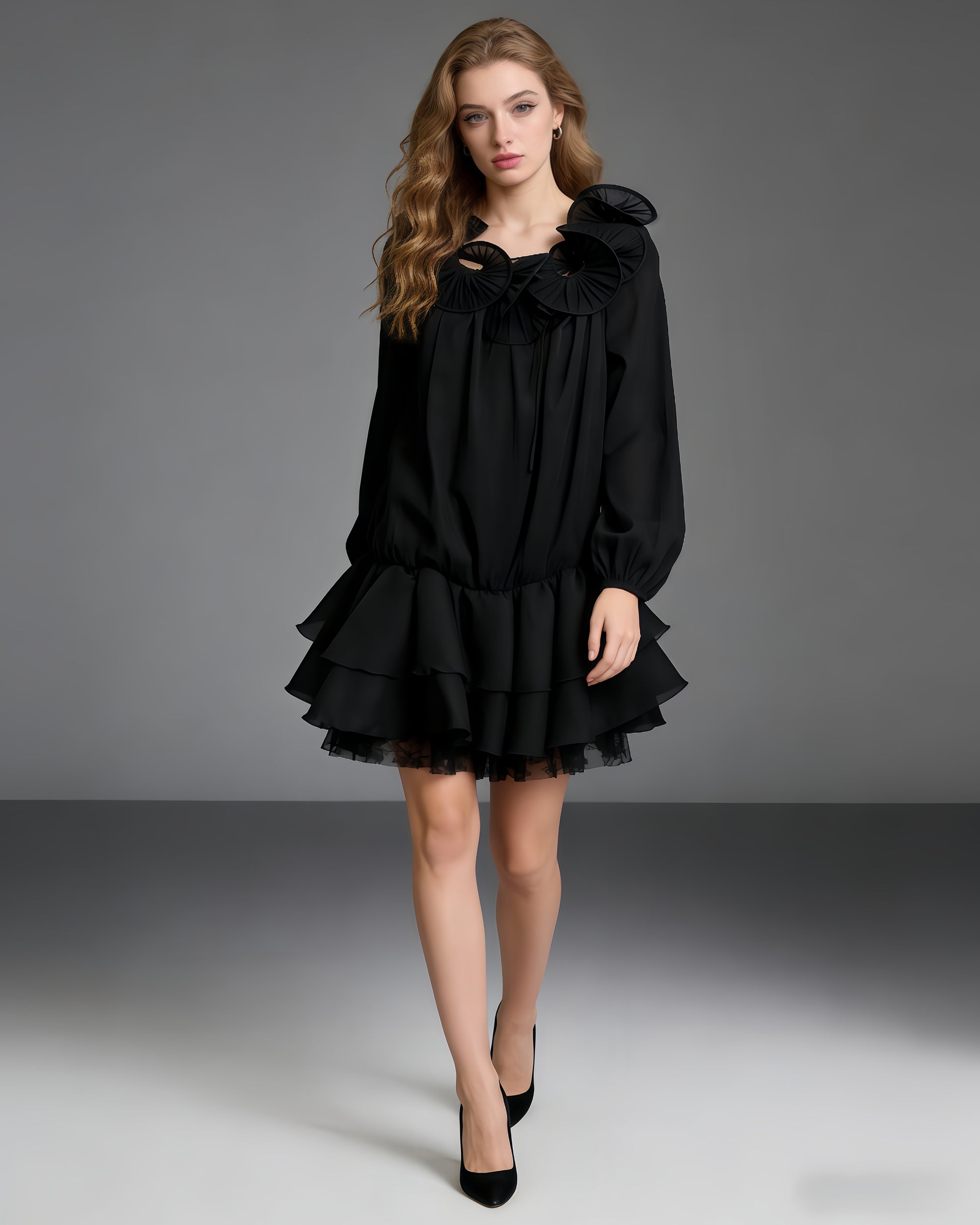Black Tulle 3D Floral Lantern Sleeve Mini Dress