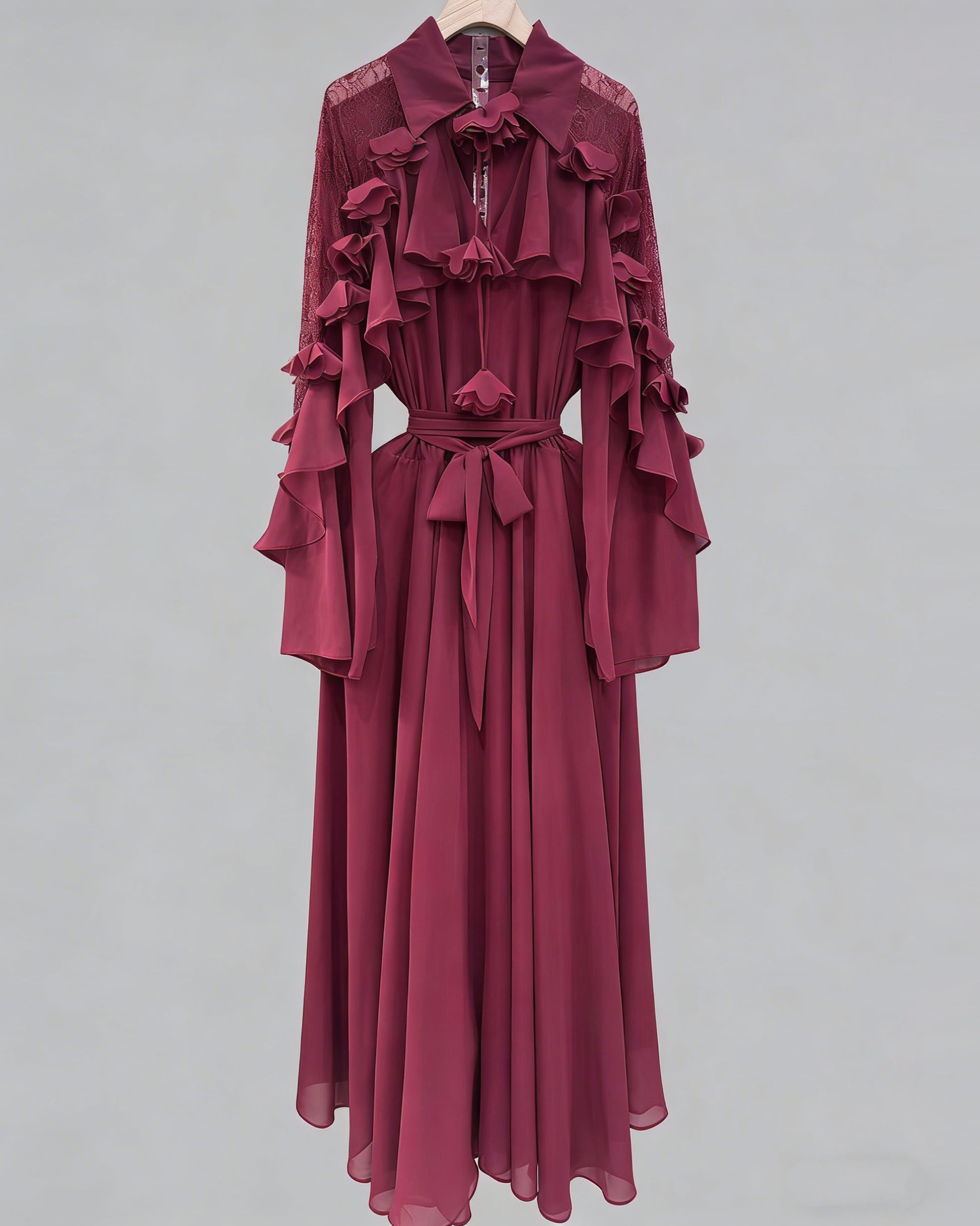Wine Red Shirt Collar Ruffled Shiny Maxi Dress