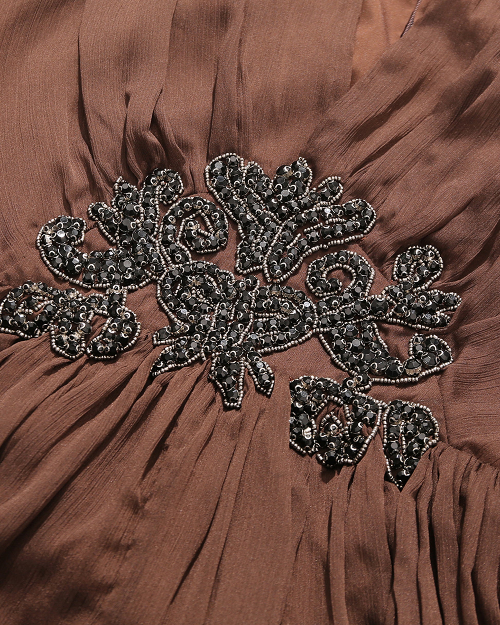 - Vintage, romantic silhouette with warm coffee hue and delicate beading, designed for a refined, nostalgic look.