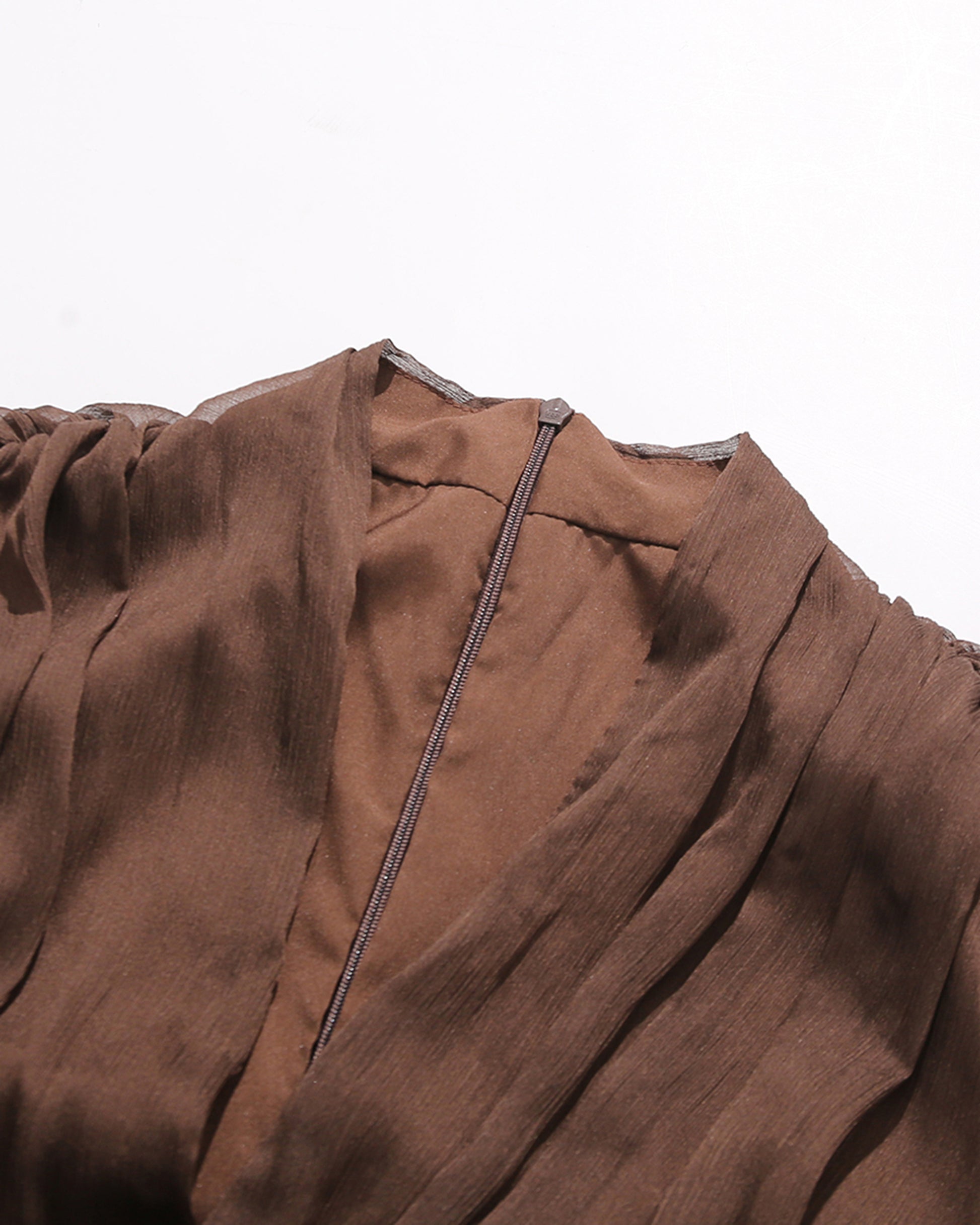 Coffee V-Neck Beaded Sheer Puff Sleeve Maxi Dress