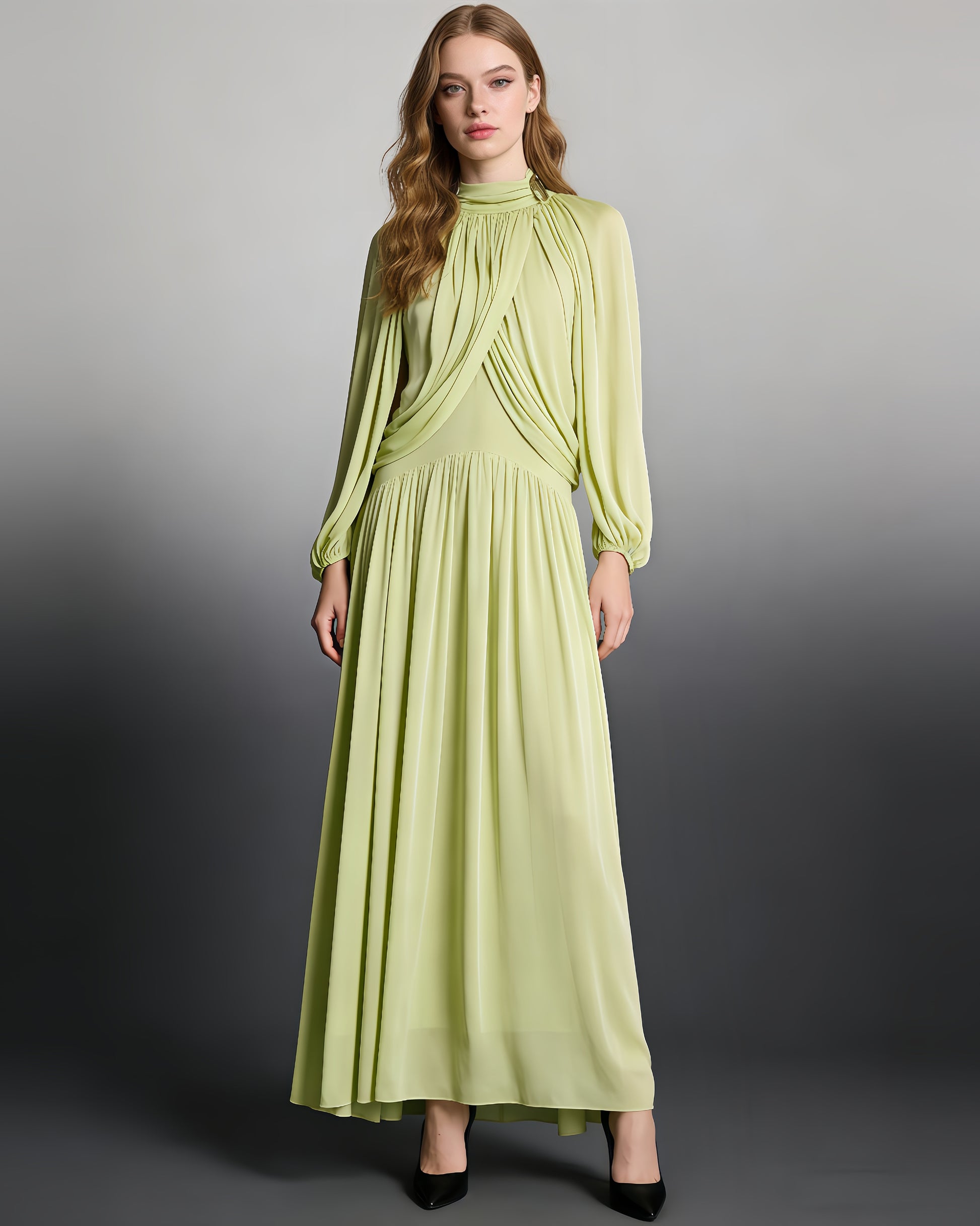 - Ethereal, goddess-like silhouette with fluid draping and a gentle green hue, designed for a serene, sophisticated look.