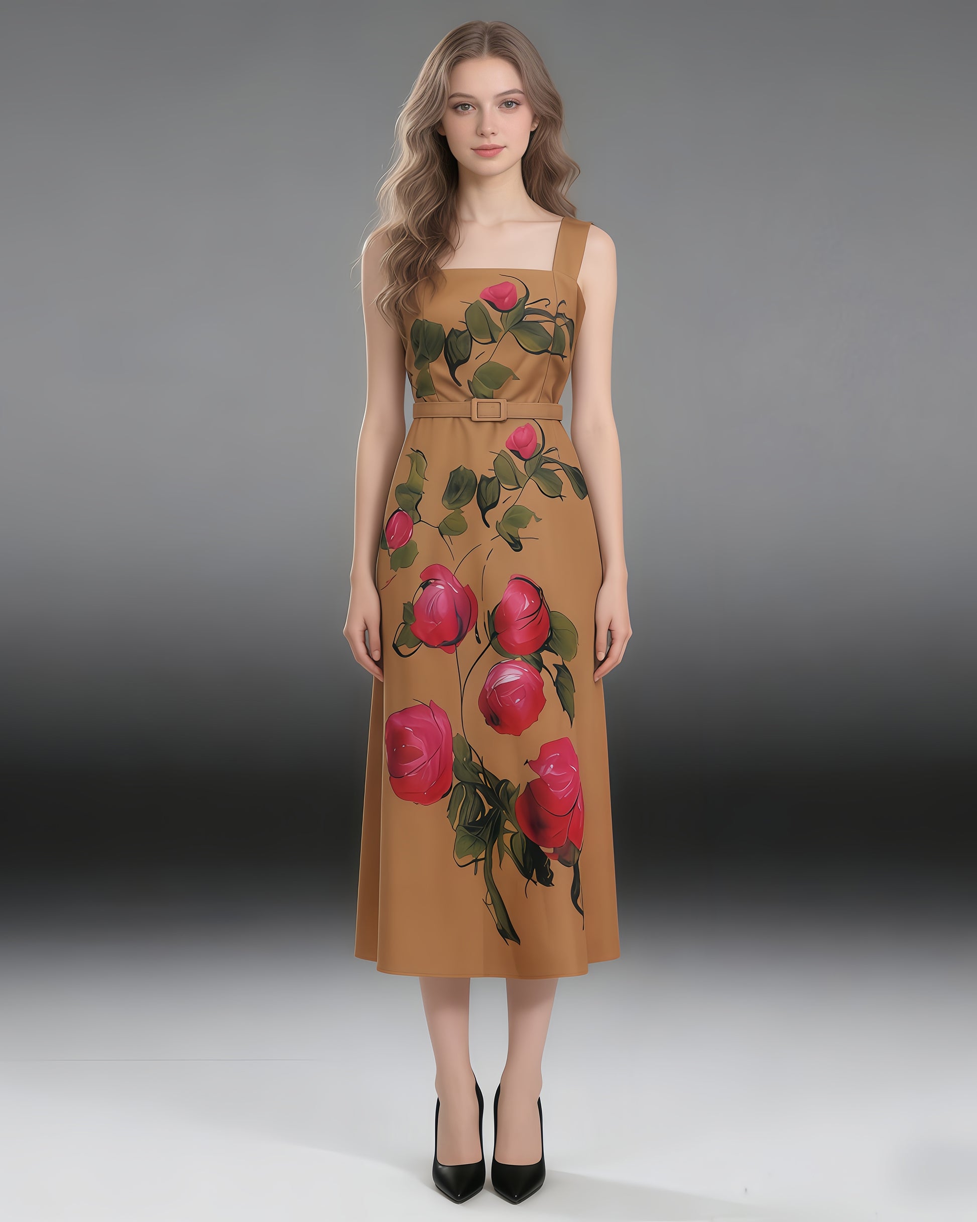 - Elegant, painterly silhouette with bold floral artwork and a cinched waist for definition.