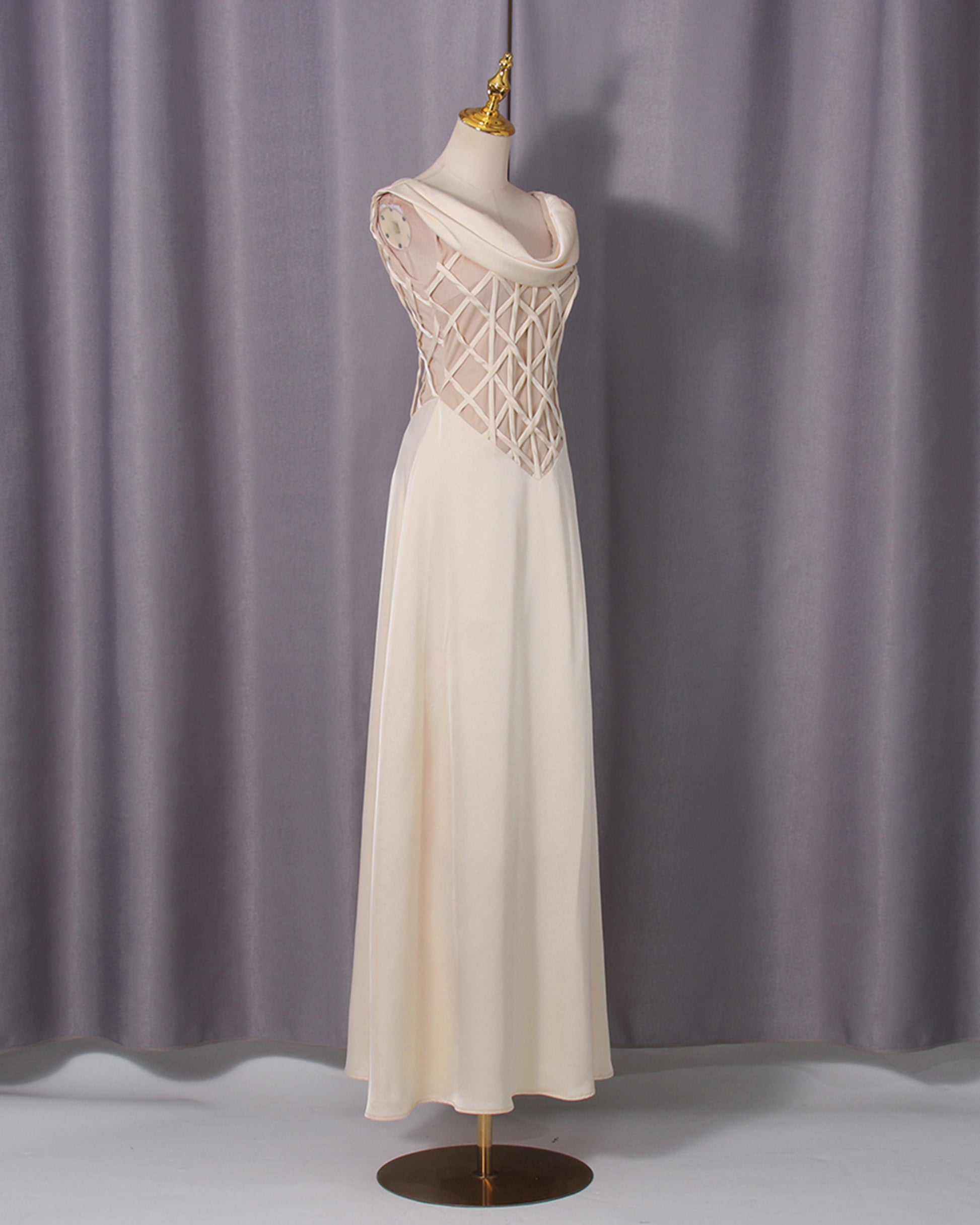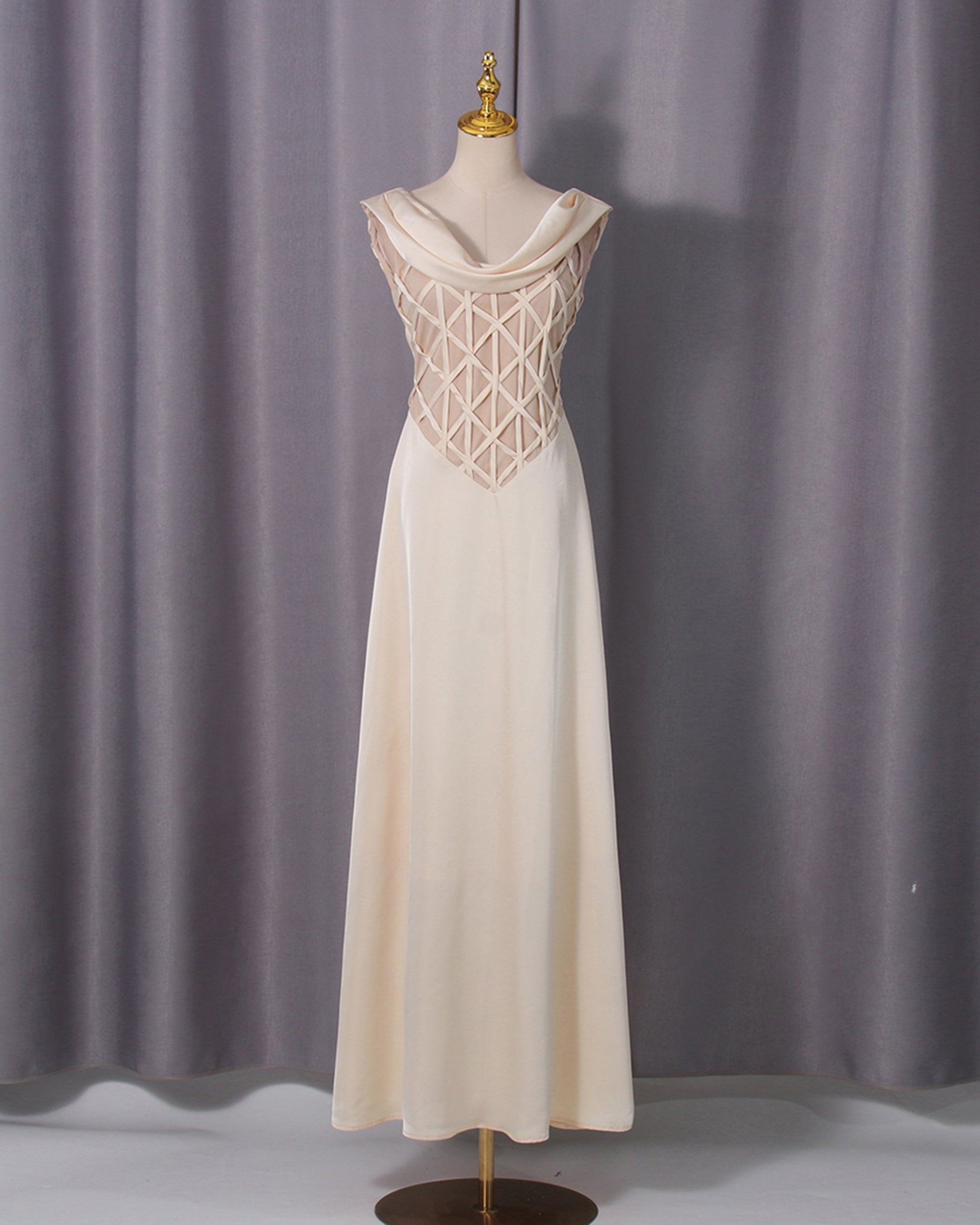Apricot Cowl Neck Mesh Satin Maxi Dress