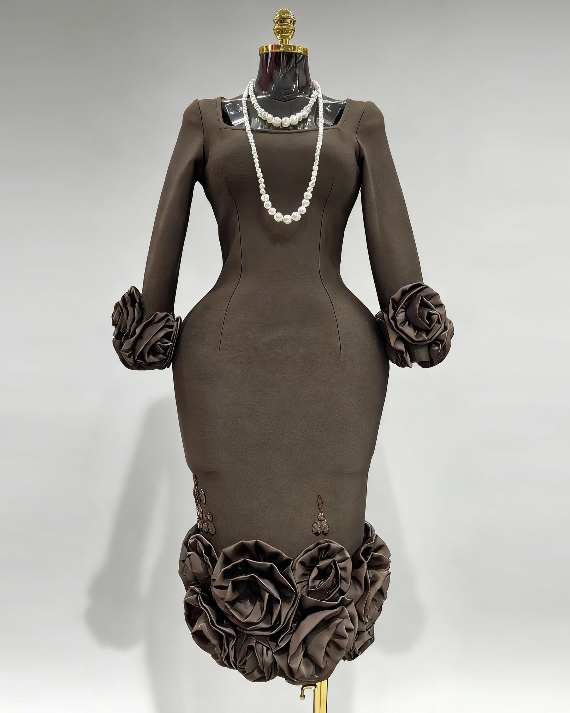- Elegant, curvy silhouette with dramatic 3D floral details, designed to accentuate the figure and create a luxurious look.