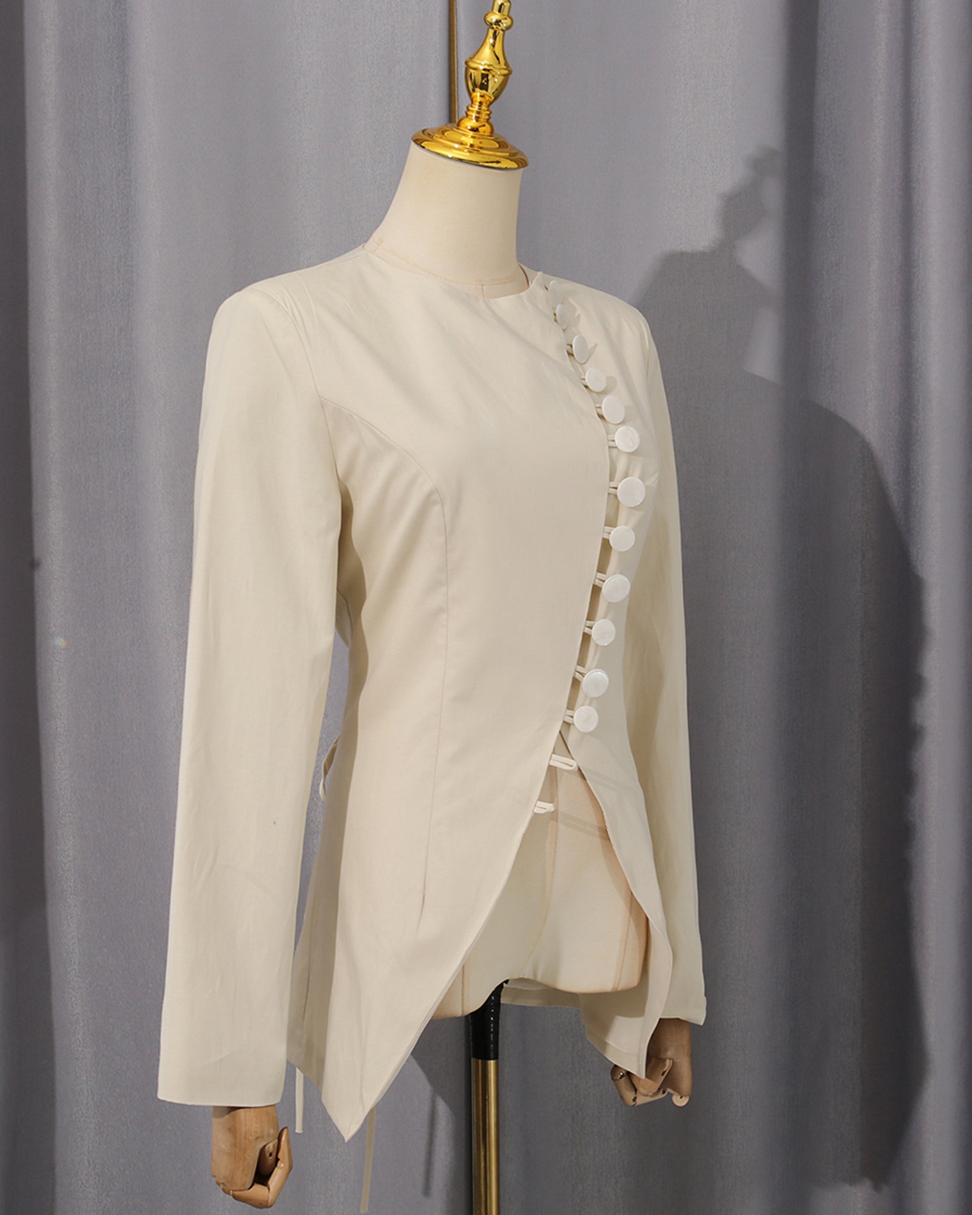 - Unique minimalist silhouette with eye-catching diagonal button detail and contoured fit.