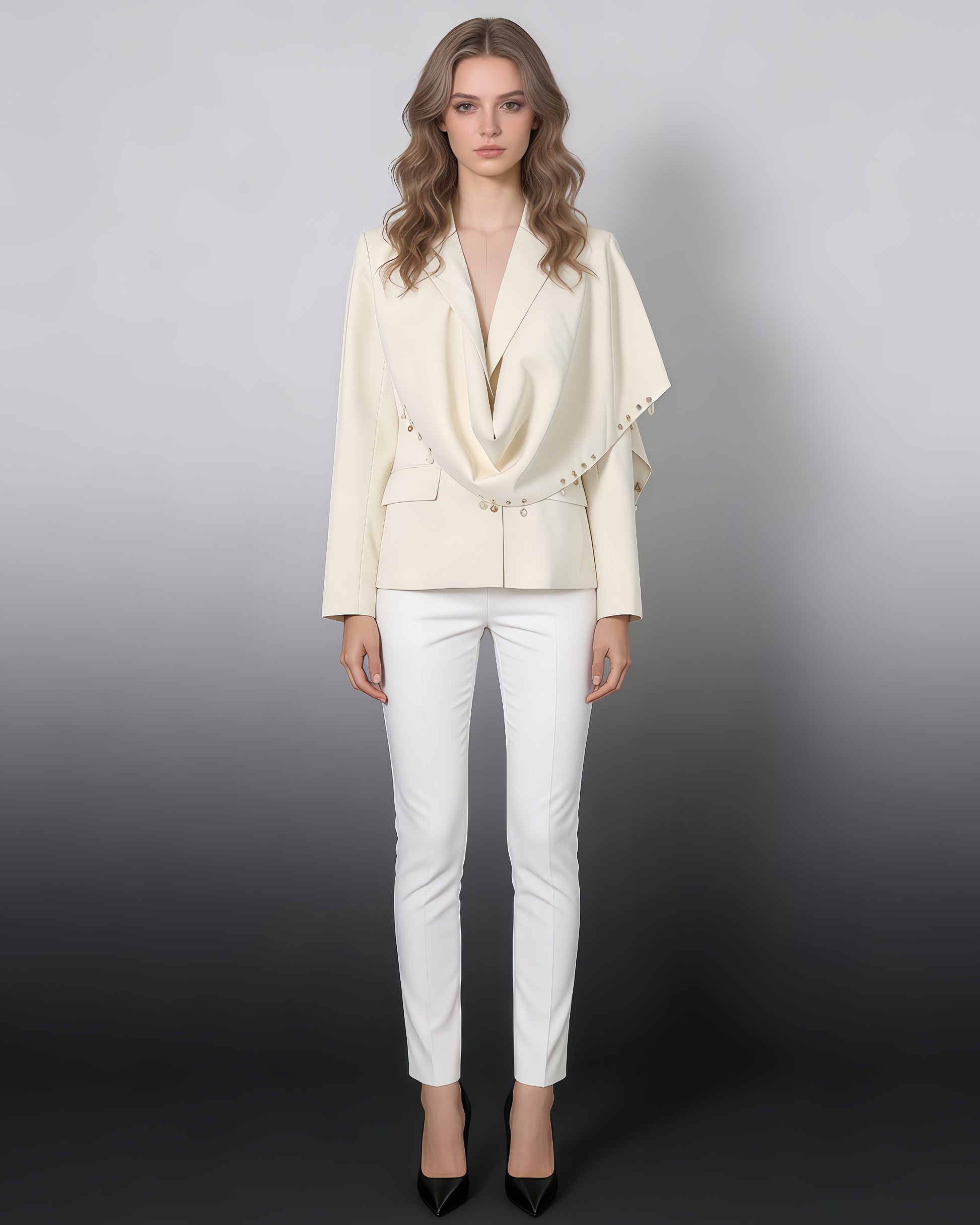 - Feminine, elegant silhouette, blending structured fabric with delicate, sparkling details.