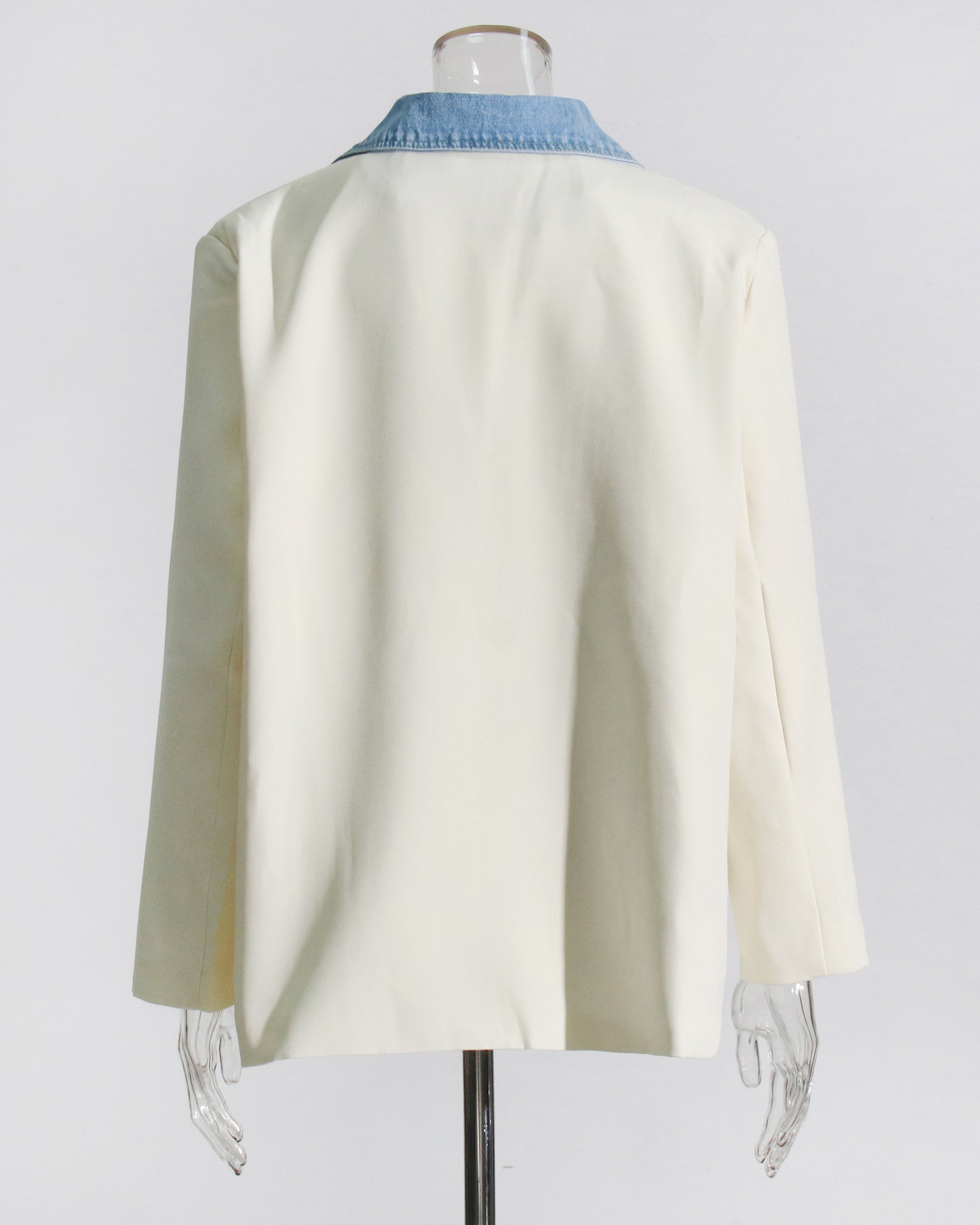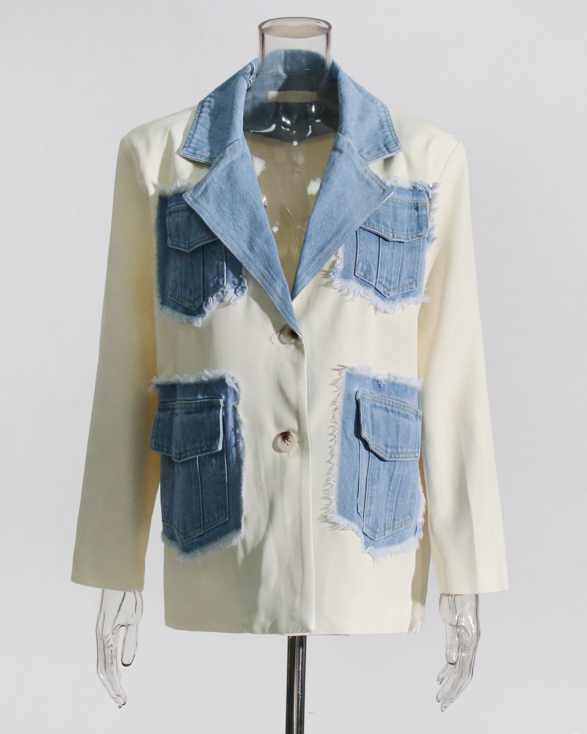 - Edgy, trendy silhouette, blending casual denim and tailored style.