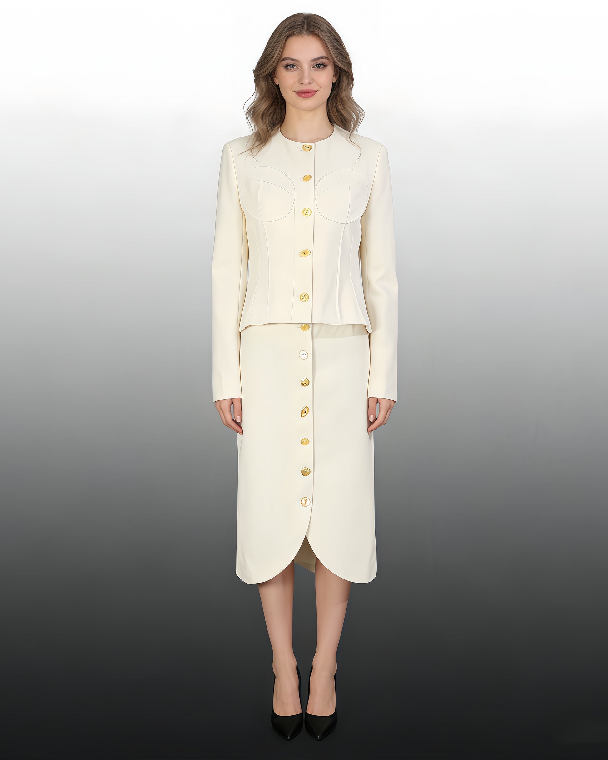- Gold buttons, matching top & midi skirt, creating a sophisticated silhouette.