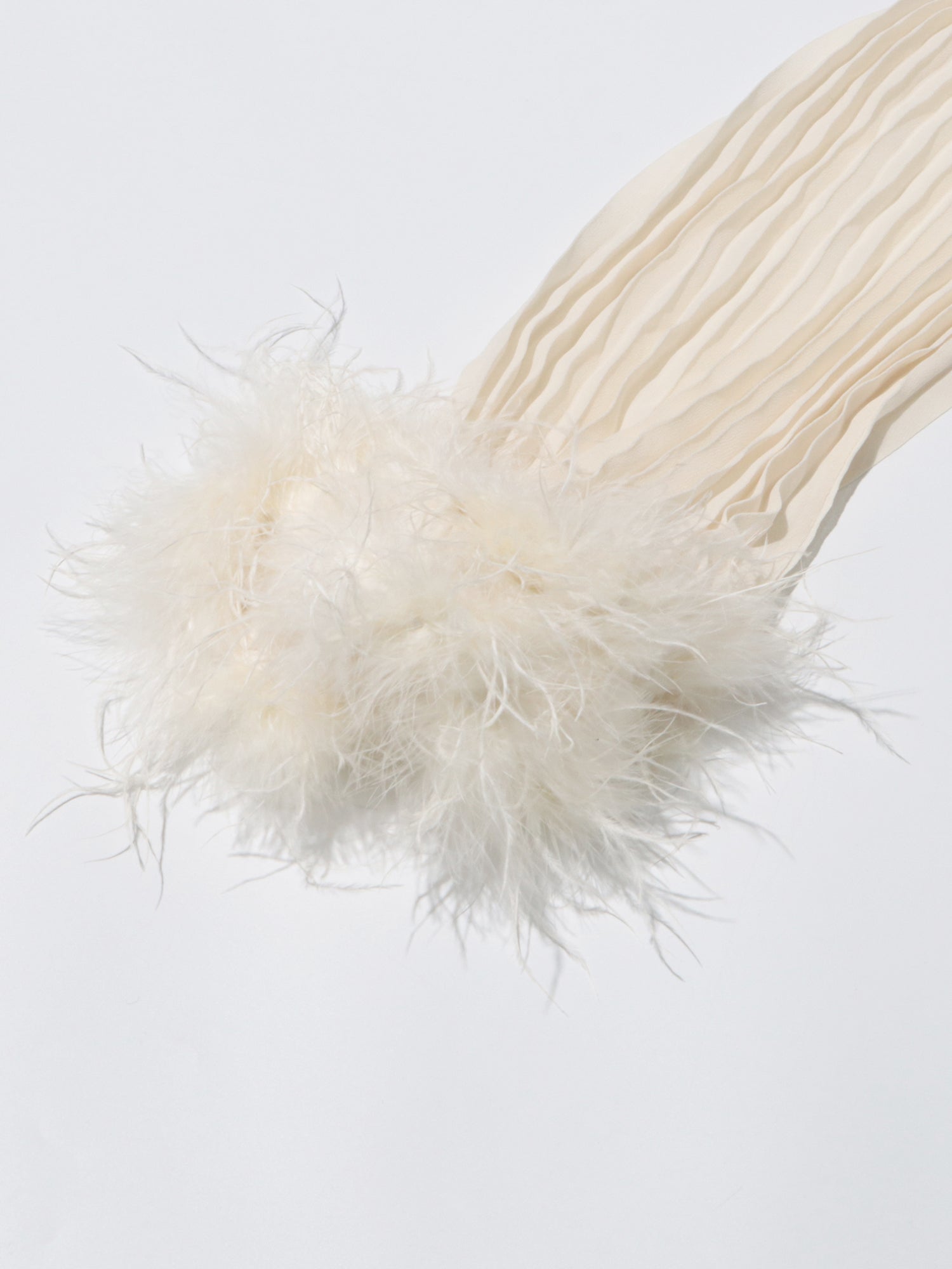 - Pleated texture, maxi length, crystal neckline, and feather cuffs, creating a regal silhouette.