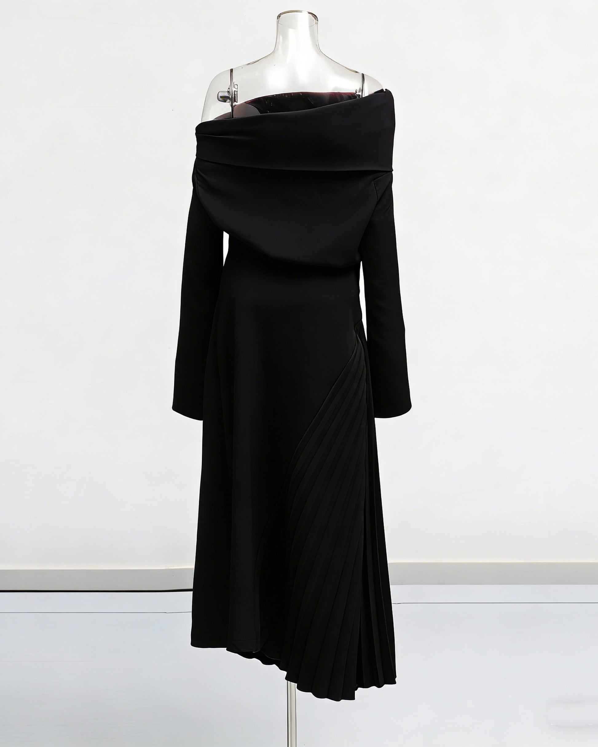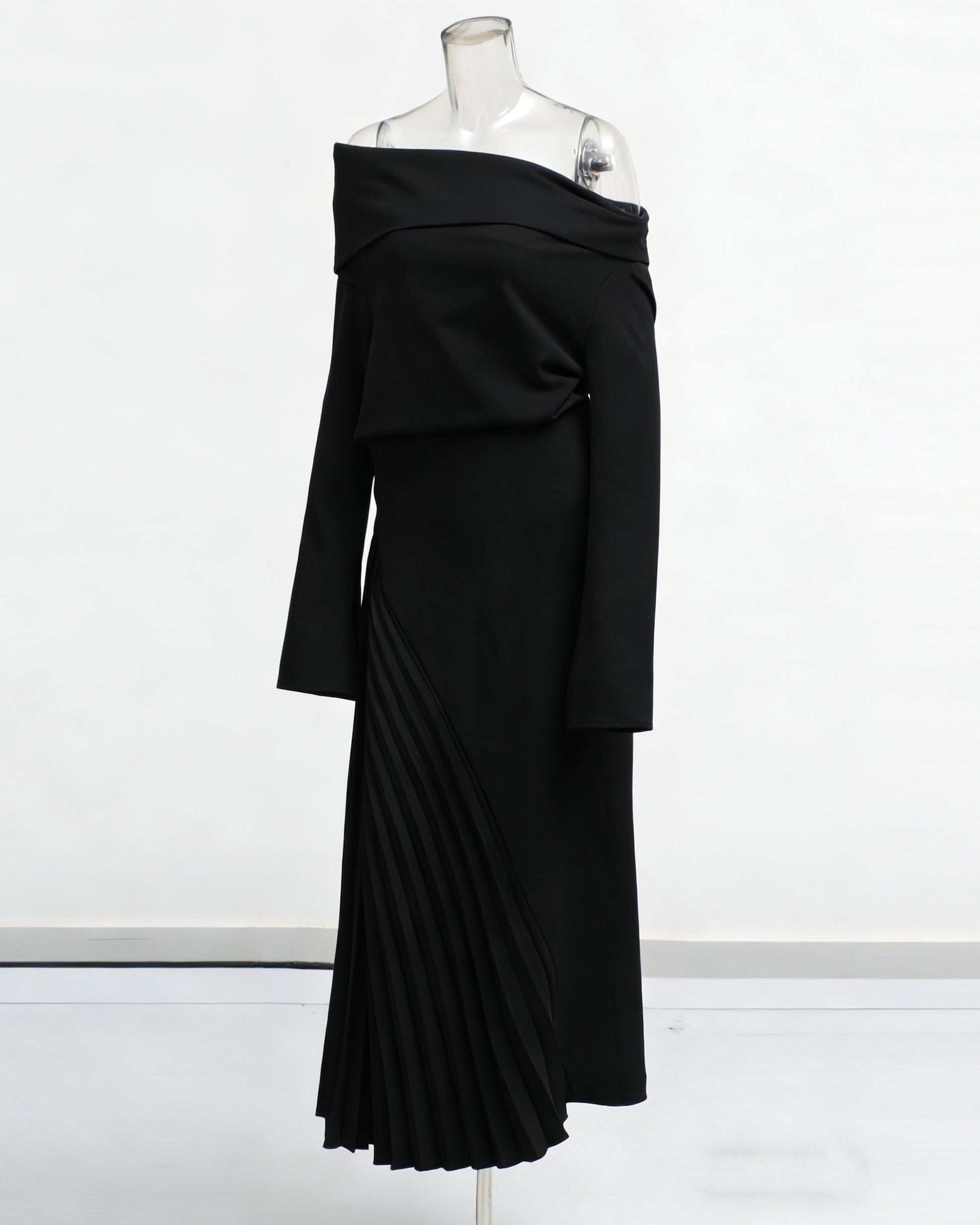 Black Asymmetric Off-Shoulder Pleated Maxi Dress
