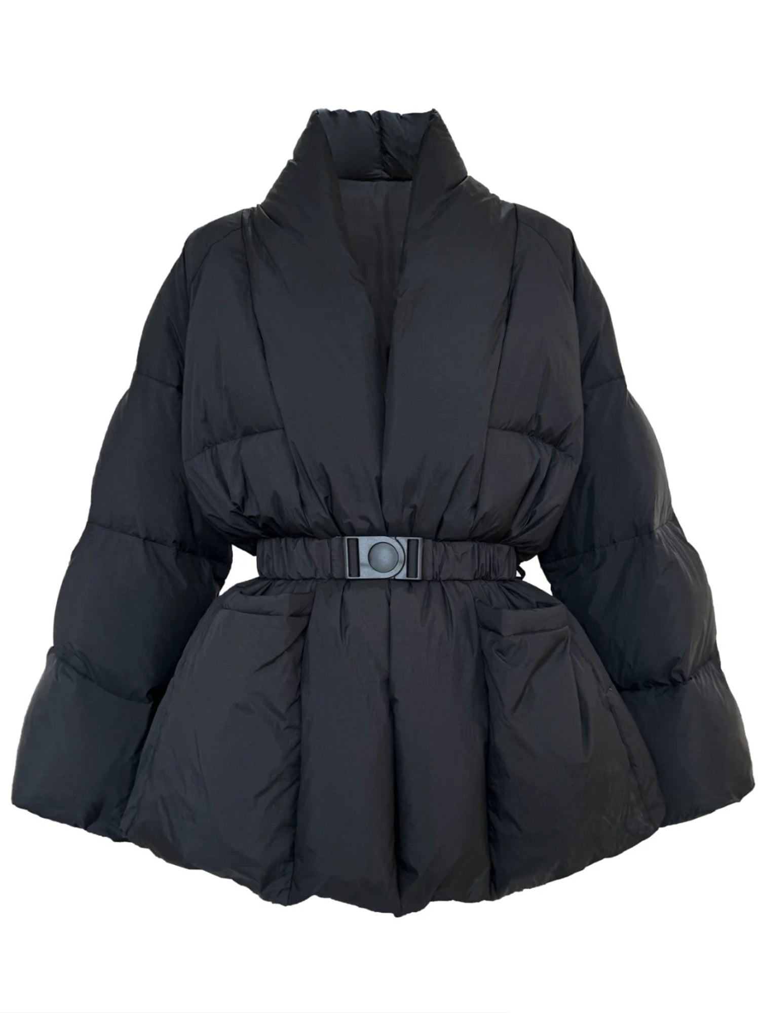 Black Belted Cotton-Padded Jacket with Kimono Collar