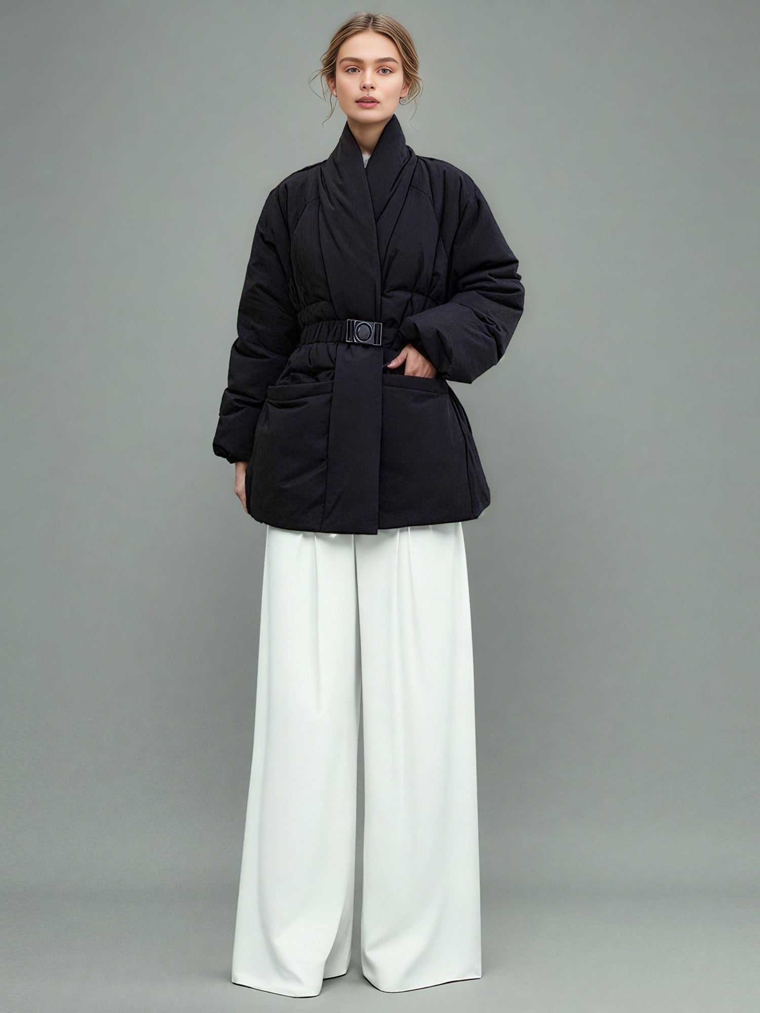 - Kimono collar, belted waist, creating a trendy silhouette.