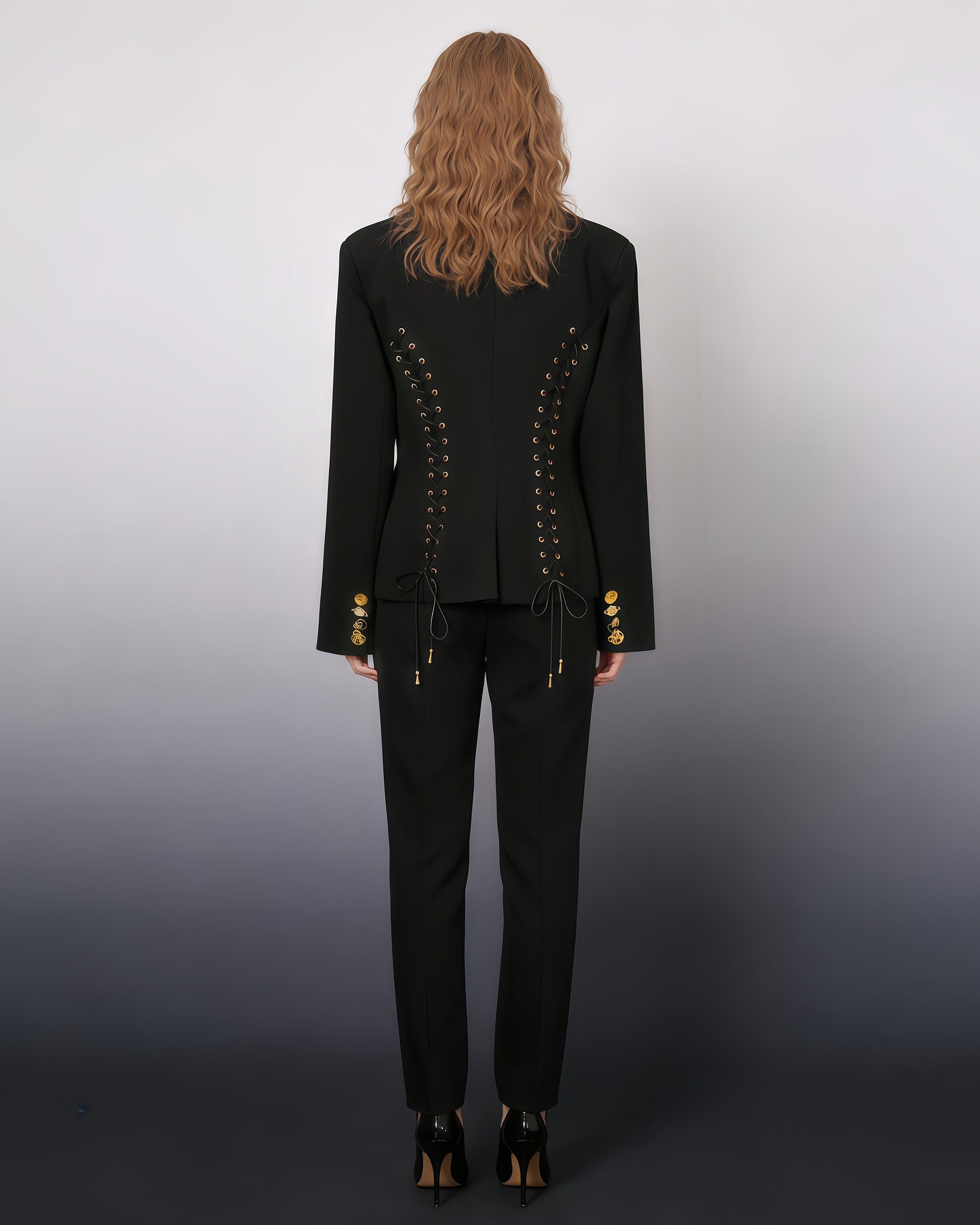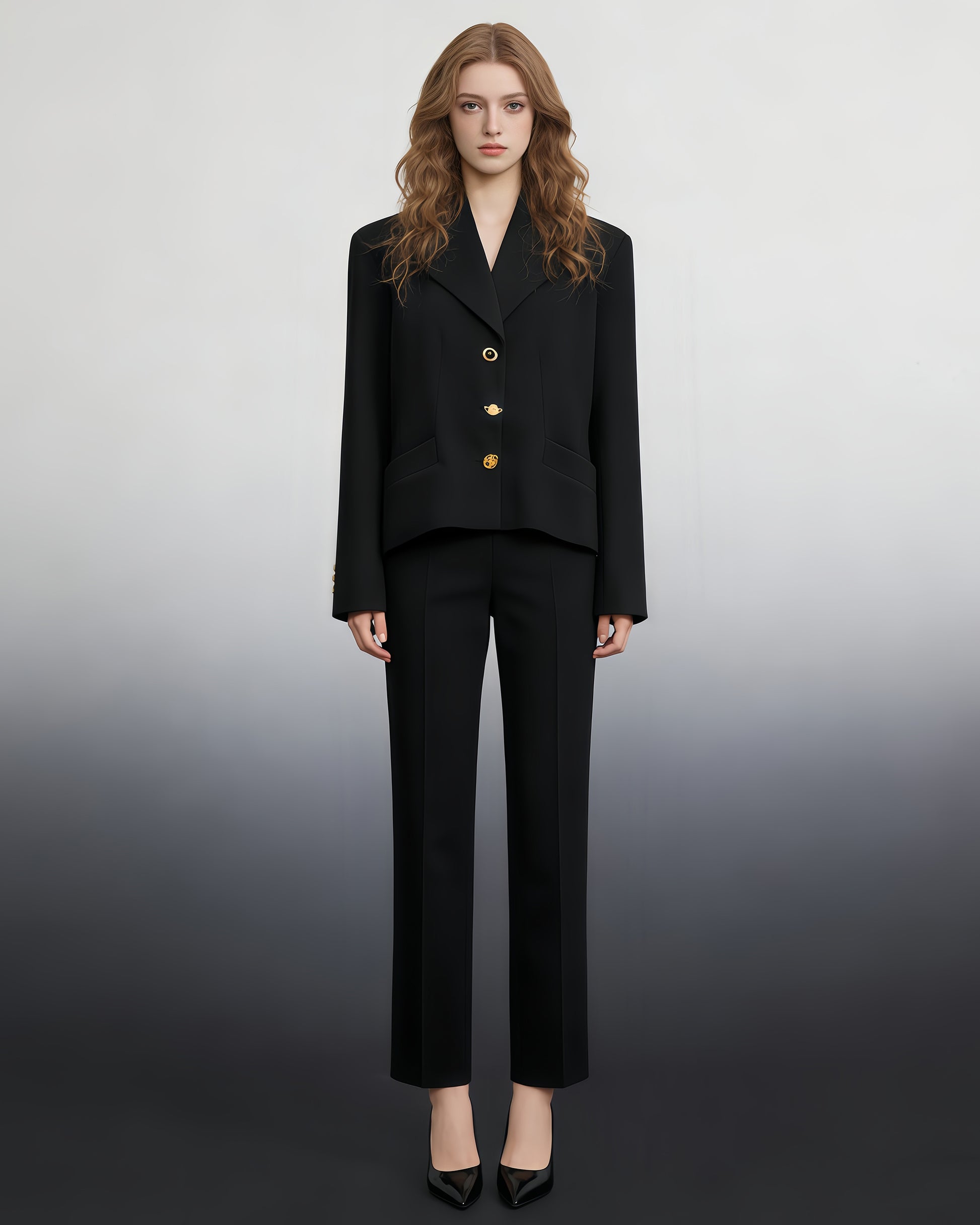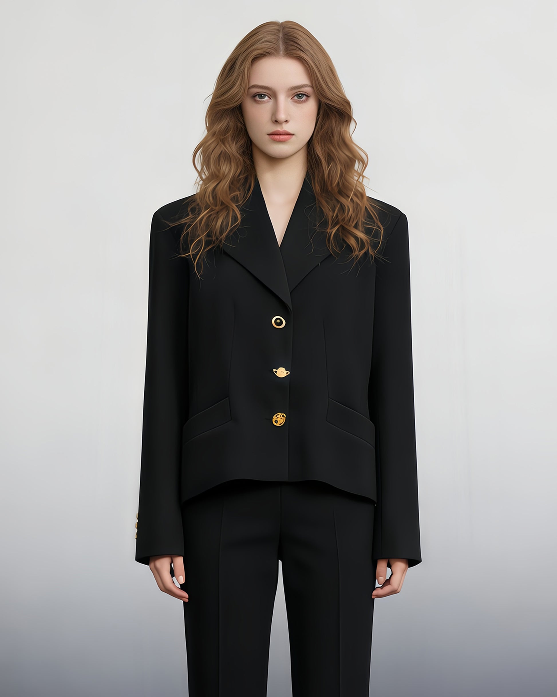 - Statement gold buttons, structured cut, creating a stylish silhouette.