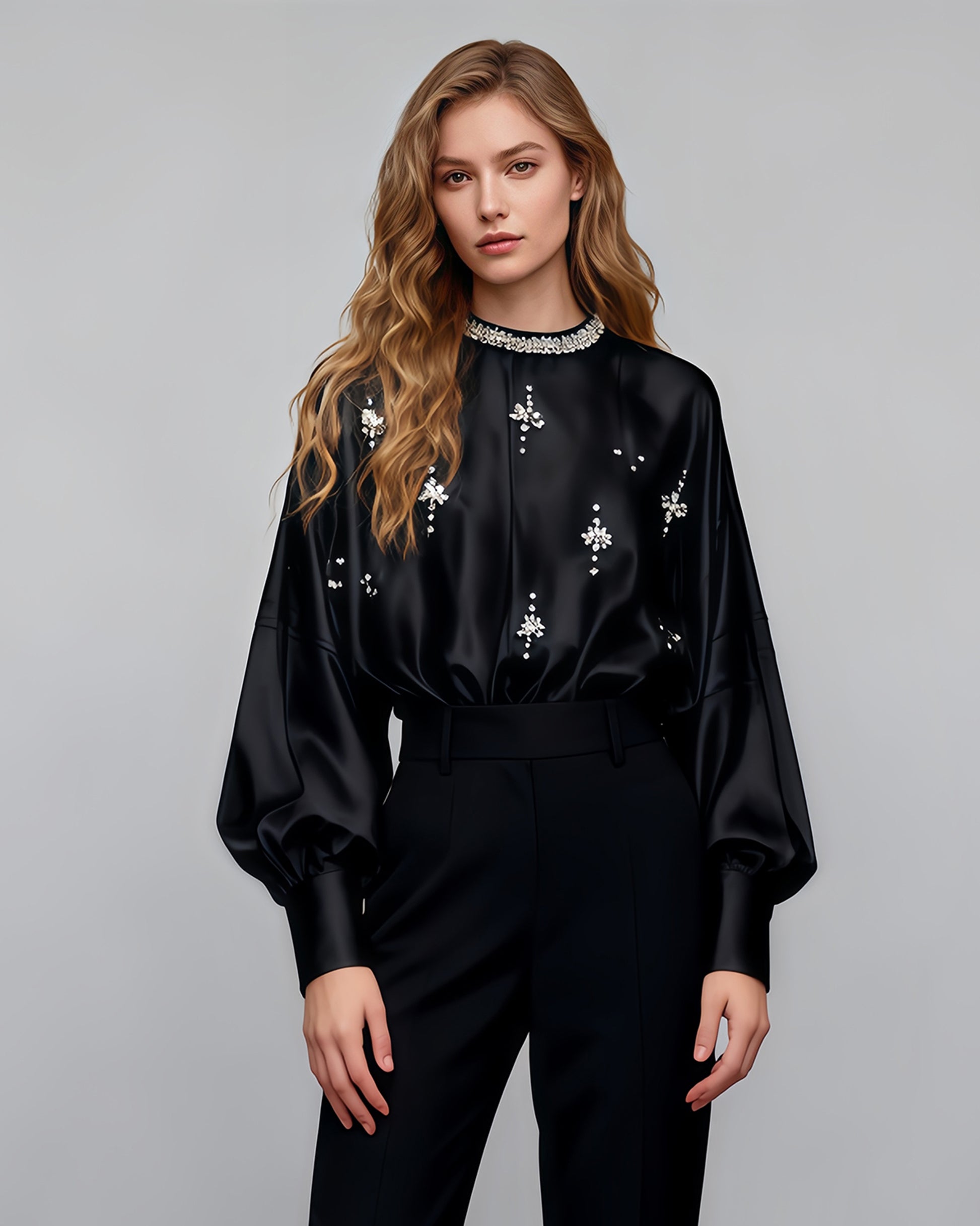Black Blouse with Rhinestone Floral & Batwing Sleeve