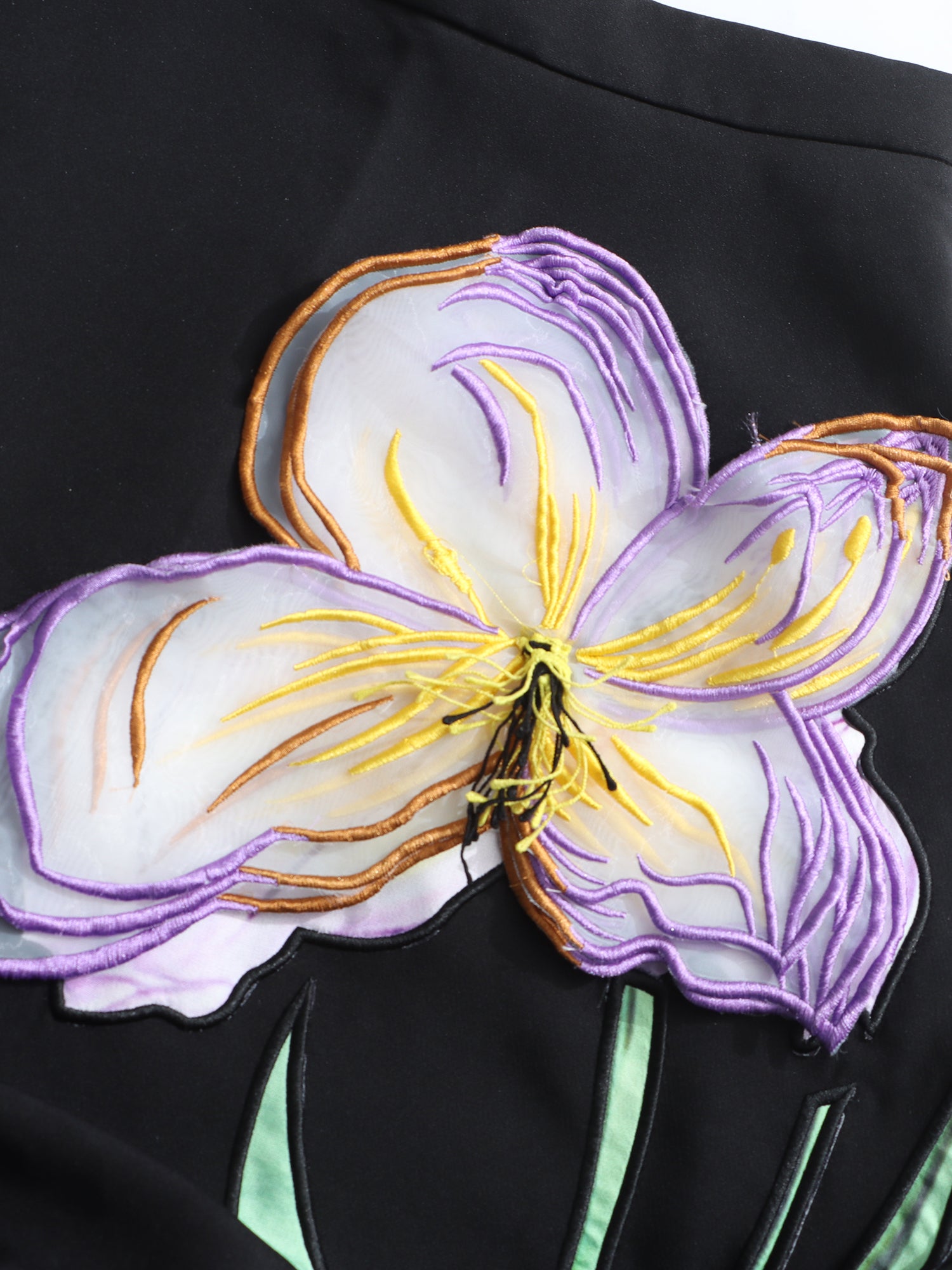 - Crop top, midi skirt, and 3D floral appliqués, creating a bold silhouette.