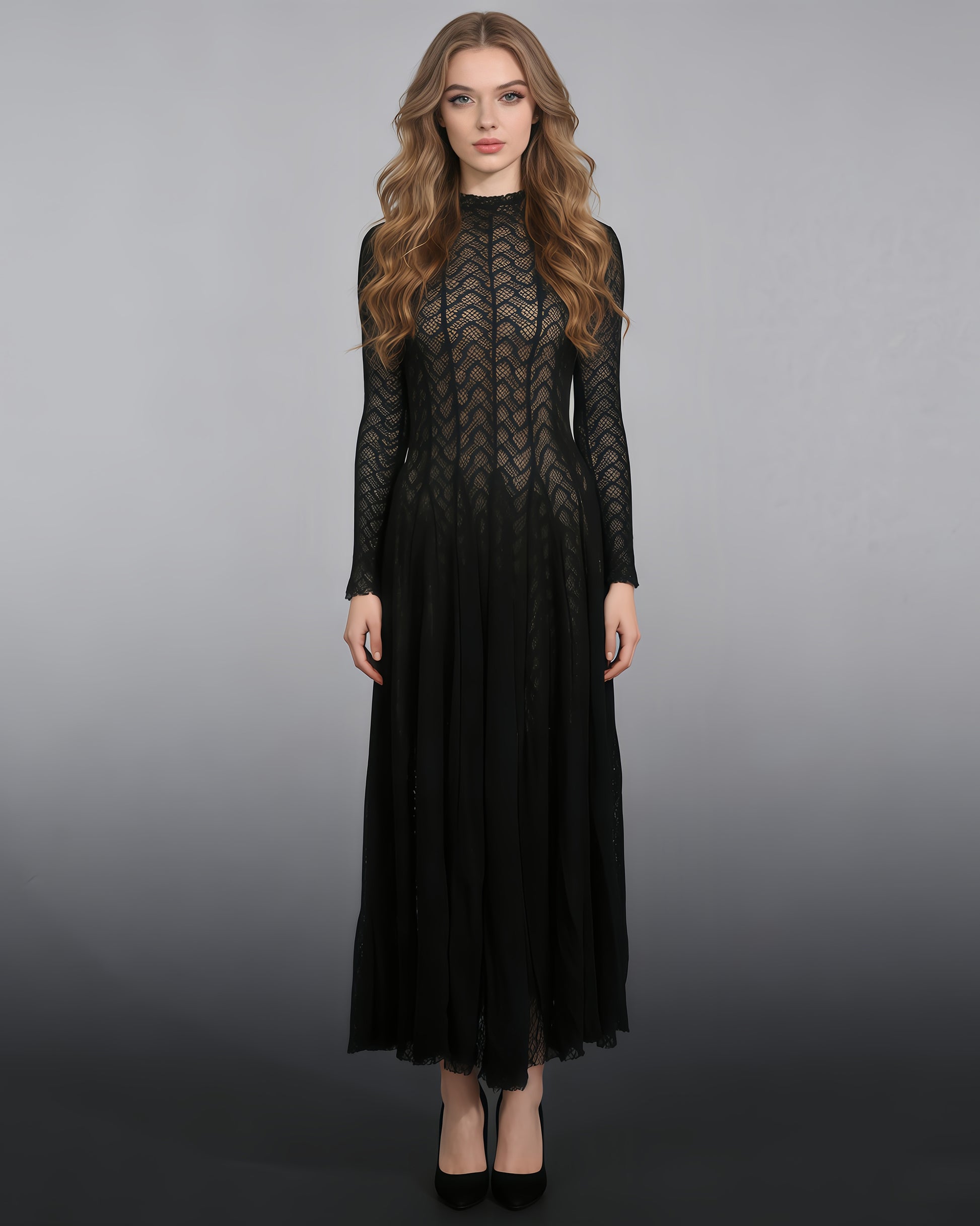 Black Lace Maxi Dress with Long Sleeve & Sheer Design