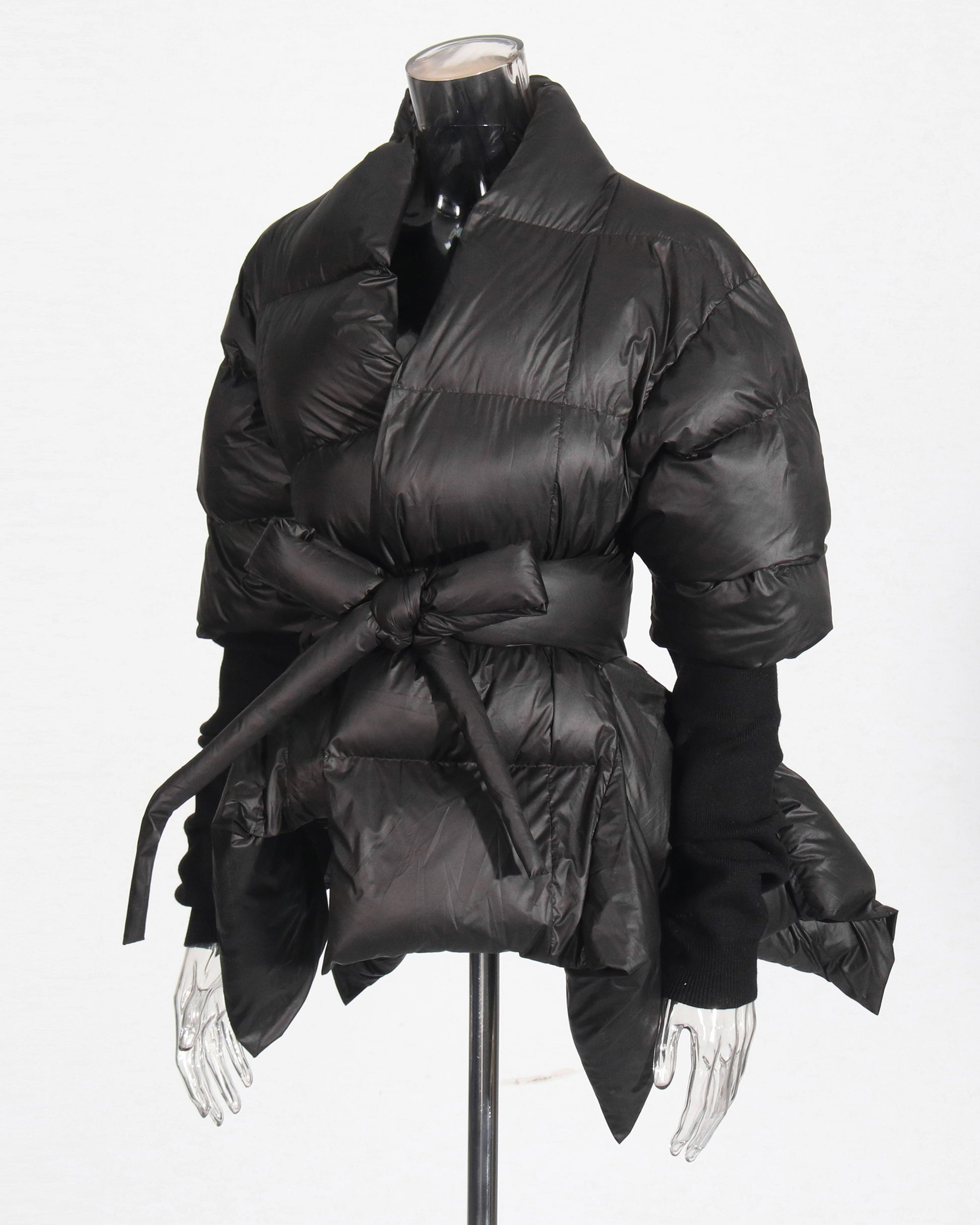 Black Puffy Wrap Puffer Jacket with Bow Tie Waist