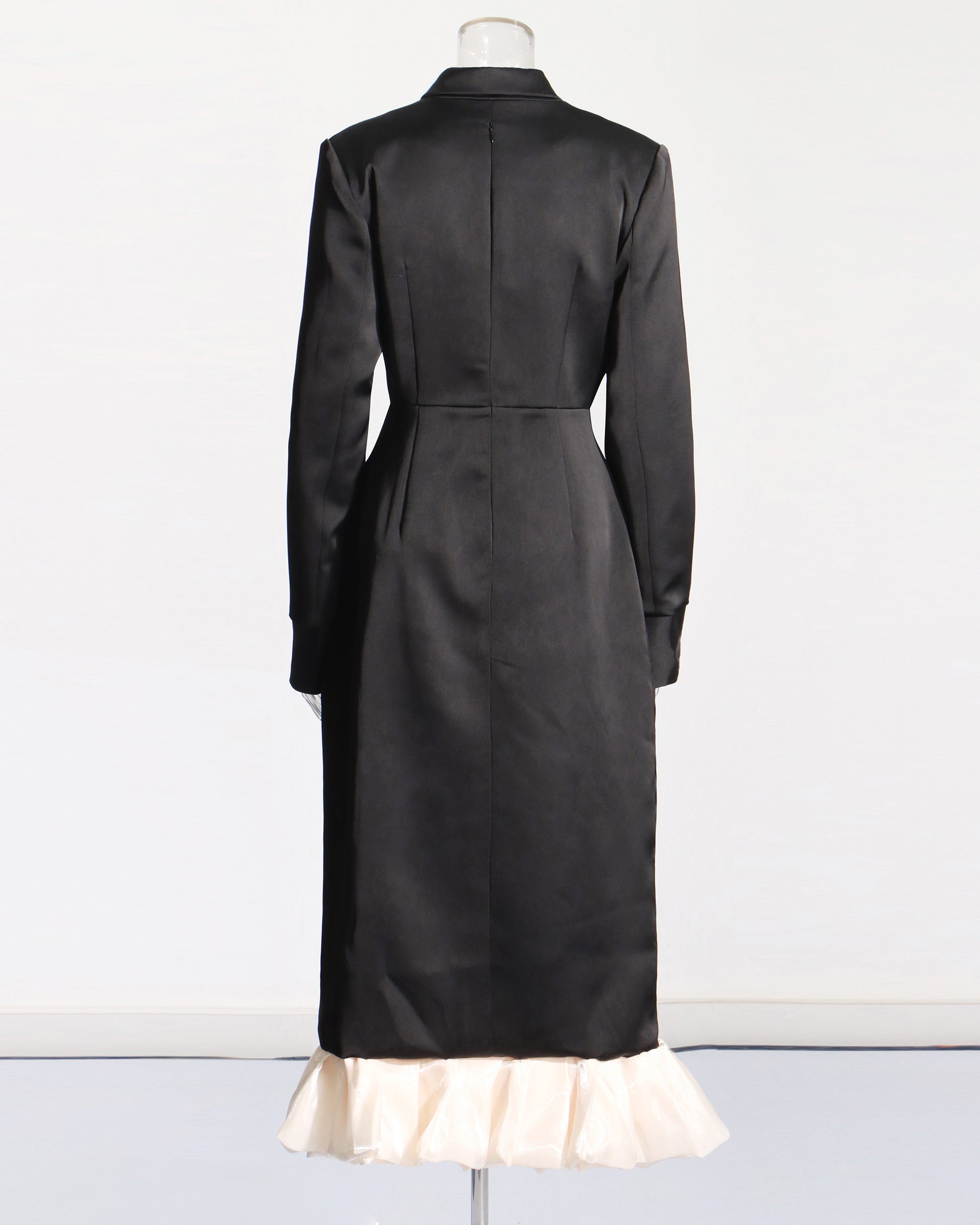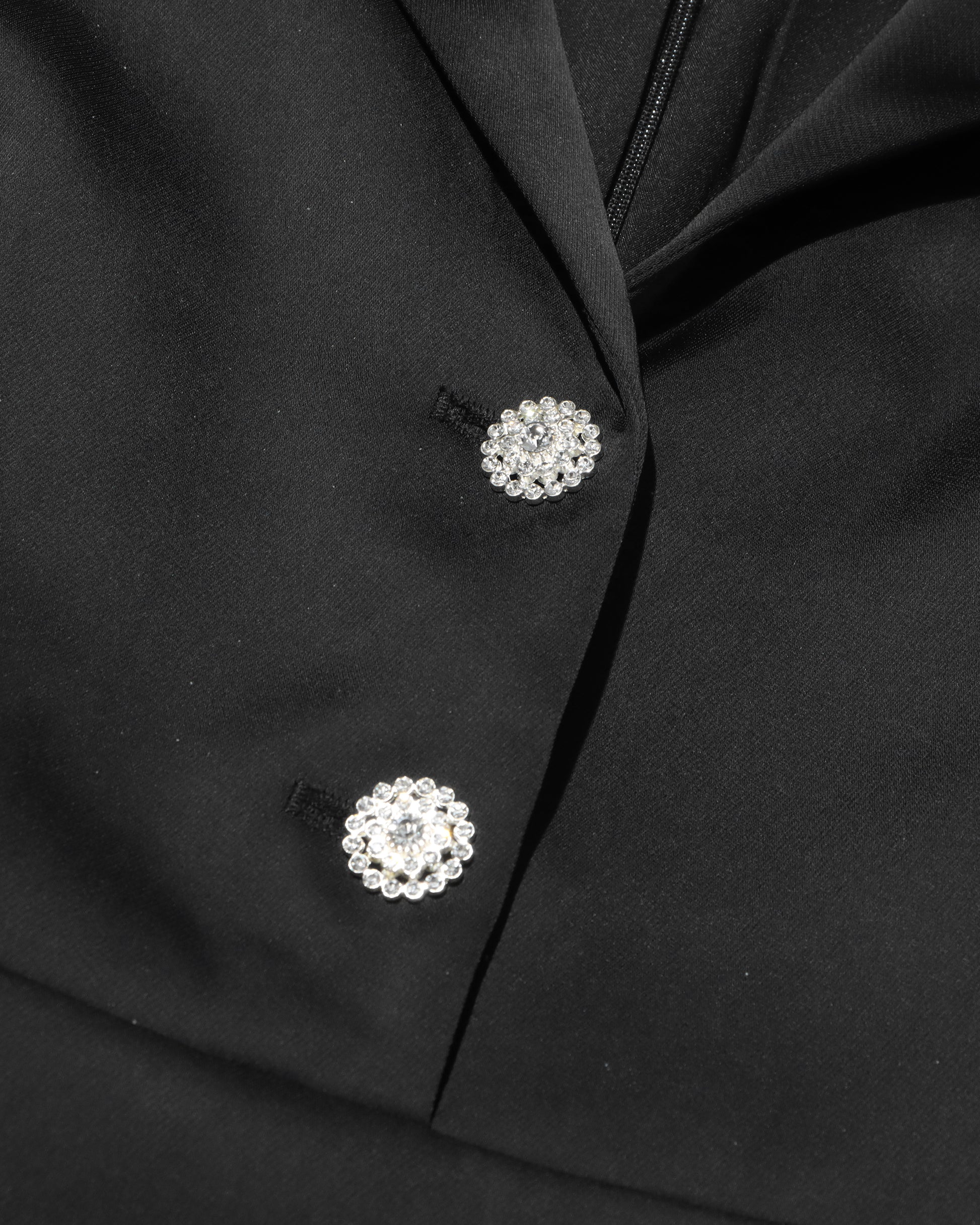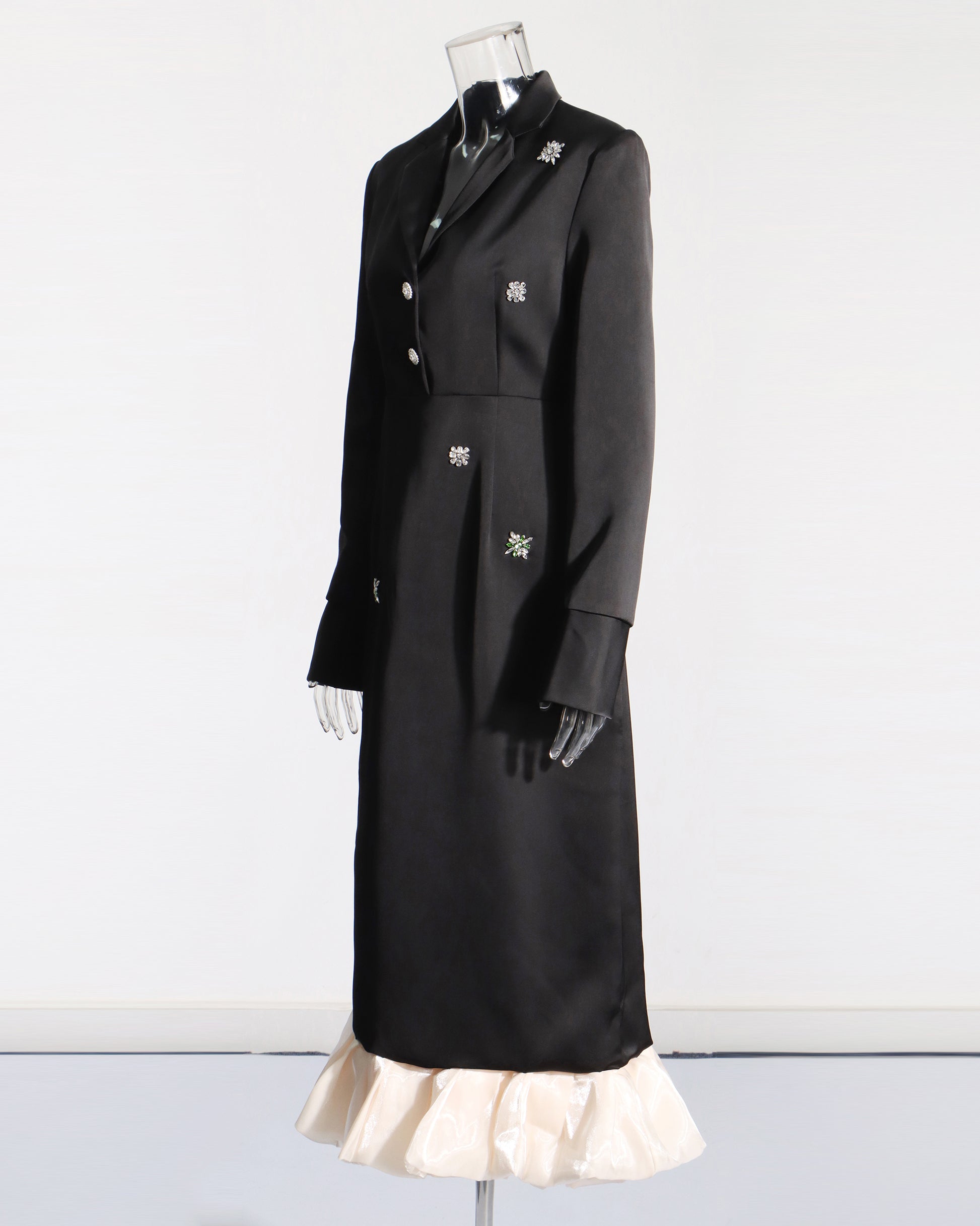 Black Satin Blazer Dress with Crystal & Ruffle Hem