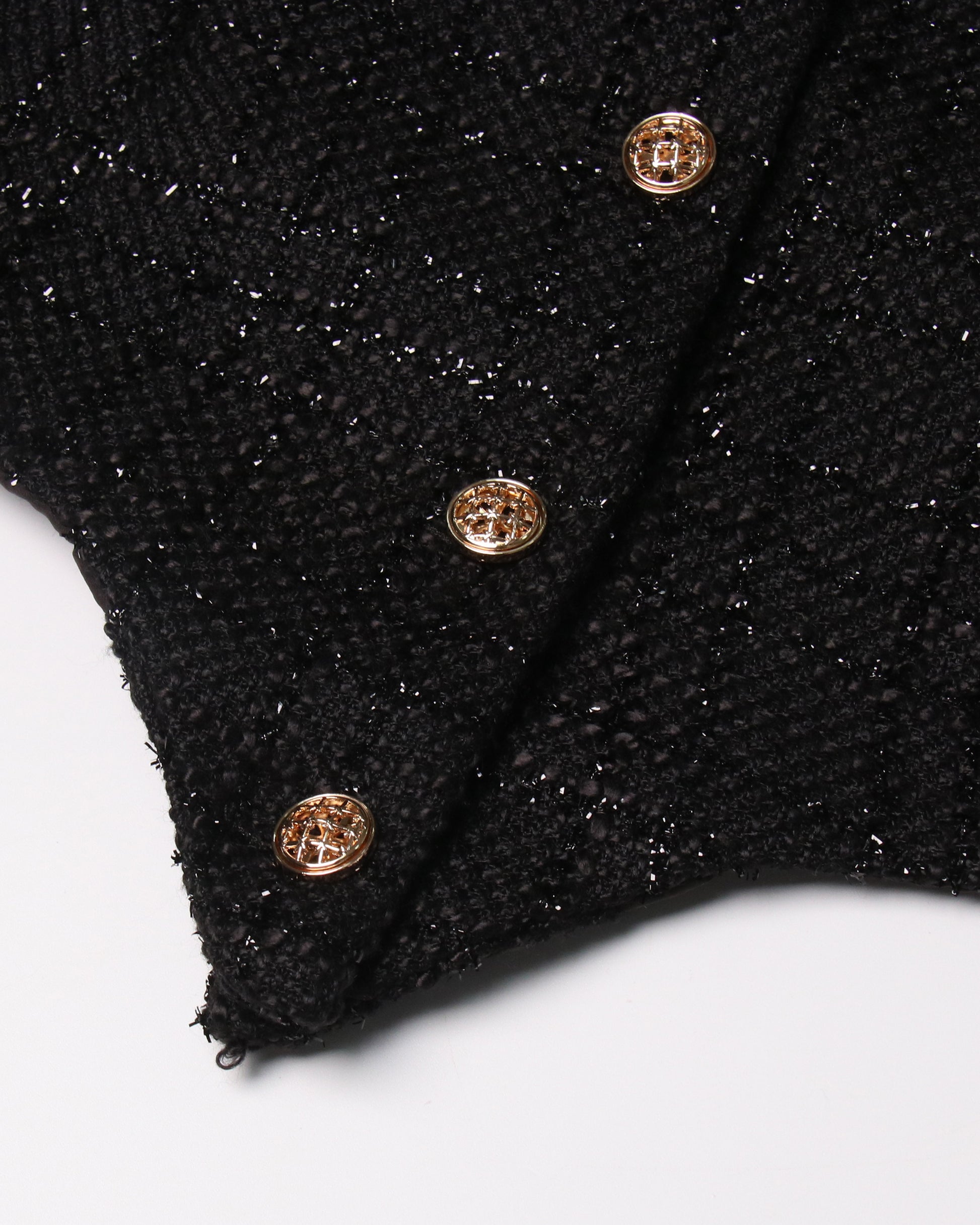 - Elegant, glamorous silhouette, blending textured fabric and feminine accents.