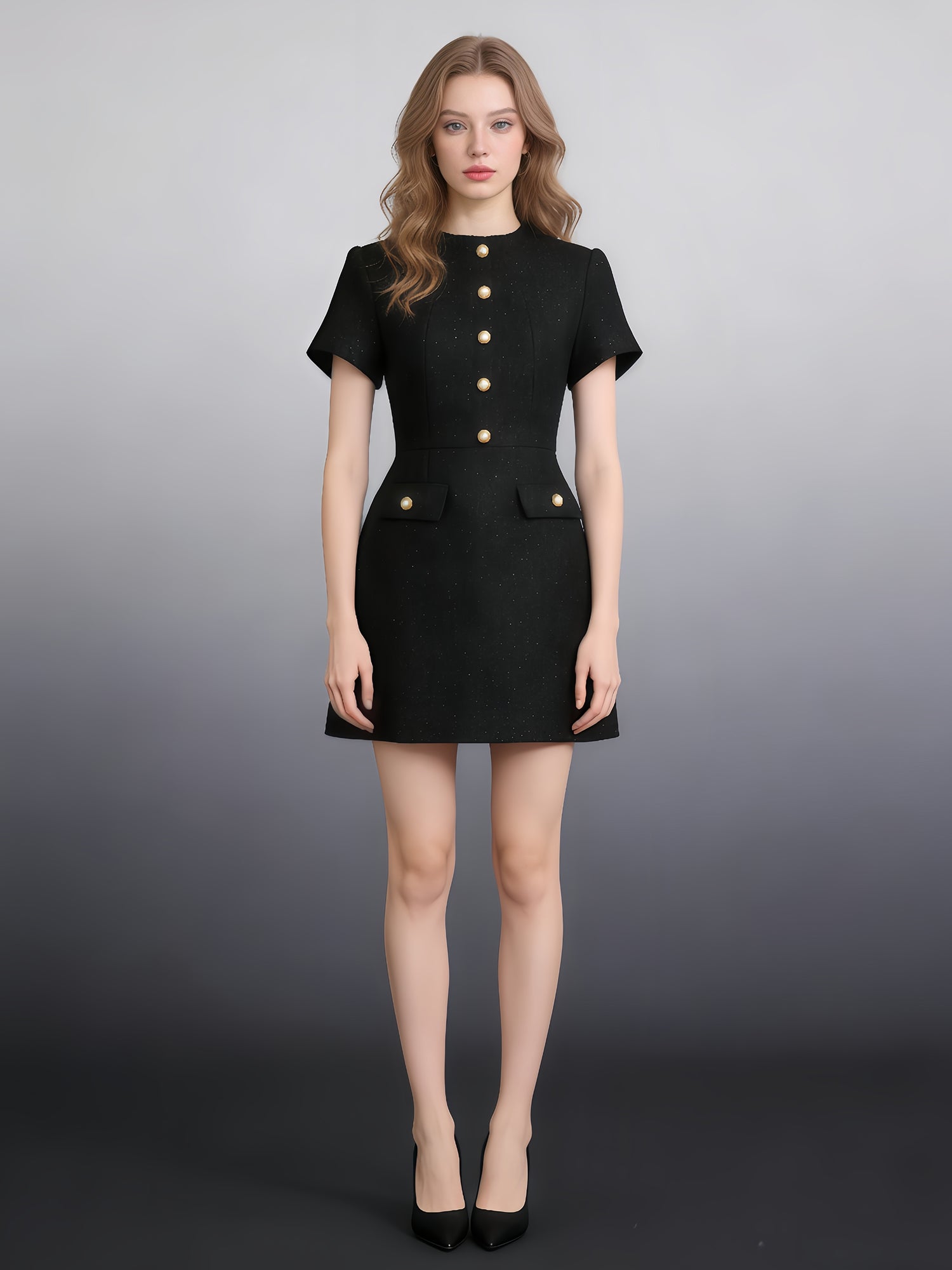 Black Tweed Mini Dress with Pearl Gold Buttons