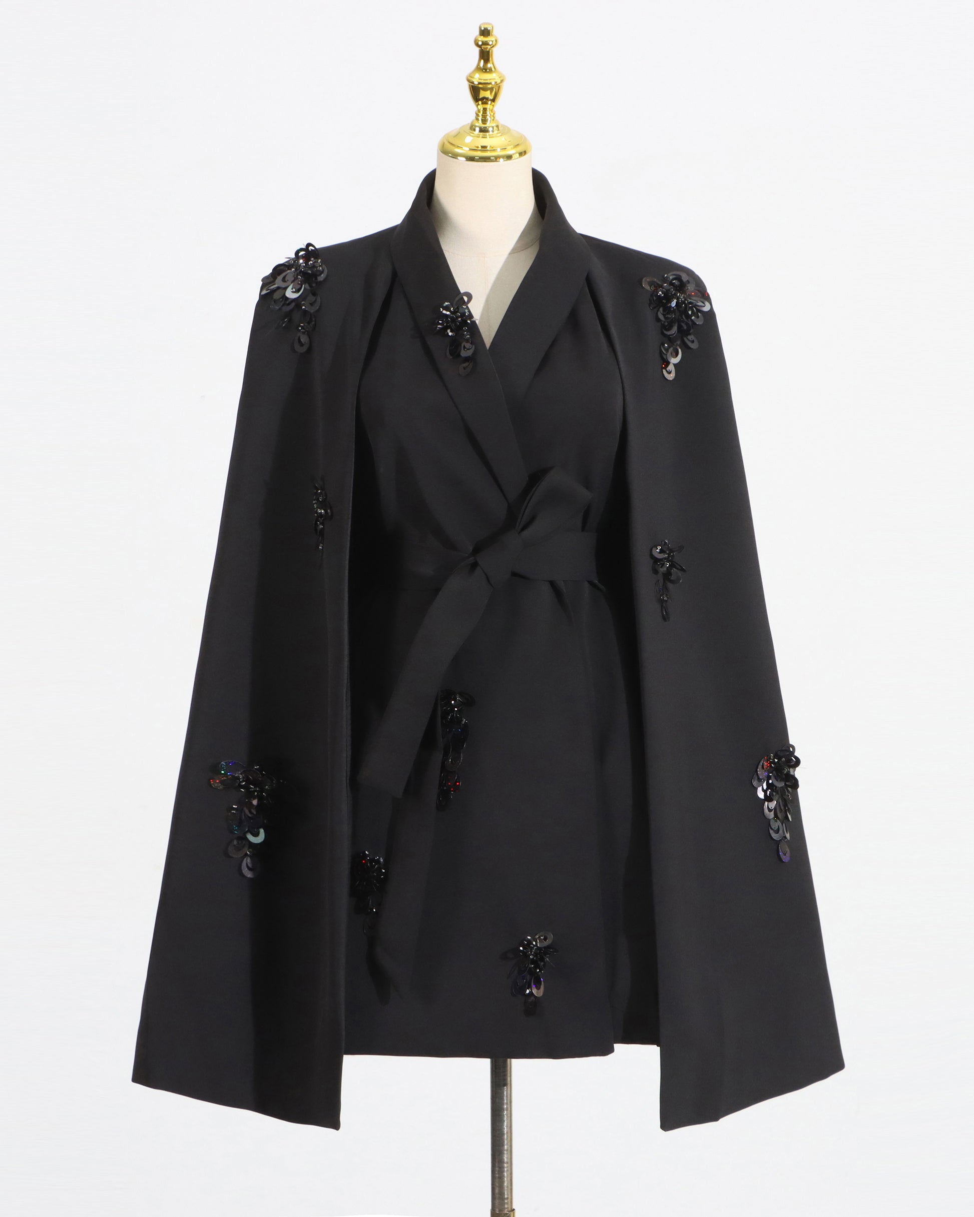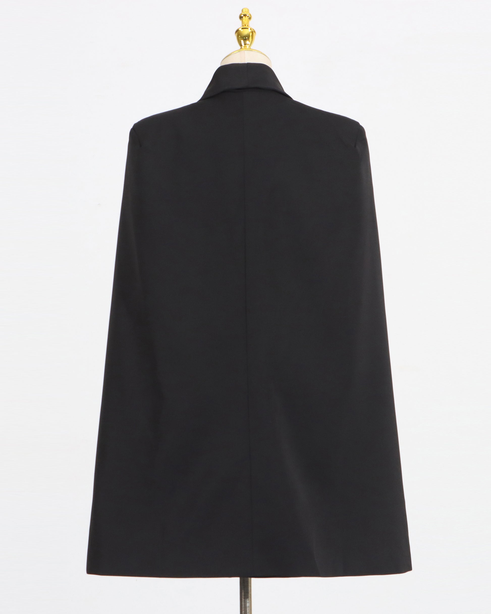 - Flowy cape silhouette, creating a bold and elegant look.