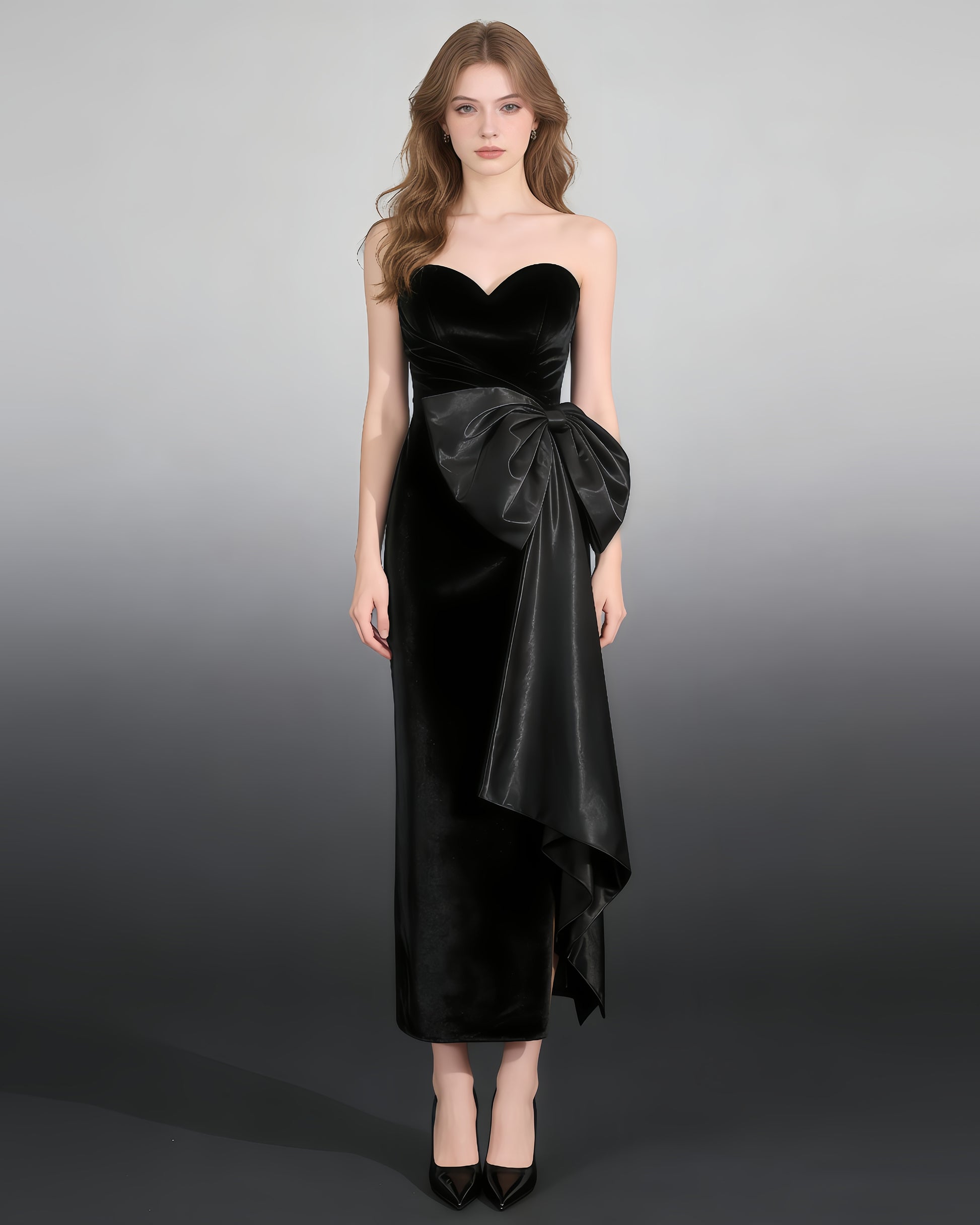 - Velvet texture, satin bow, strapless cut, creating a glamorous silhouette.