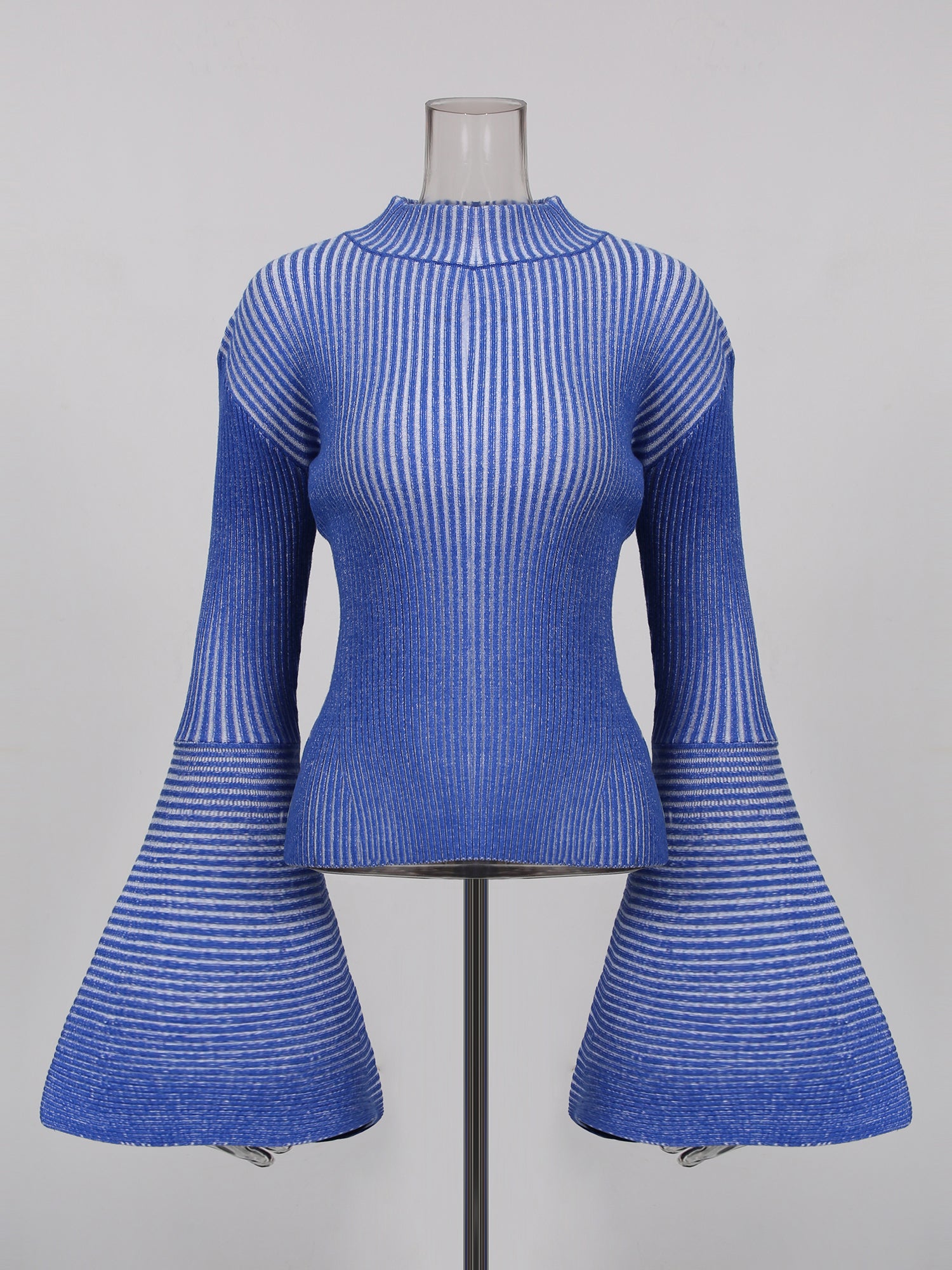 Blue Striped Knit Sweater with Bell Sleeve Detail